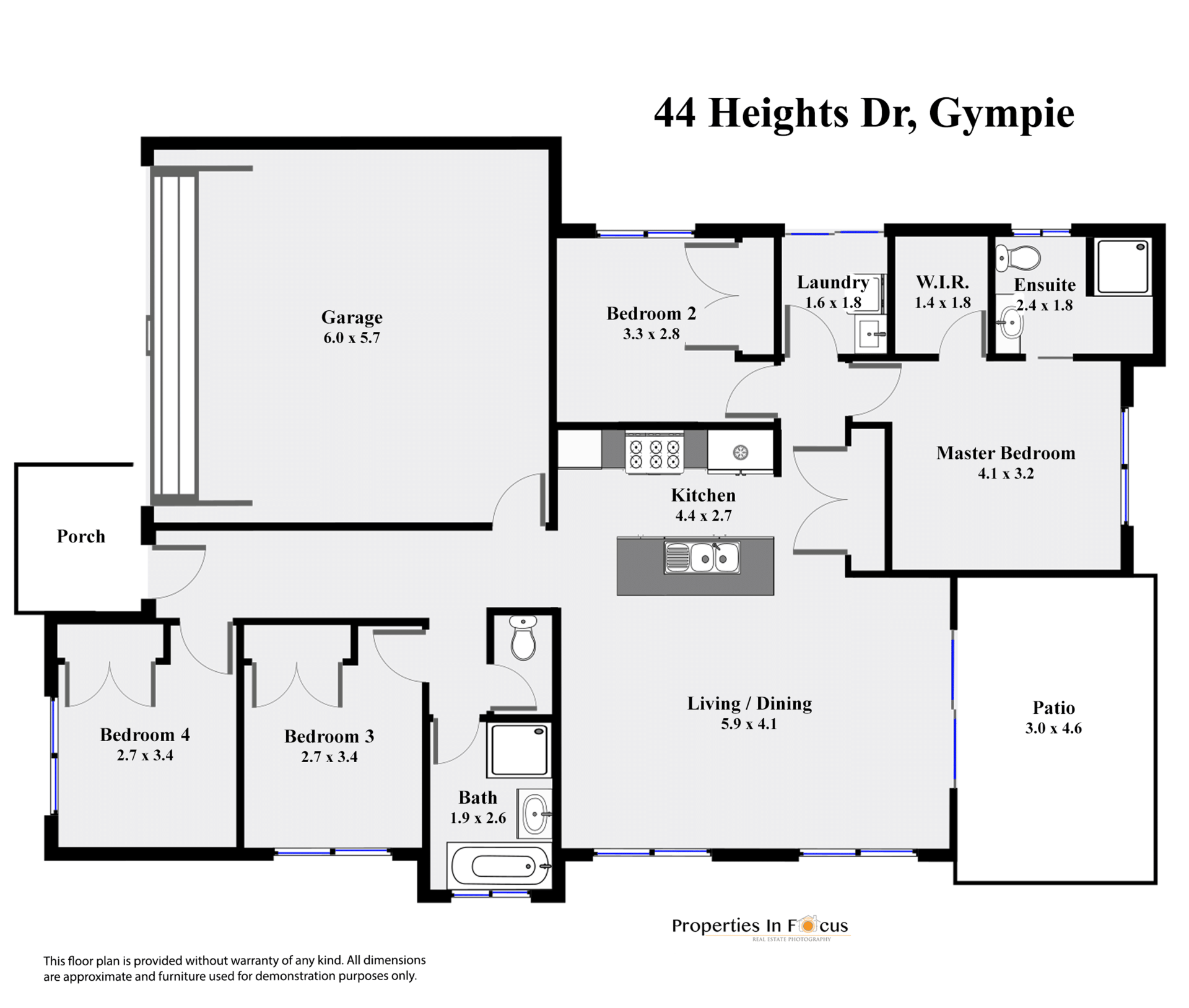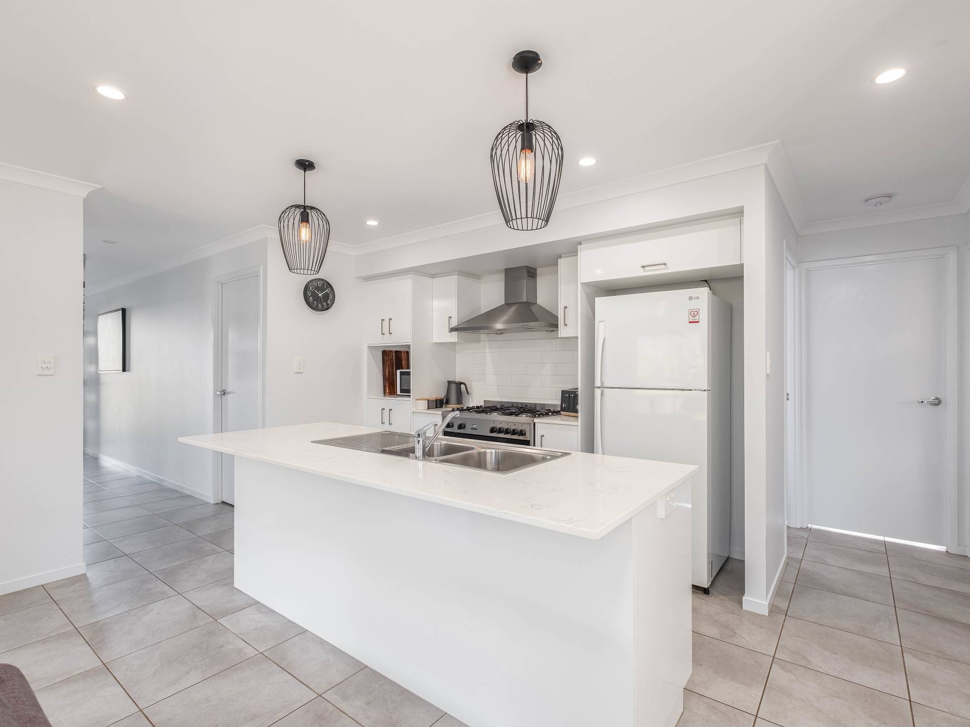 The kitchen boasts a huge island bench, 6 burner gas stove, stone bench tops, pantry, breakfast bar and overlooks the living & dining area.