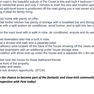 Situated on a quiet road in the beautiful suburb of Pie Creek is this well built 4 bedroom home. Set on 5 beautiful rural residential acres and only 7 minutes to town the size and location speaks for itself. This well presented split-level home is positioned off the road giving you a real sense of privacy and is a large home making it ideal for family living.