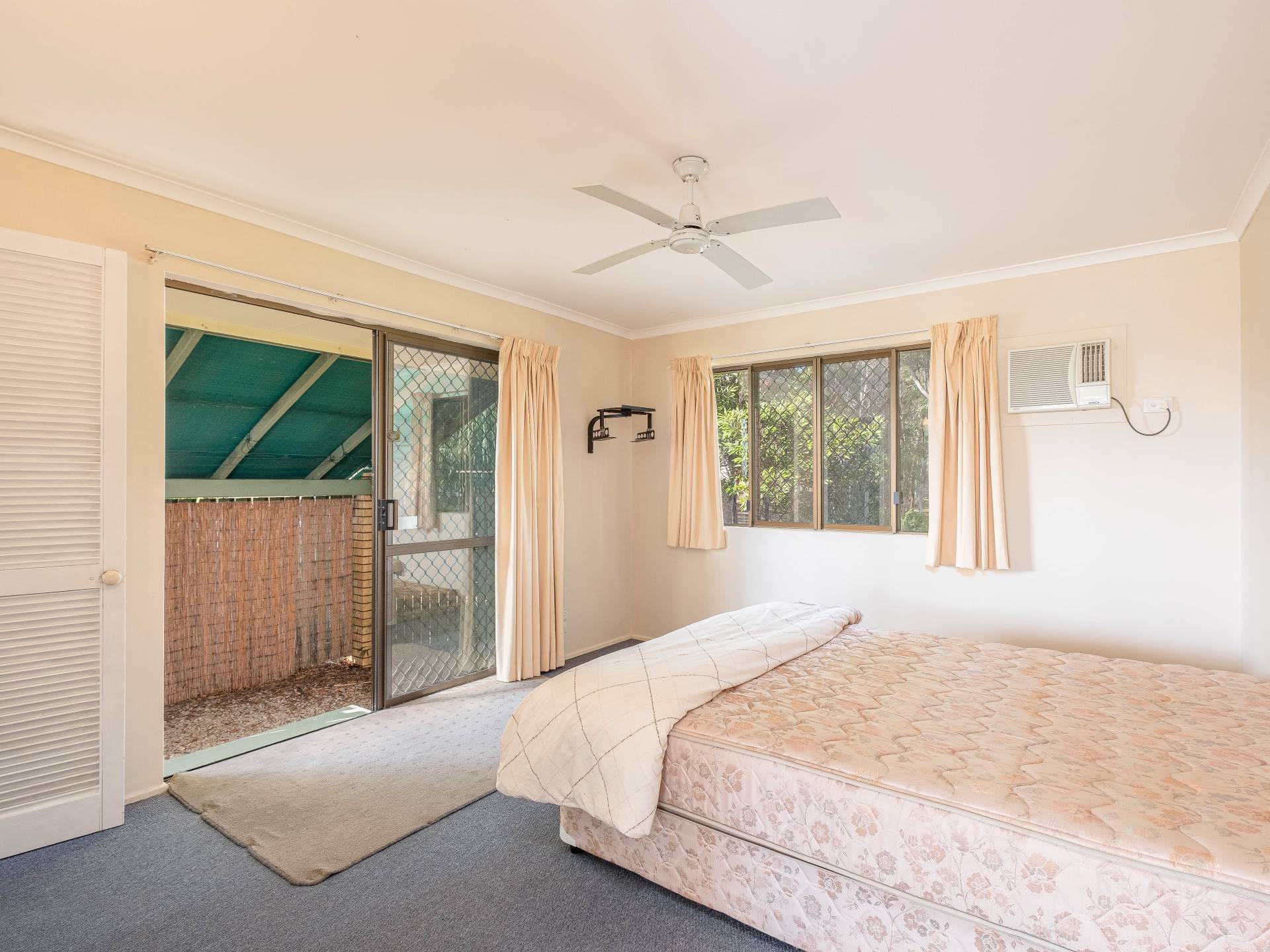 Master bedroom on the main level with a walk in robe, air conditioner, ensuite and its own covered outdoor area.