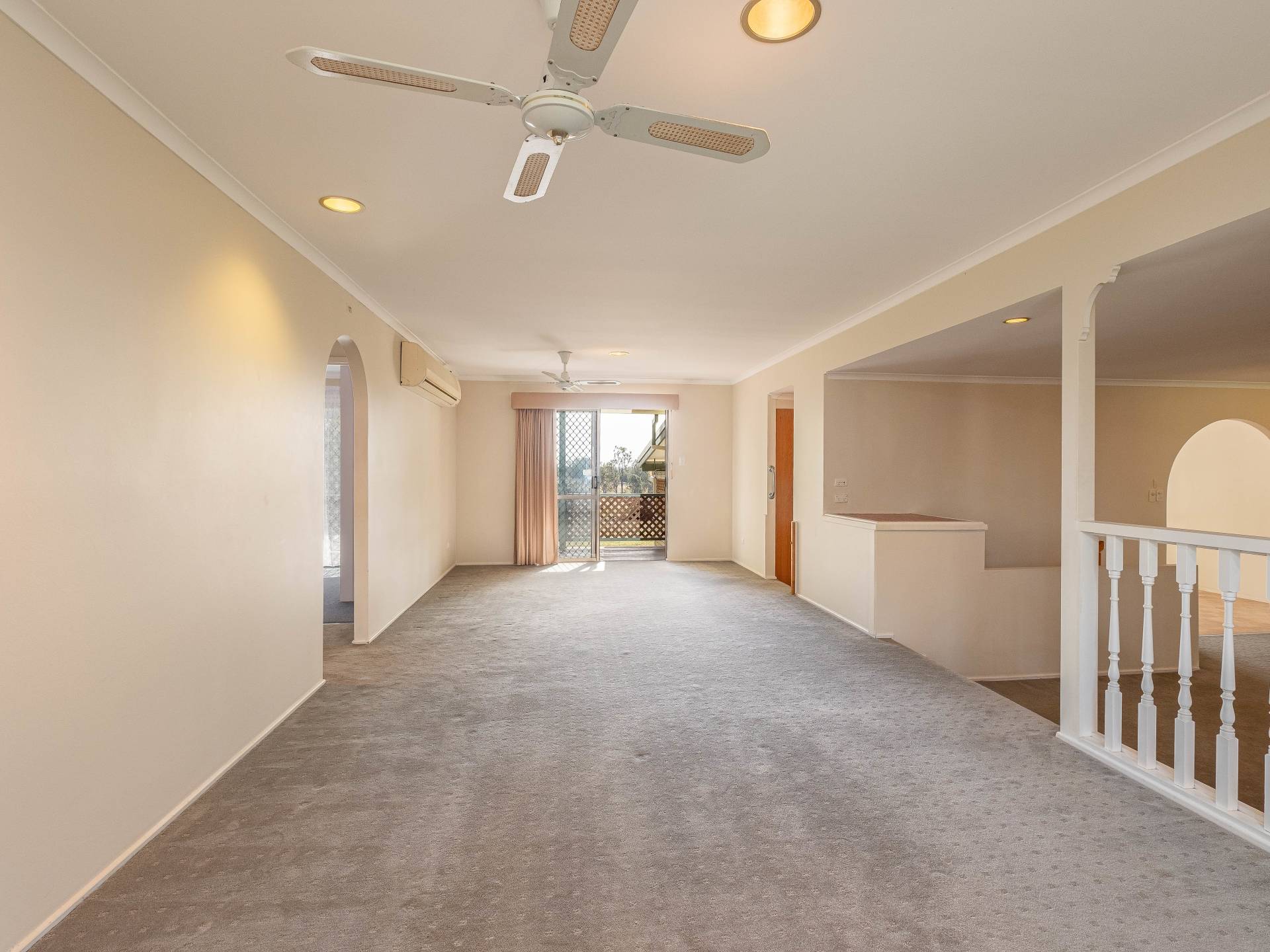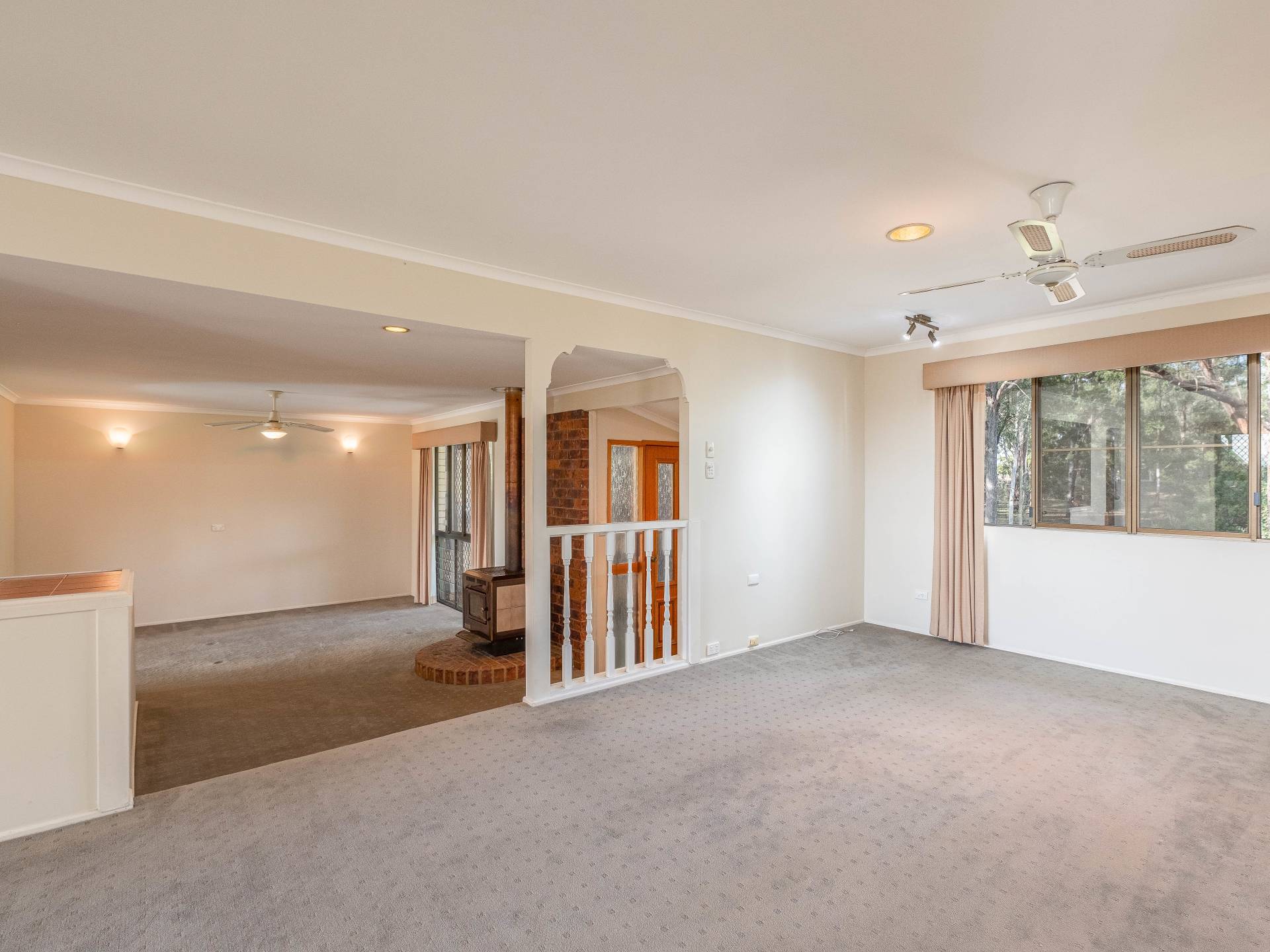 Living area is huge with a split system air conditioner, wood burner, and is split into two portions for multiple uses.