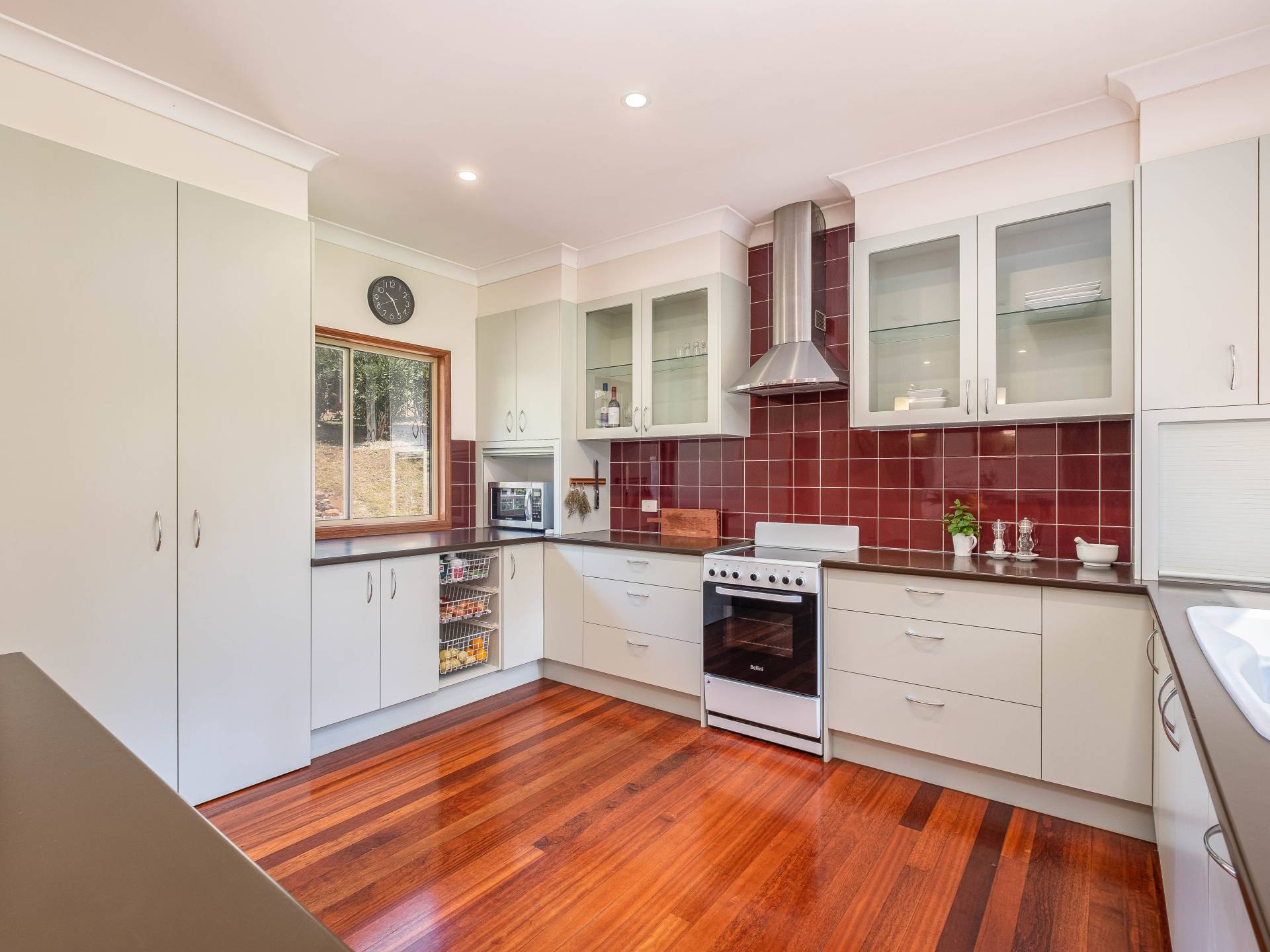 The kitchen has a large island benchtop, gas appliances and plenty of storage.