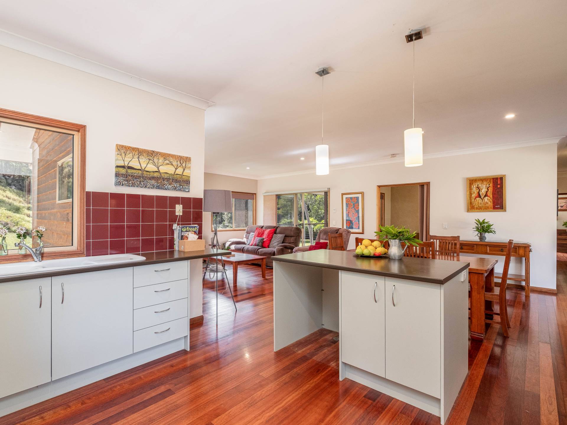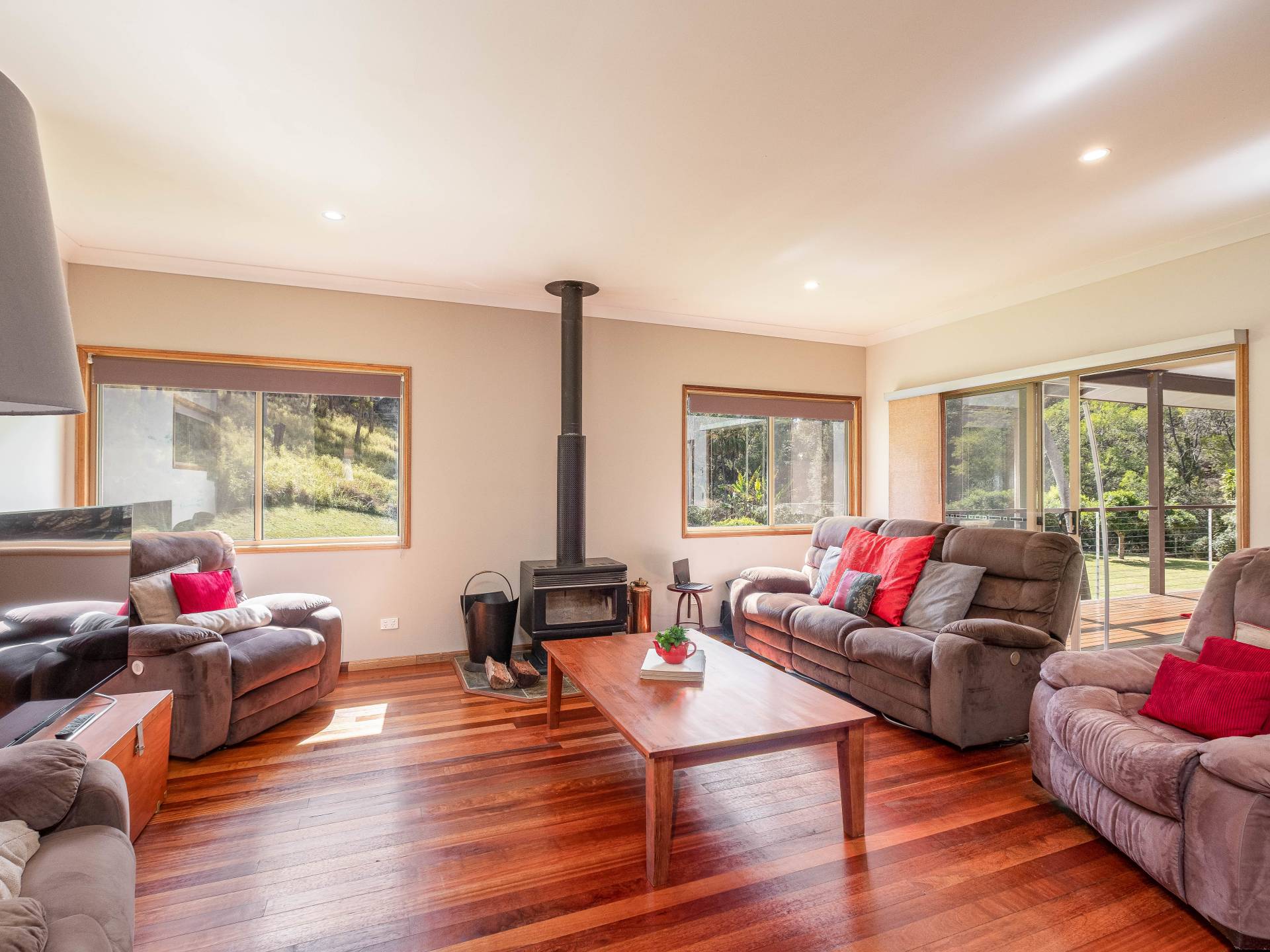 The open plan living and dining area boasts hardwood floors, a wood burner and doors to the balcony overlooking the gardens and forest.