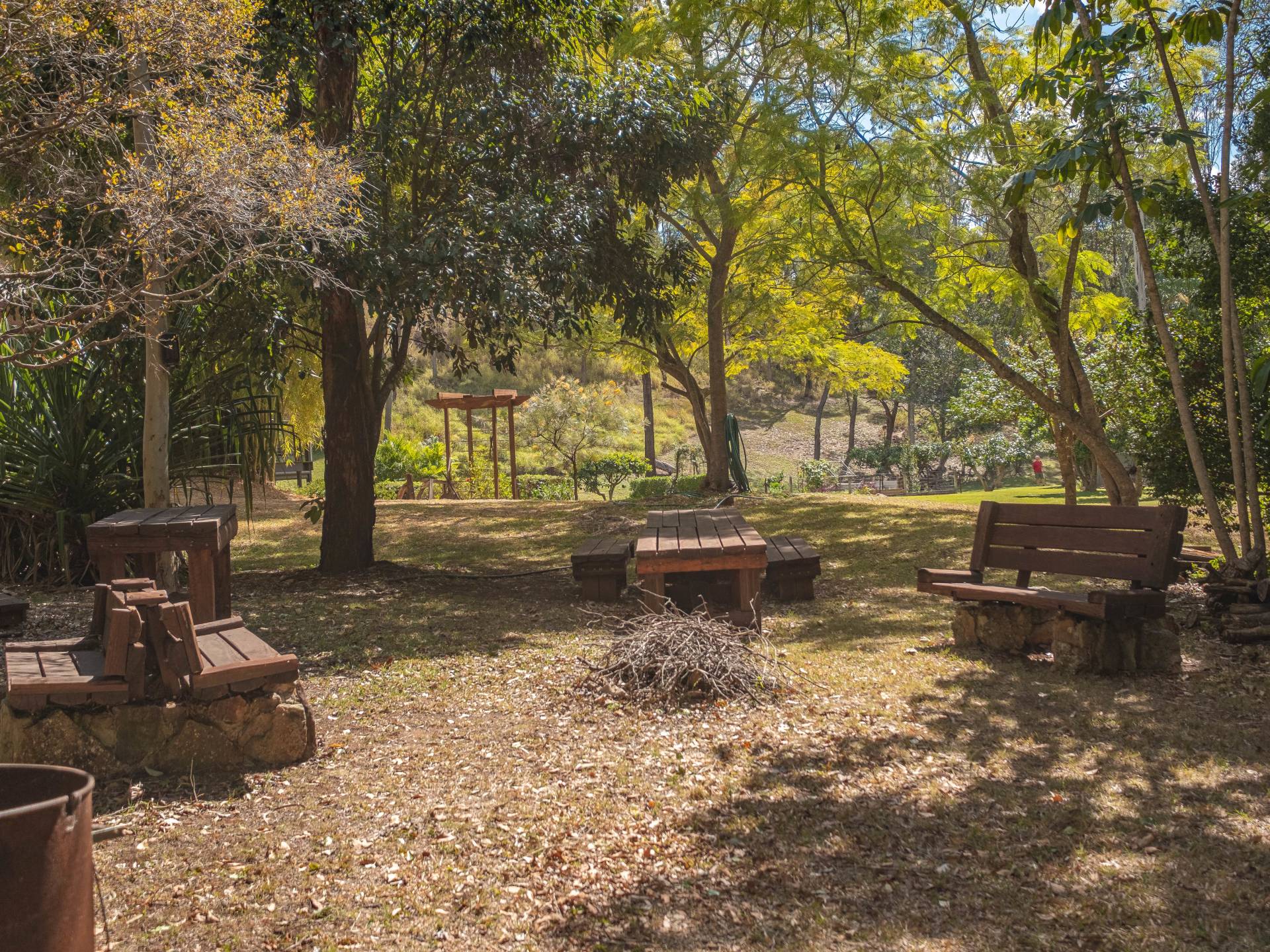 Relax beside the creek in the log hut with a couch for comfort, or sit at the many seating areas including picnic tables and benches scattered throughout the property.