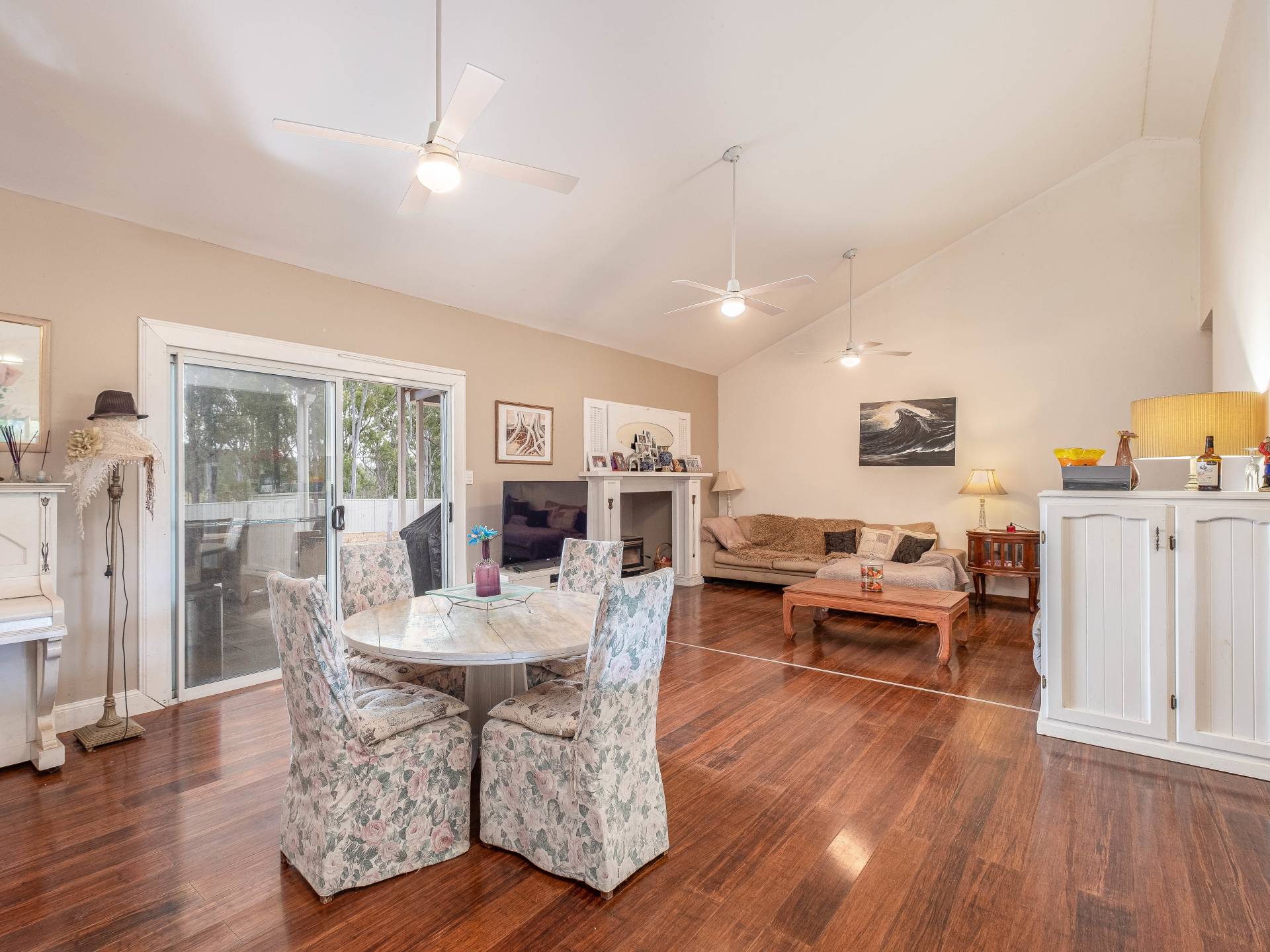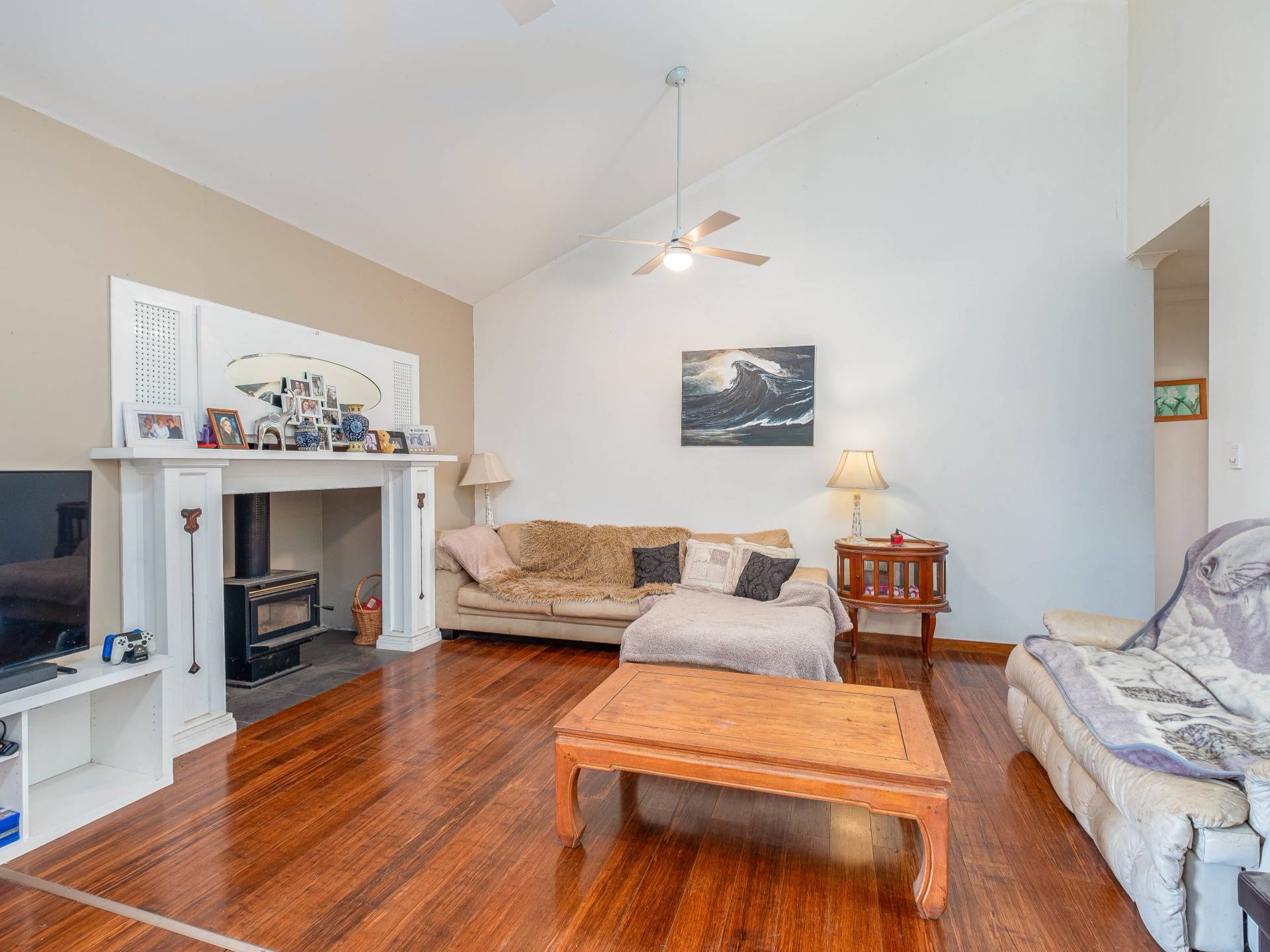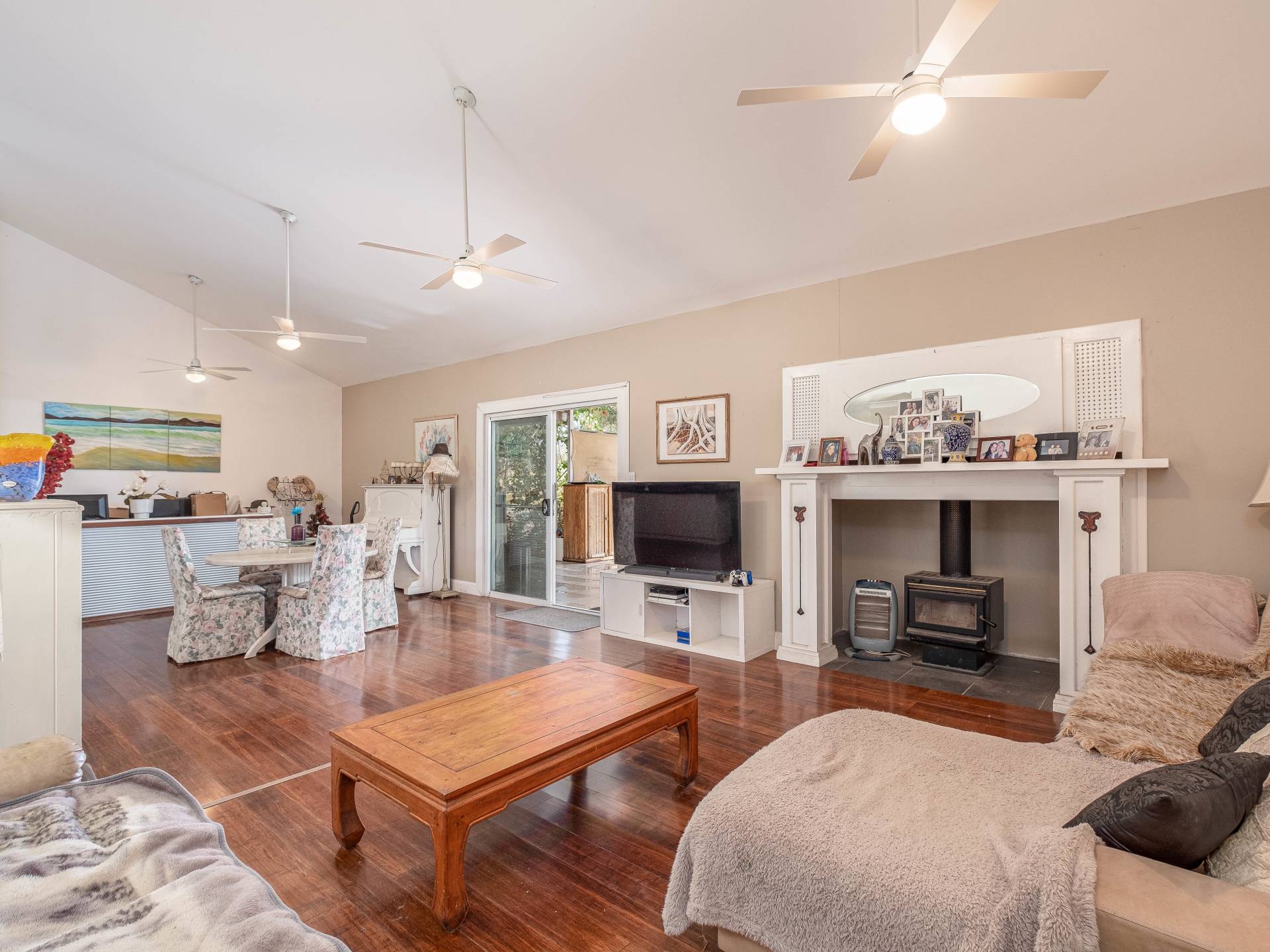 Main living, dining and kitchen have bamboo flooring, high raked ceilings and a wood burner.