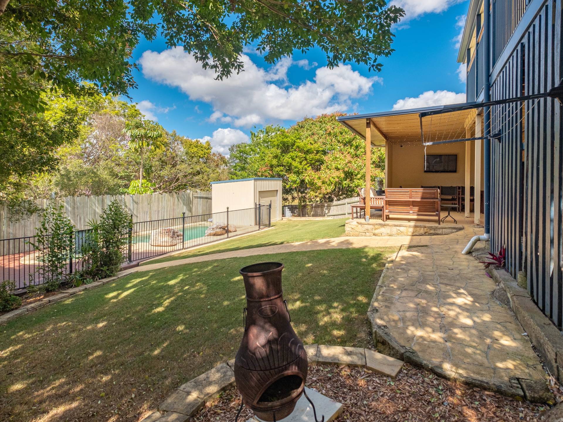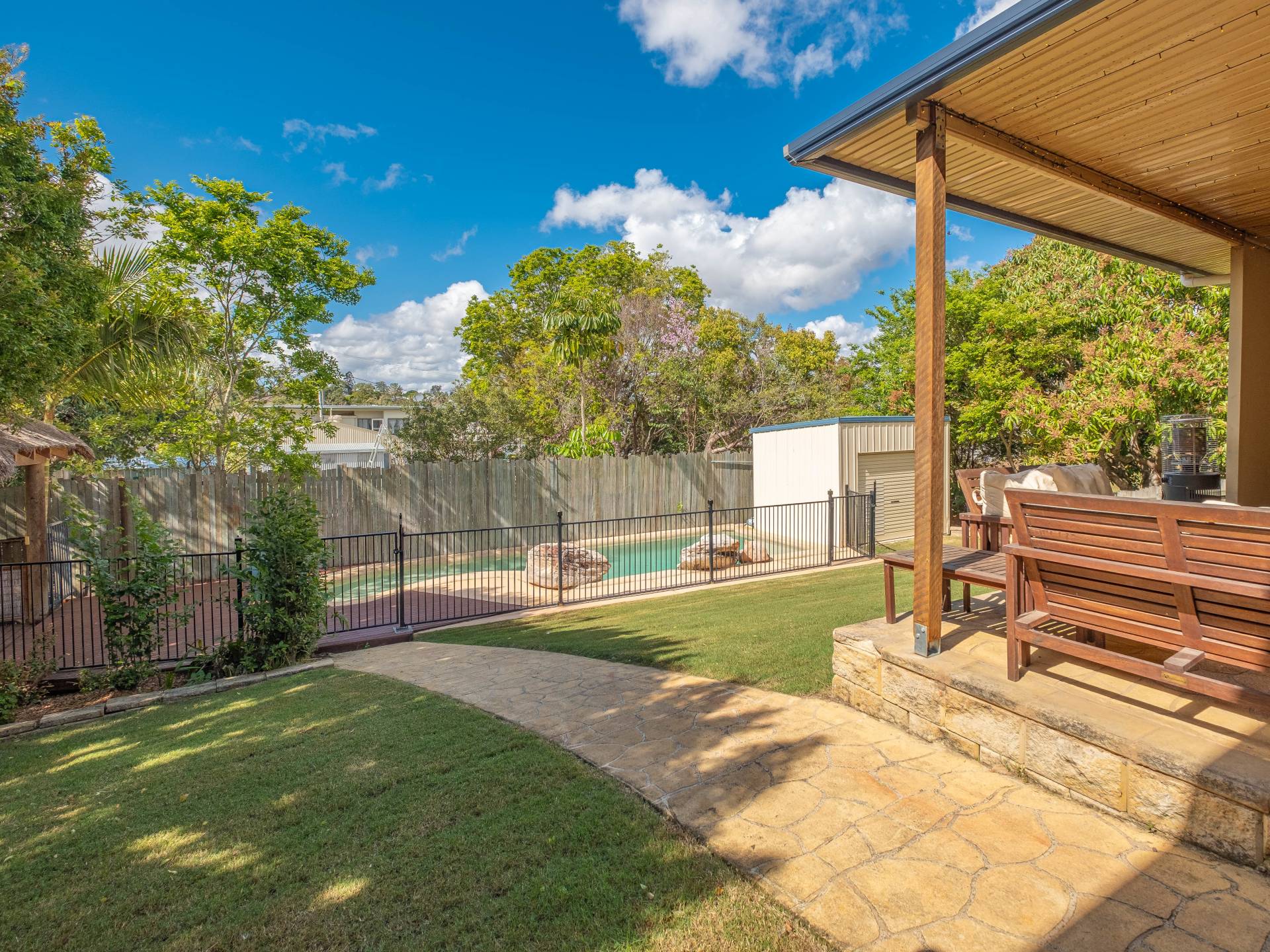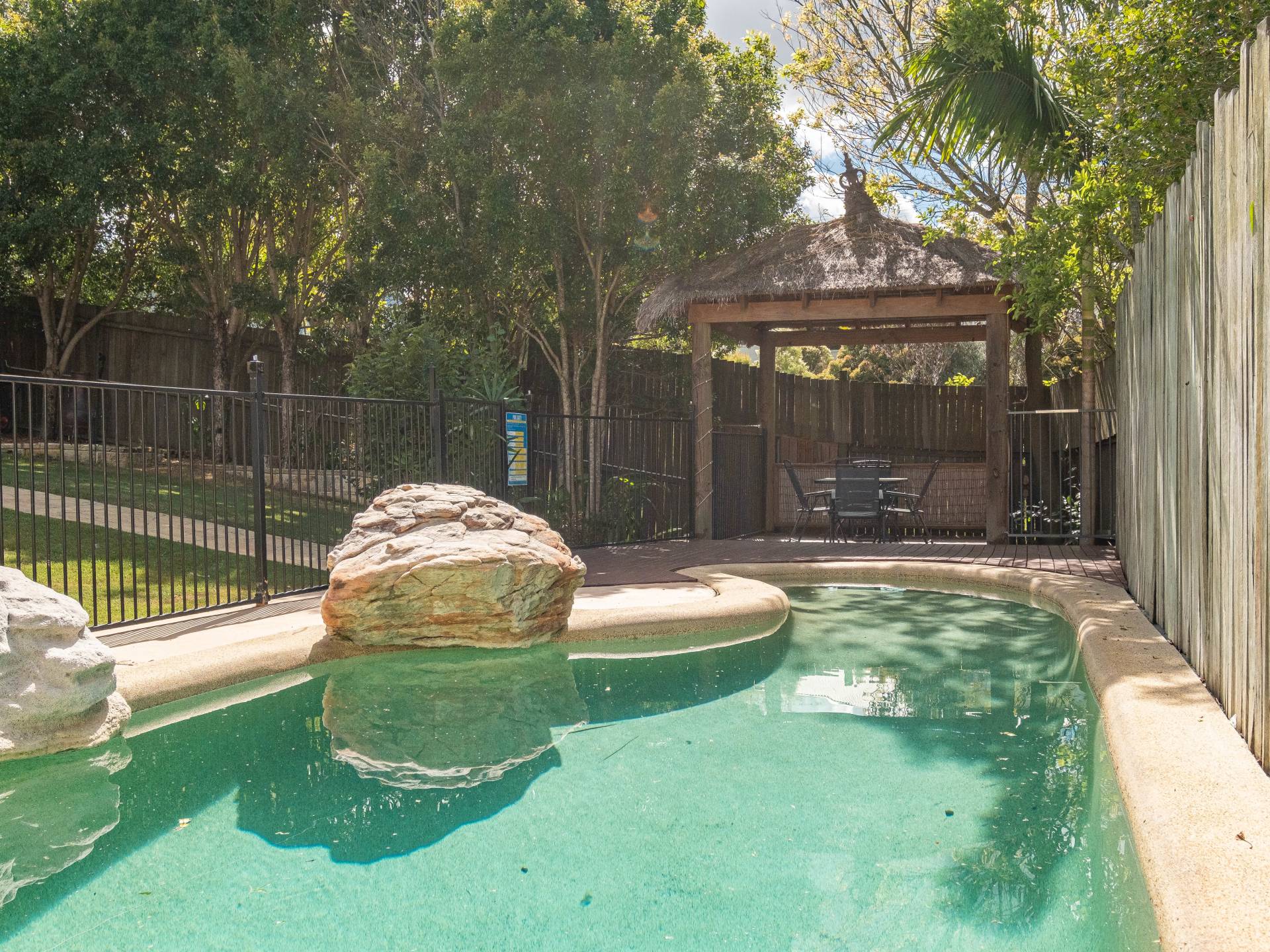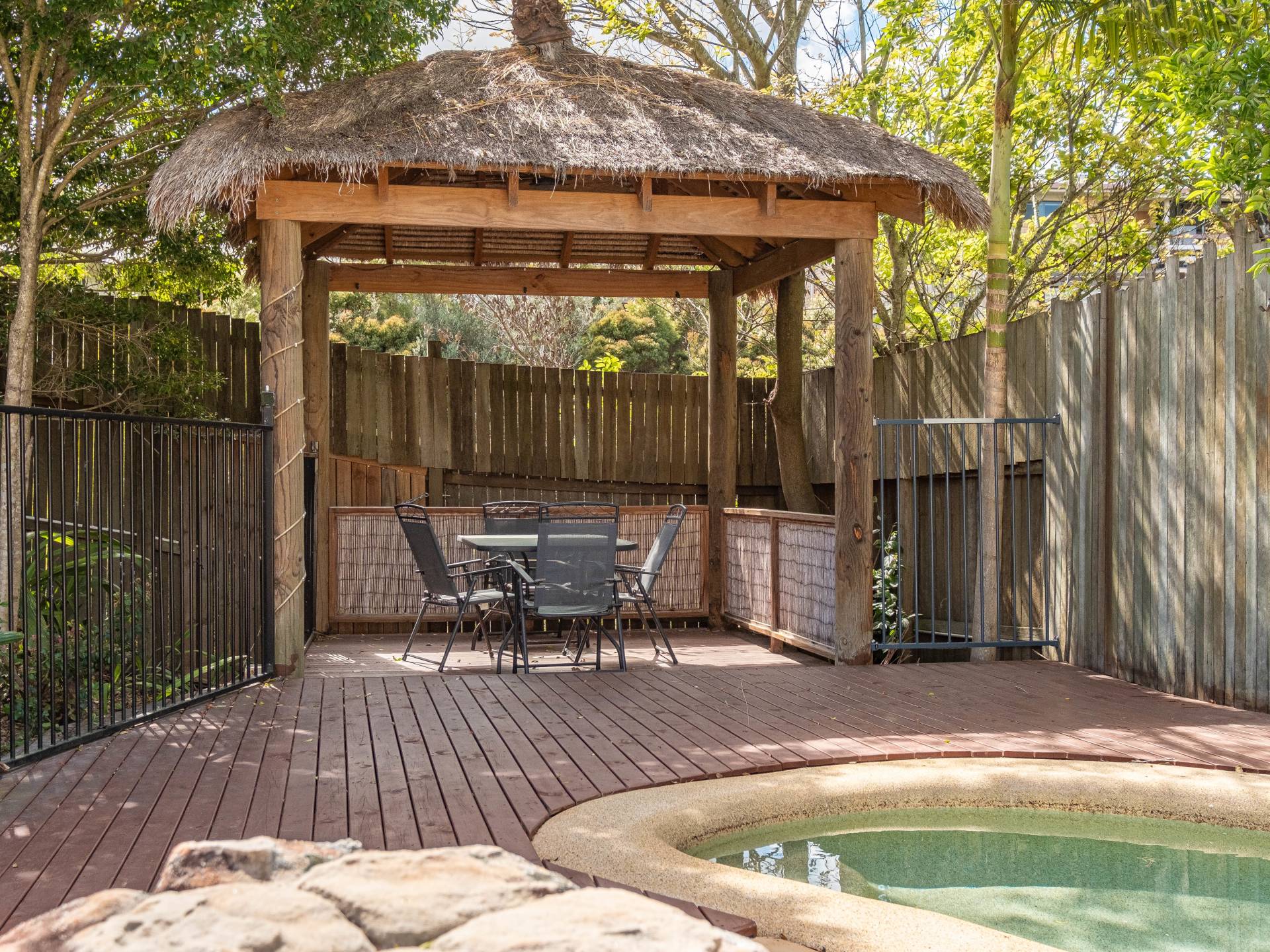 The outdoor entertainment area is private and large allowing for a feeling of living in your own oasis. The pool has a Bali hut and is ideally located at the back of the yard still allowing for a large area for the kids or pets.