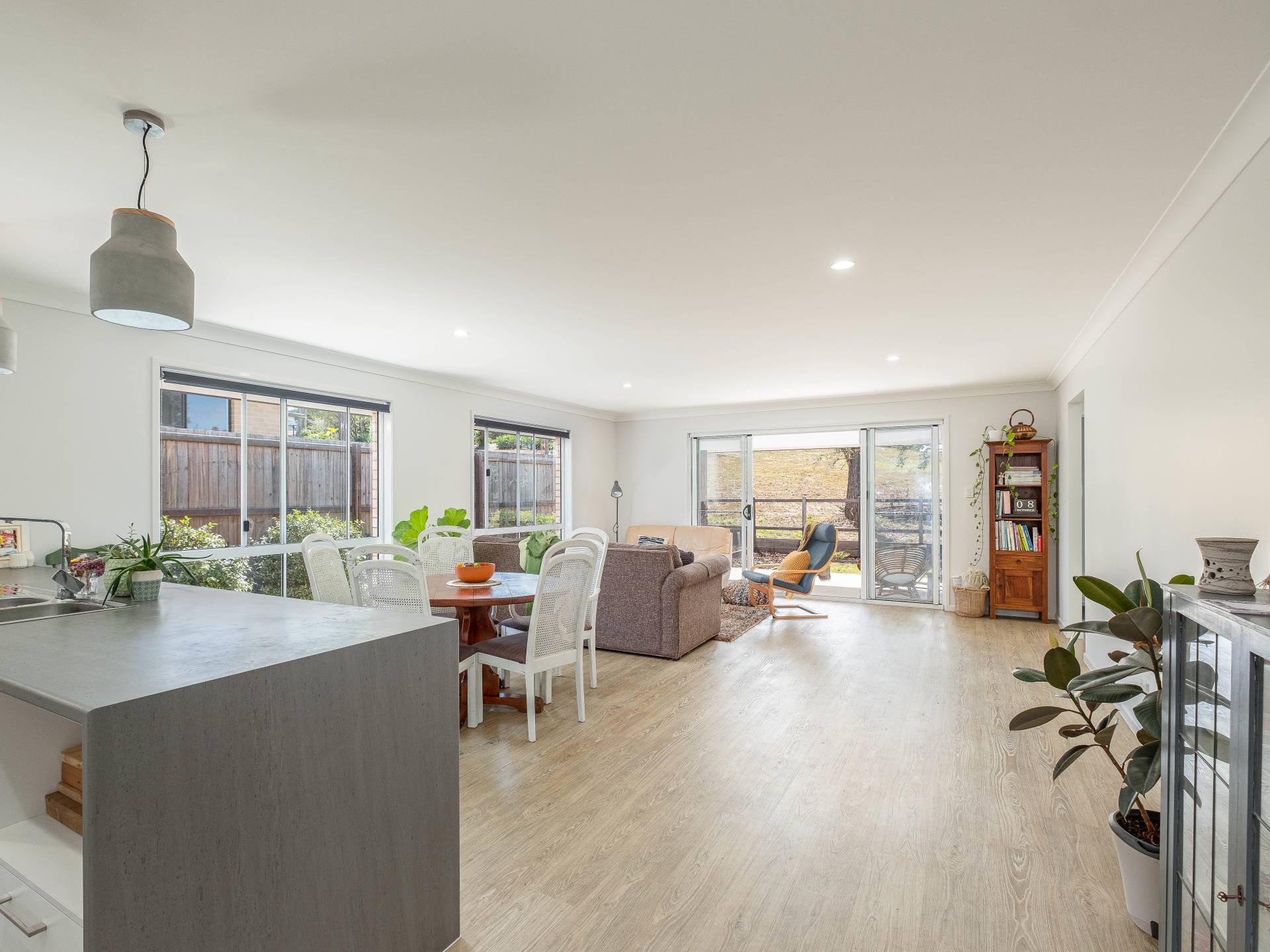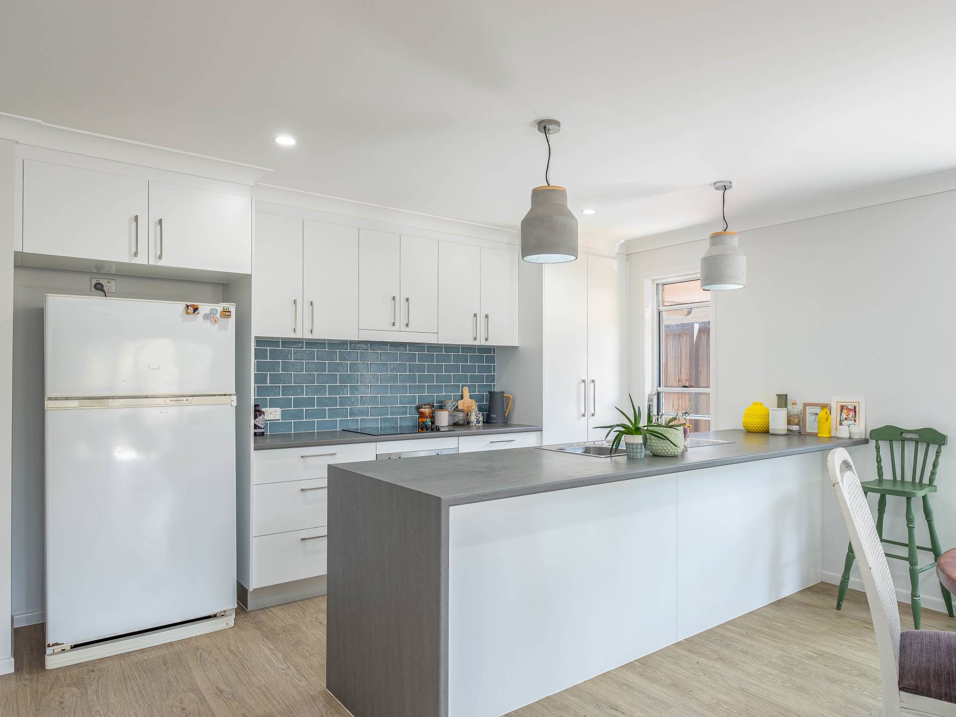 Open plan kitchen/living/dining with modern colours and ceiling fan.