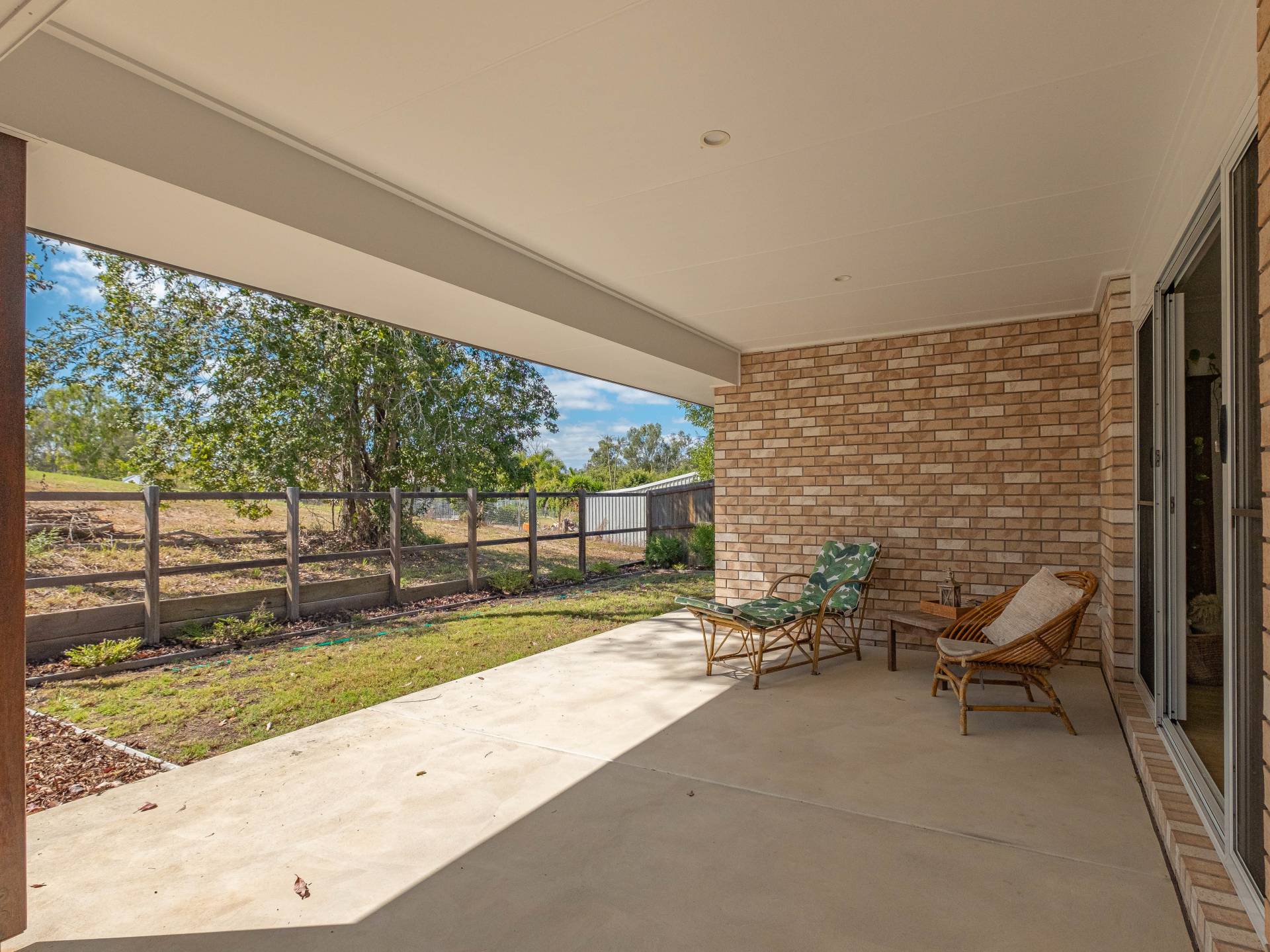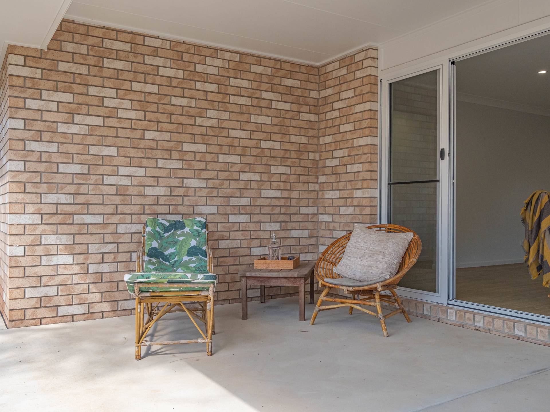 Flat landscaped block with maintained low maintenance gardens and an undercover al fresco overlooking a large empty paddock.