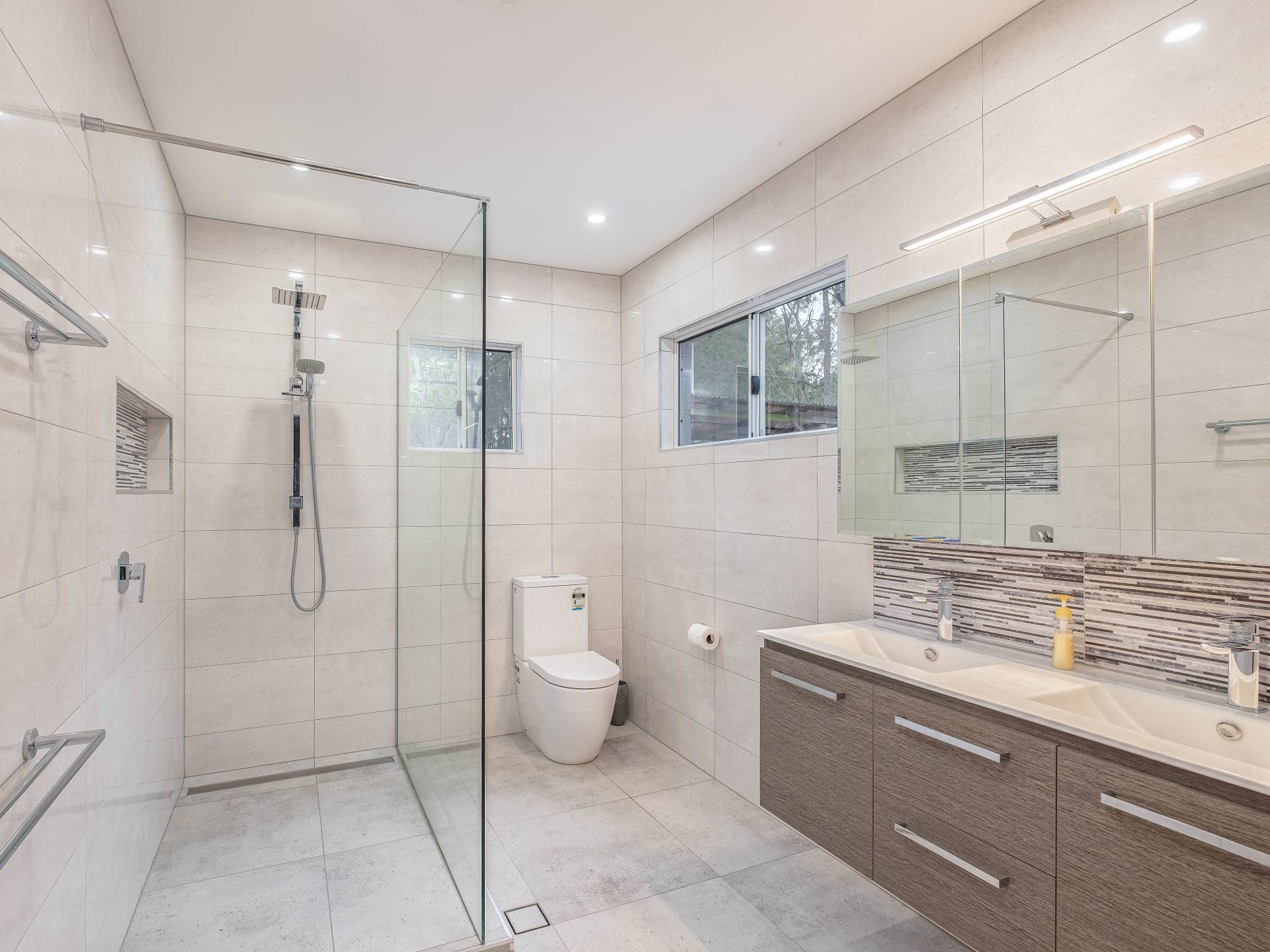The main bathroom has a large double walk in shower with a double vanity, toilet all renovated with modern colours.
