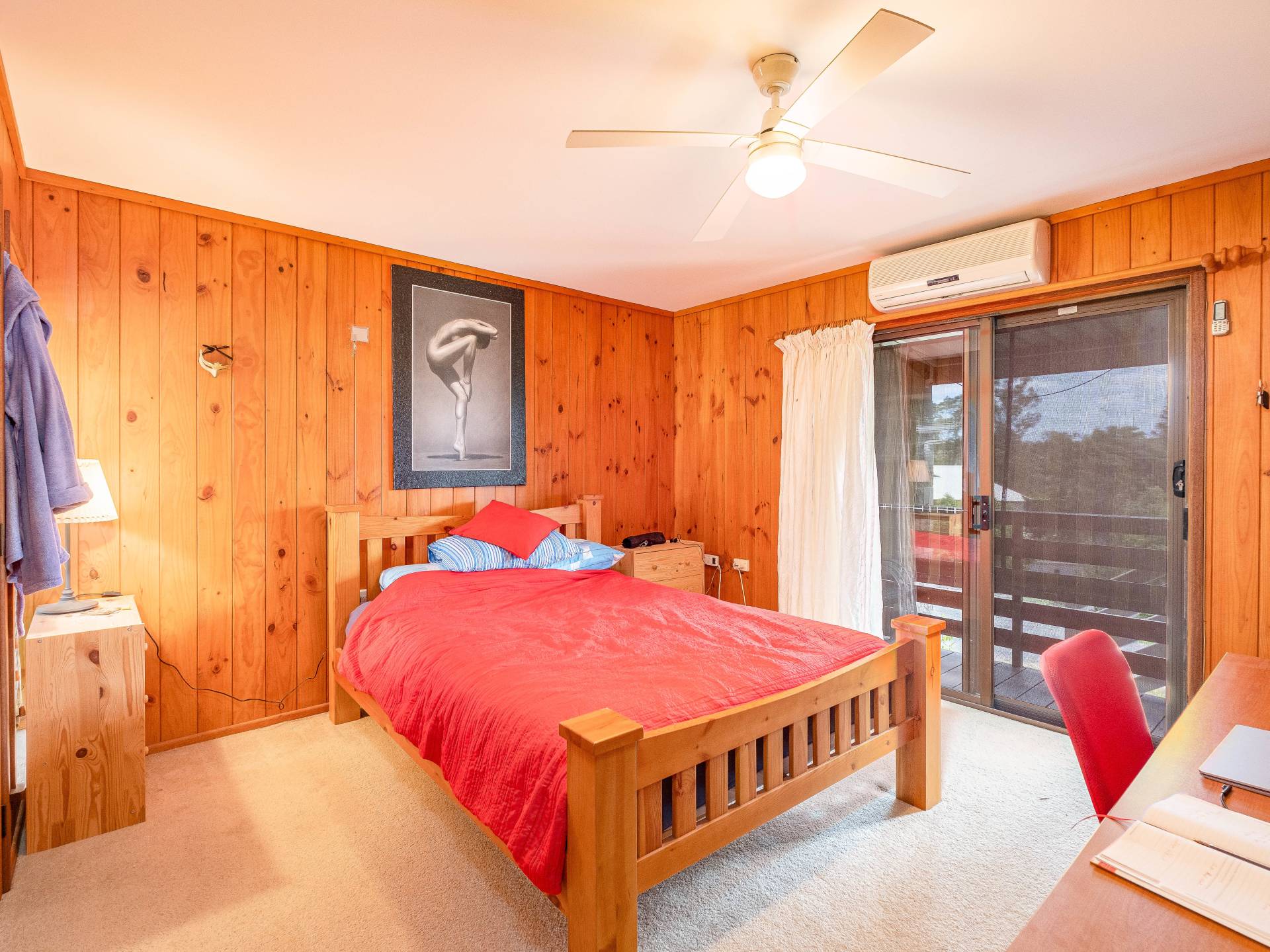 Master bedroom contains a split system air conditioner, ceiling fans and doors leading to the outside verandah.
