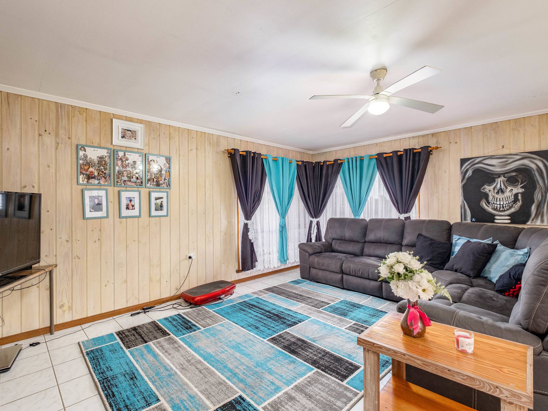 Living room has beautiful VJ walls throughout and a ceiling fan.