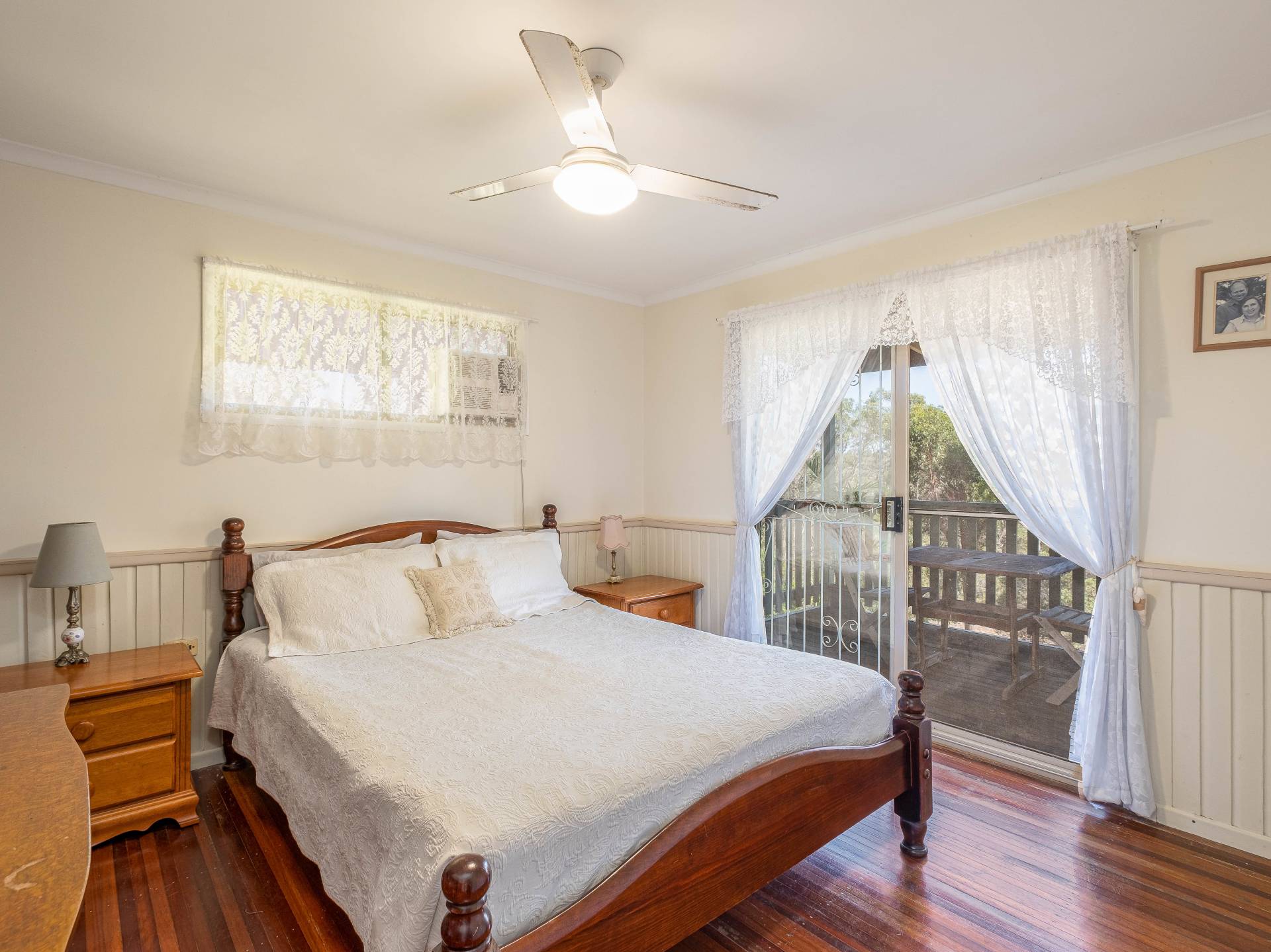 Master bedroom has hard wood floors, ceiling fan, air conditioning, built in wardrobe and a large sliding door with access to the large back verandah.