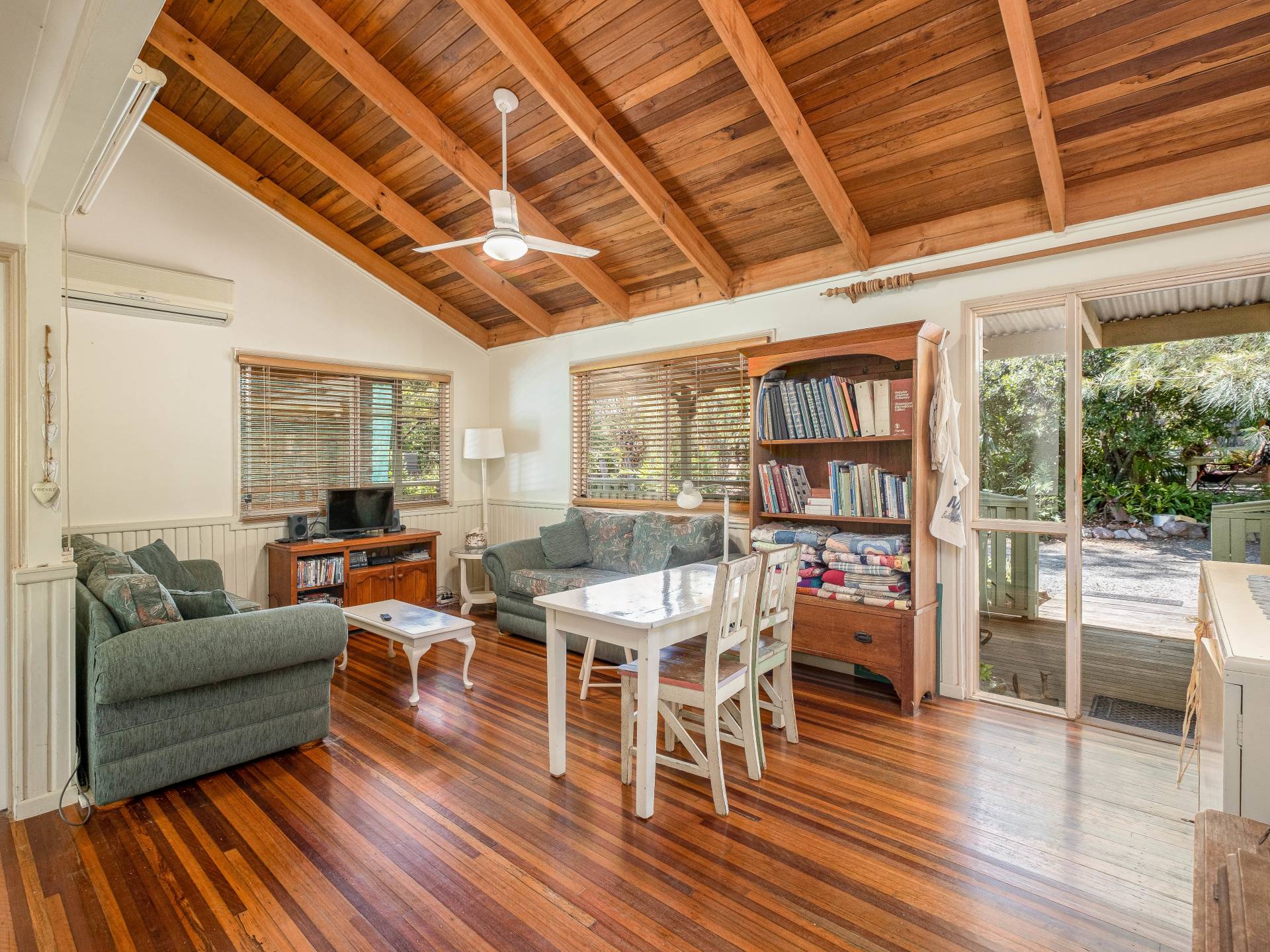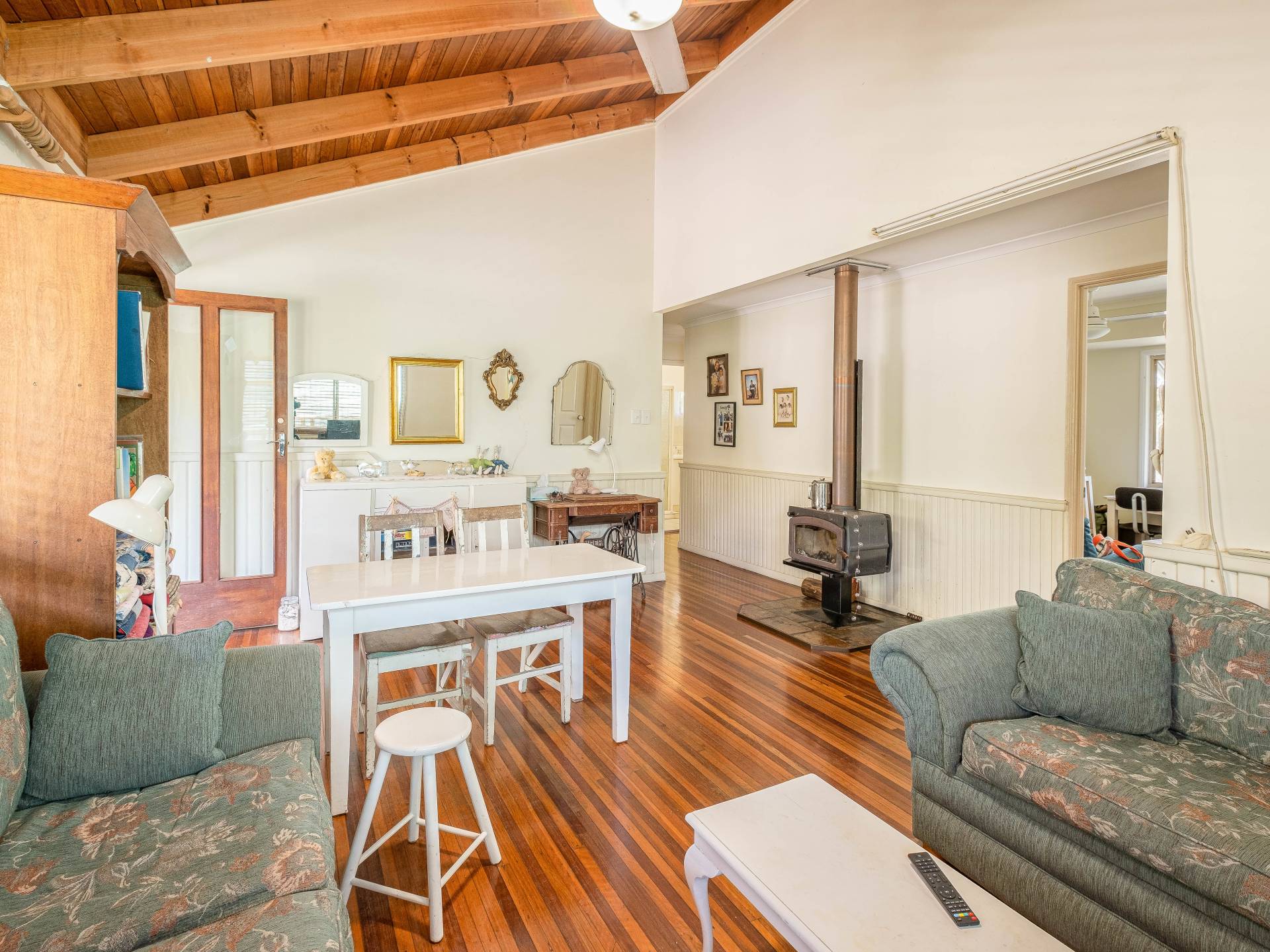 Lounge room has beautiful features including raked ceilings, hard wood floors, split system air conditioning, high ceilings and a large wood burner fireplace.