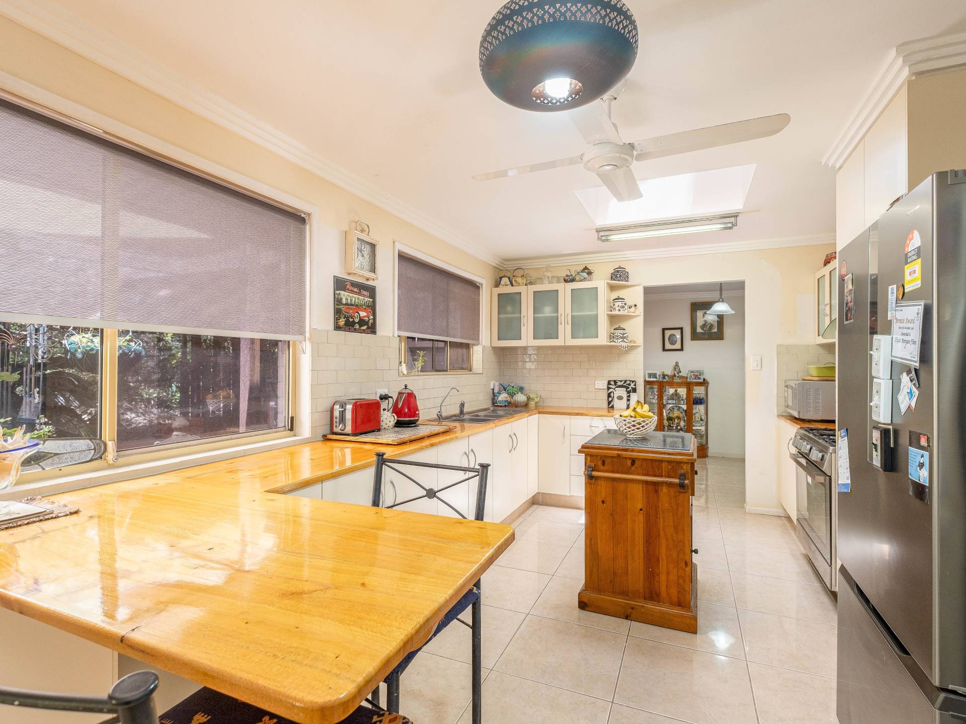 The kitchen has a modern country feel with a breakfast bar, wooden benchtops and heaps of storage including upper cabinets, and a skylight to allow natural light to pour in.