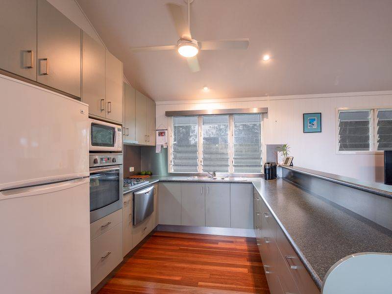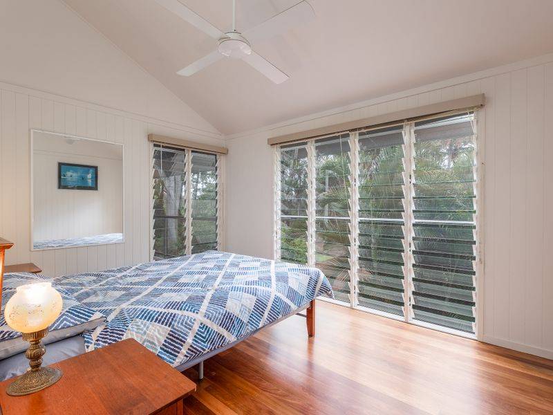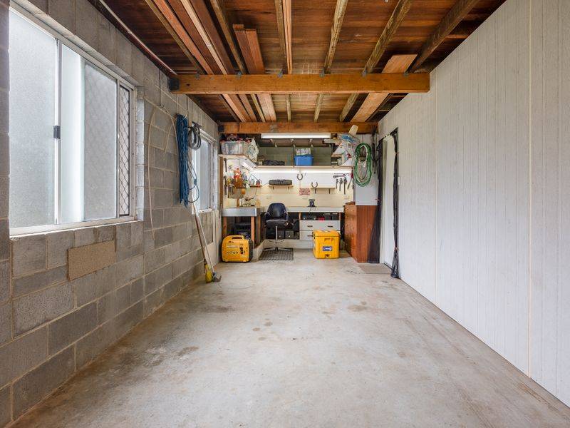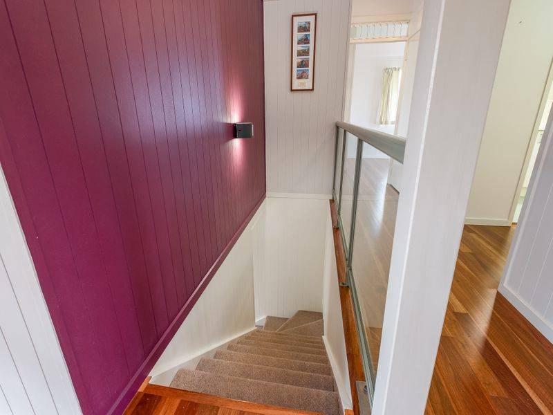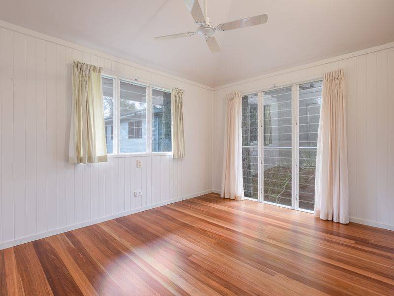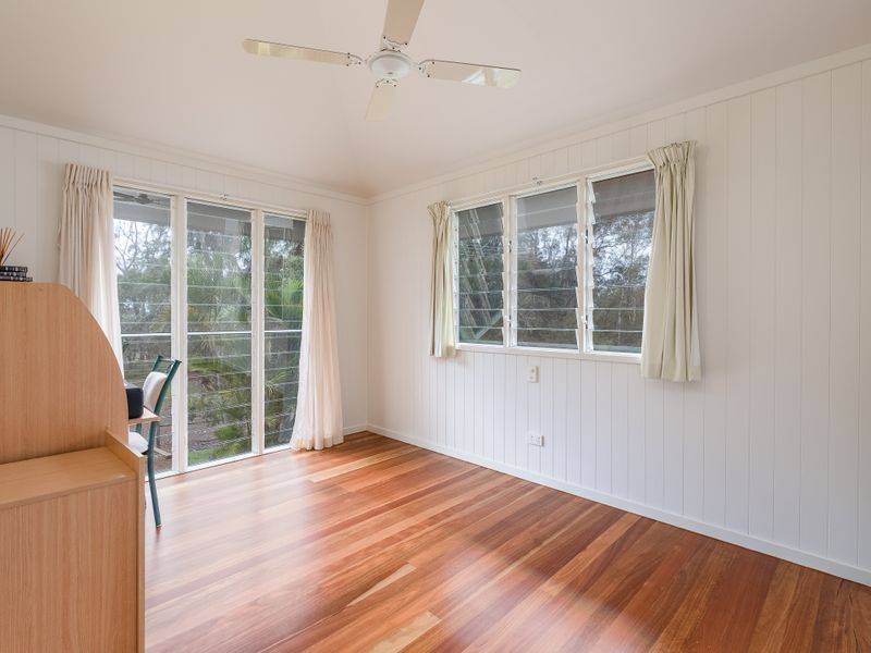 Highset home with beautiful vaulted ceilings, VJ walls, louvered windows and timber floors.
