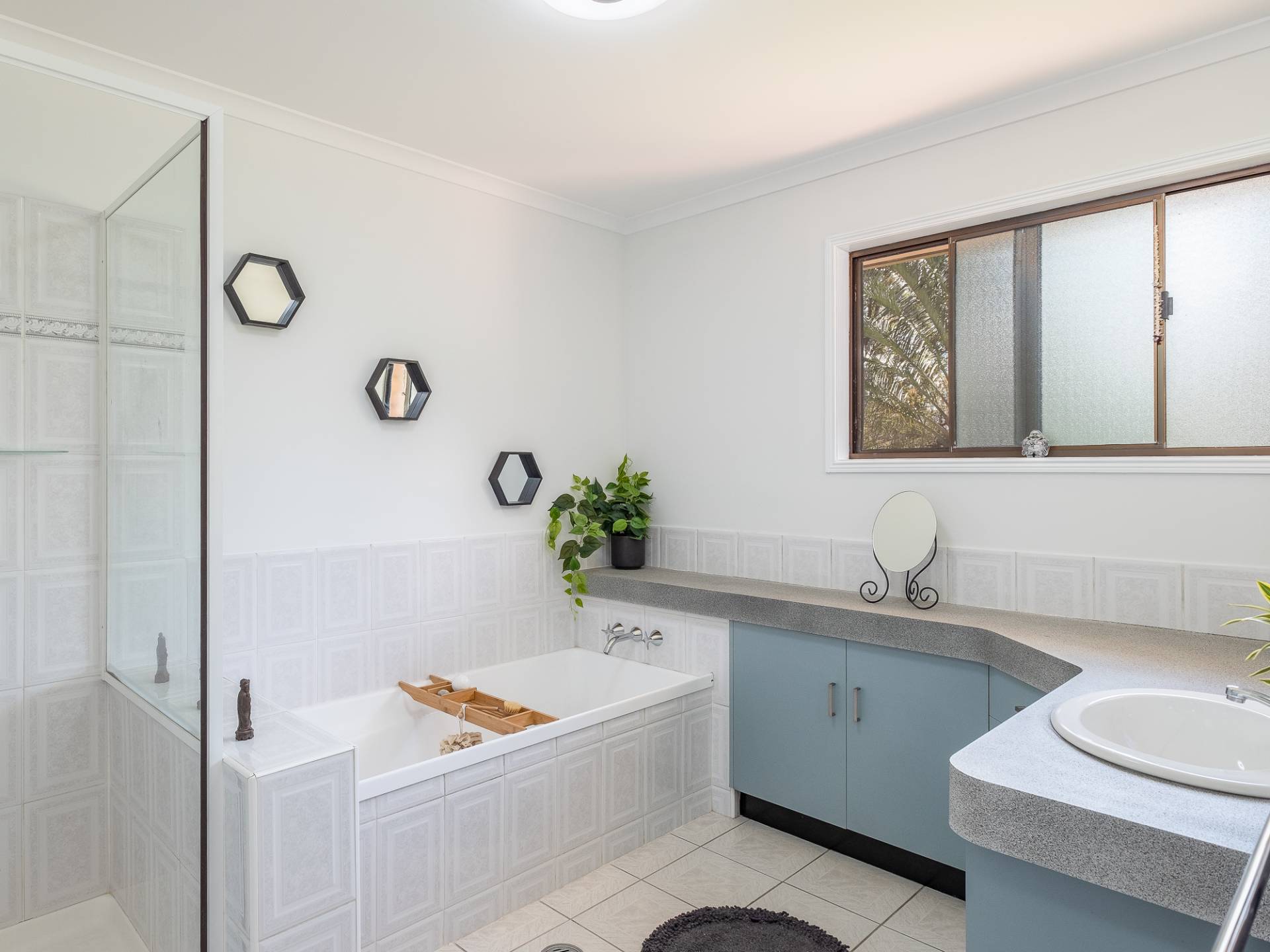 Main bathroom with shower, bathtub heaps of storage and a separate toilet.