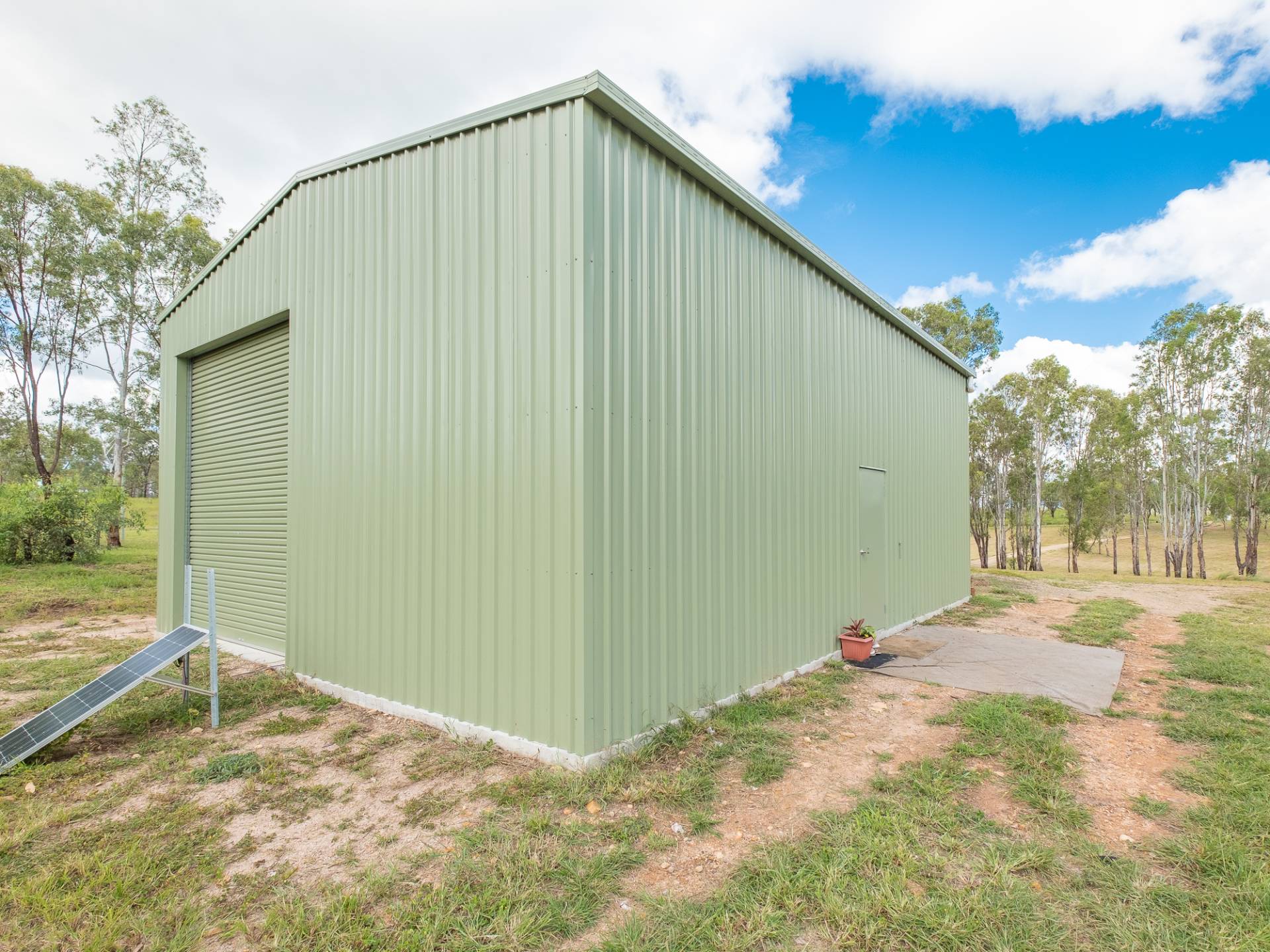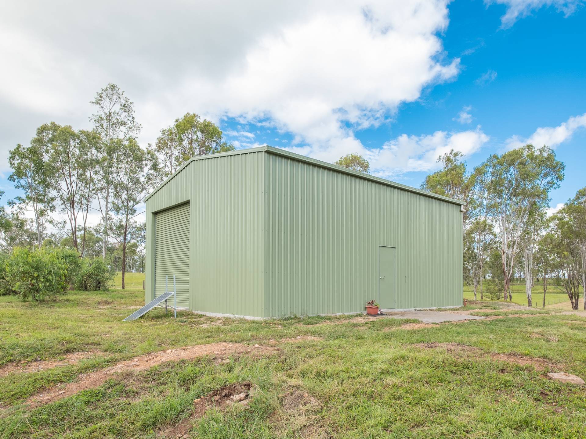The shed is 10m x 8m x 4.5 (height) with height enough to build a mezzanine, or store a boat or tall caravan.  It has a 5000 gallon tank with a pump already attached. Built within the last year on a concrete slab with an extra high roller door as well as a side access door this shed will suit all purposes.  The work here is already done.