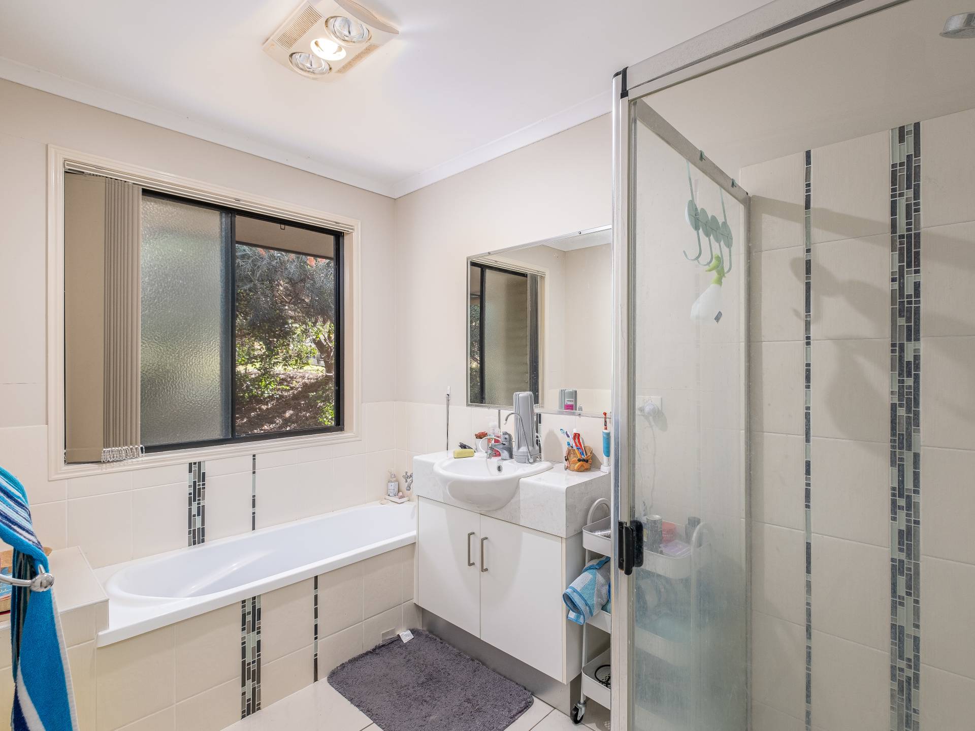 Master with split system air-conditioner, carpeted bedroom with ceiling fan, walk in robe, ensuite with vanity, shower and toilet in modern colours. There are also doors leading out to the rear al fresco.