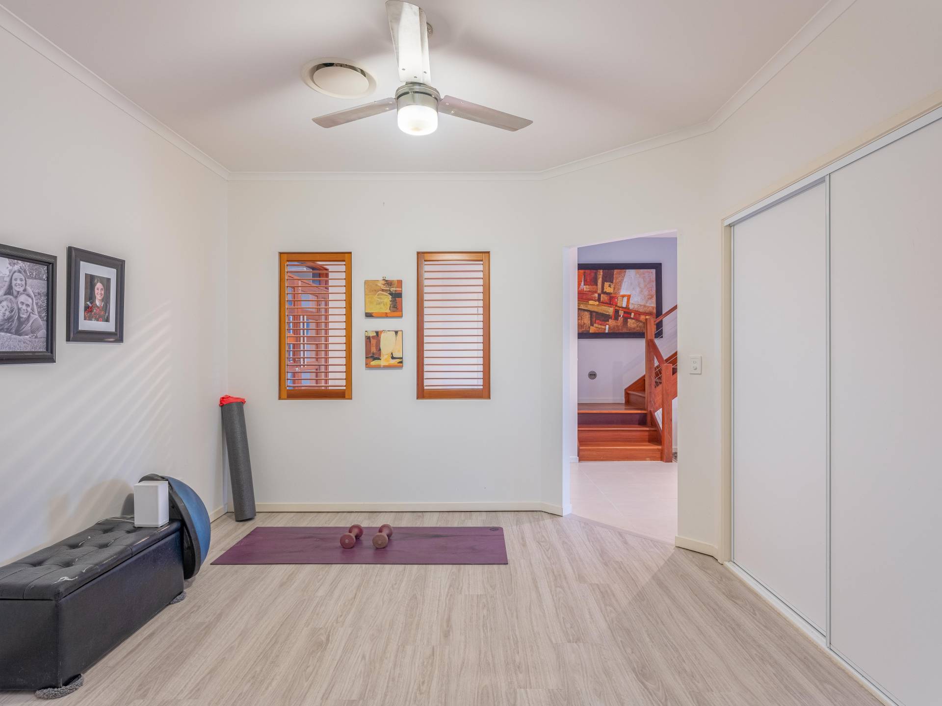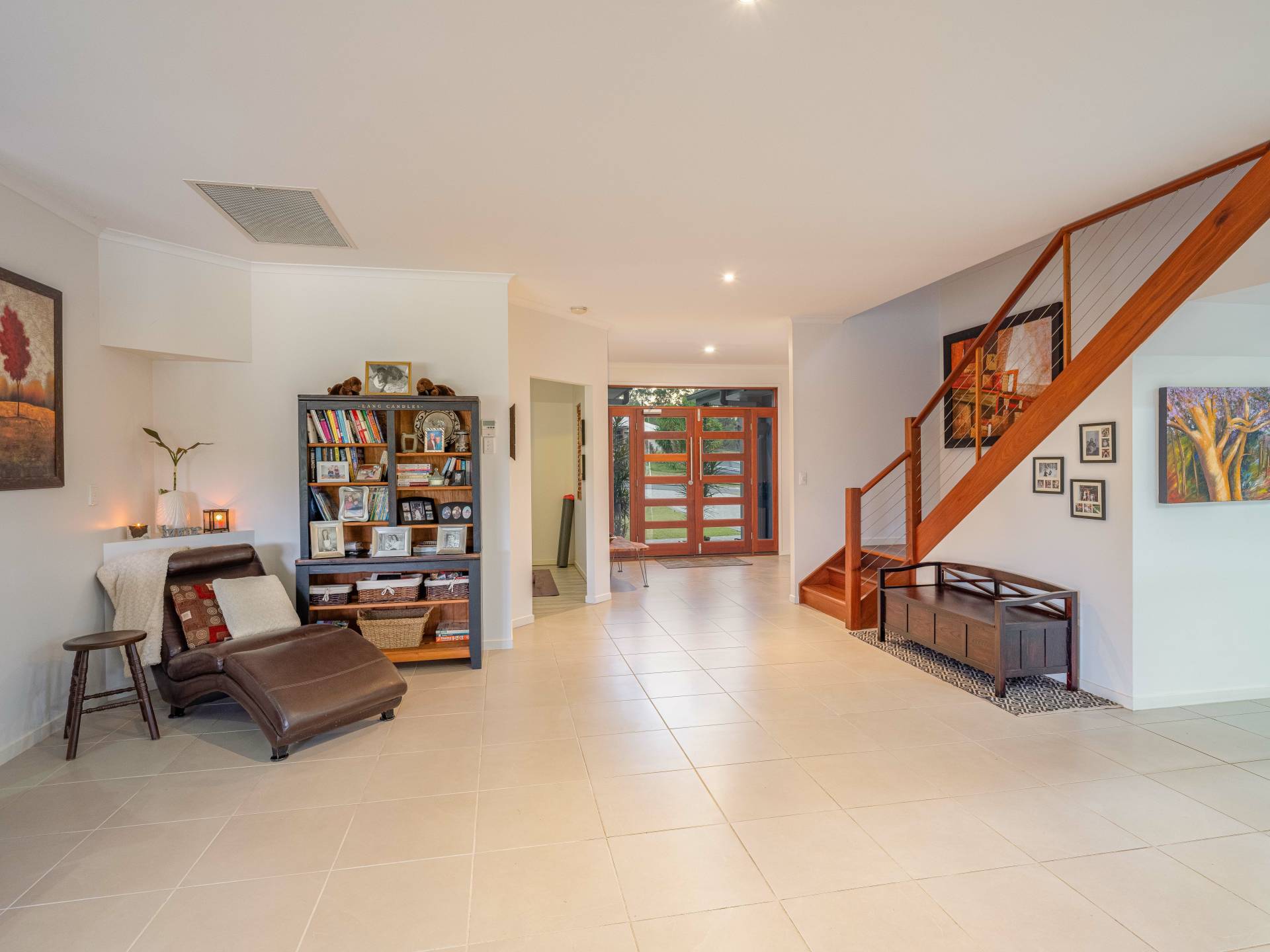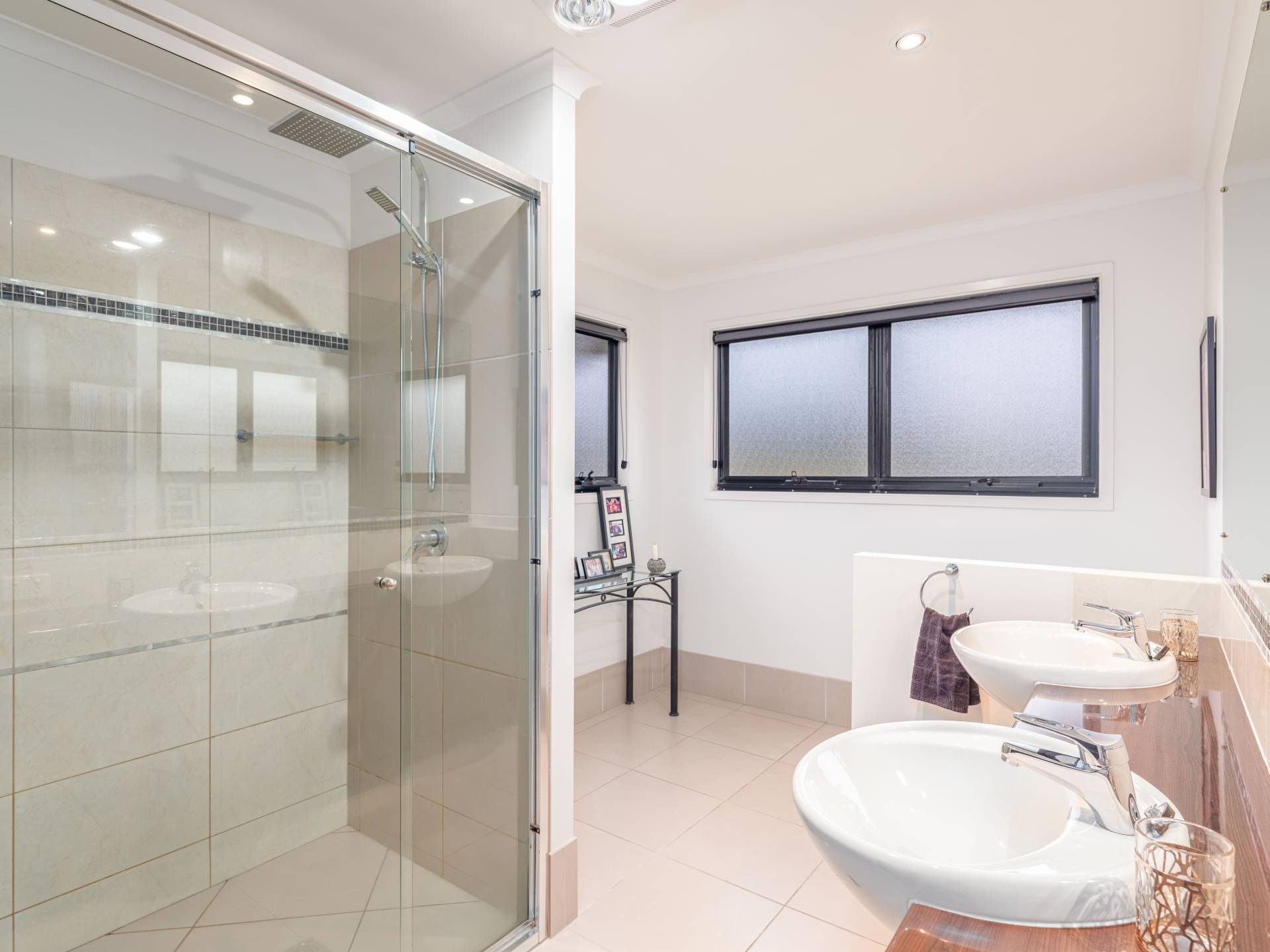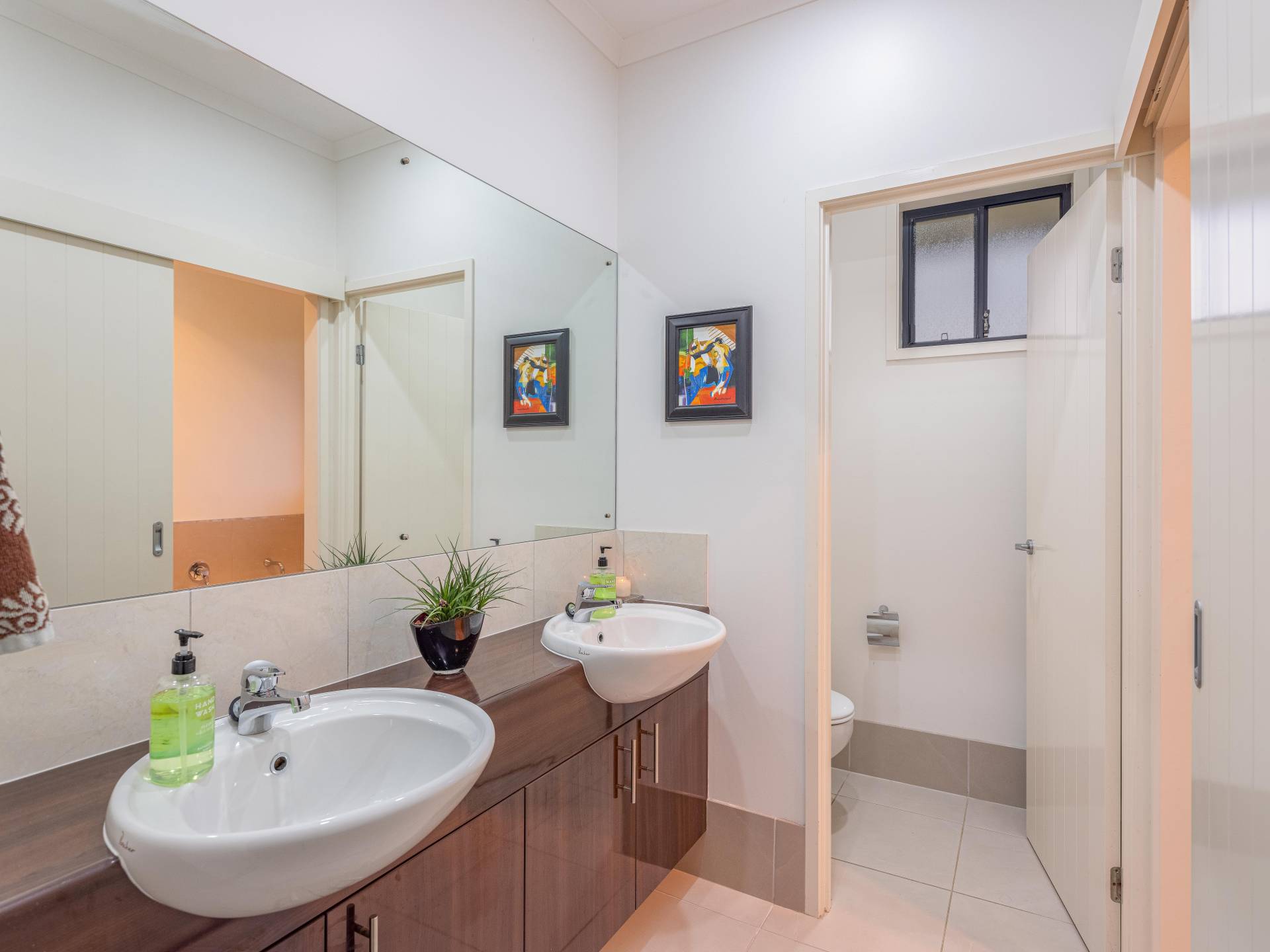 Elevated and secluded master bedroom (parent's retreat) upstairs with air-conditioning, large walk-through robe, huge ensuite with "his and hers" basins, double shower and toilet with privacy wall.