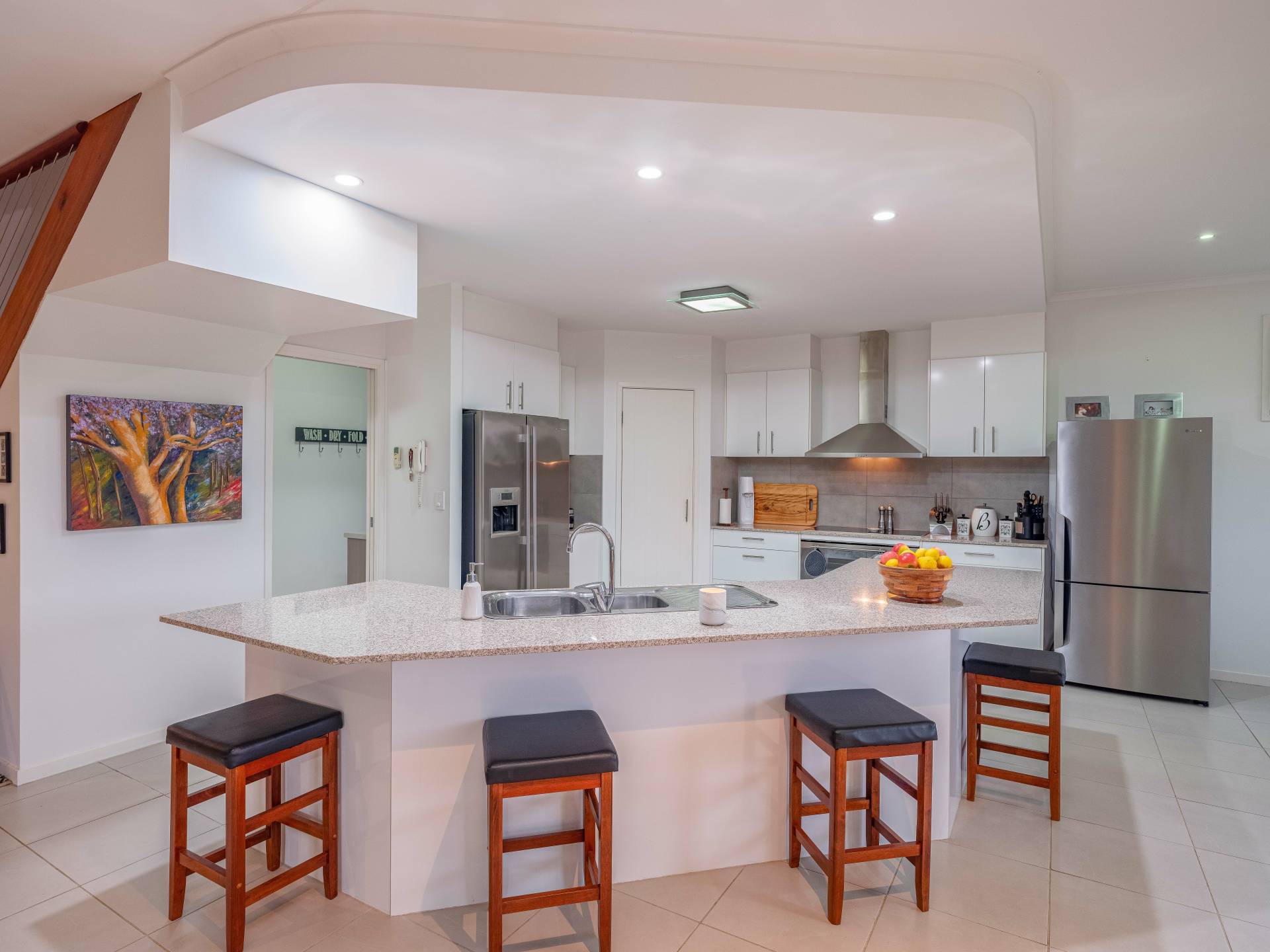 Huge entertainers kitchen with stone bench tops, dominating island bench with double sink, tiled splash back, Miele dishwasher, stainless steel rangehood and wall oven, excellent storage with a large walk in pantry, and bench space and eye catching featured bulkhead and a breakfast bar.
