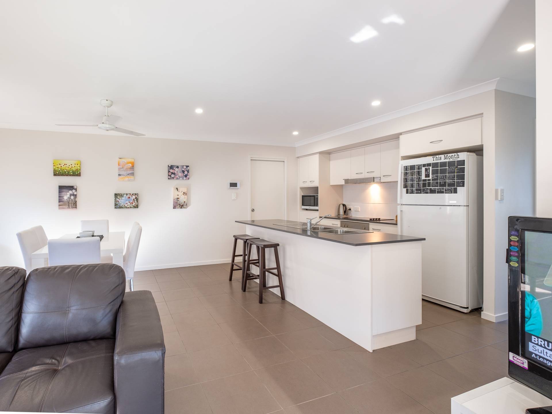 Open plan kitchen/living/dining with modern colours and ceiling fan.