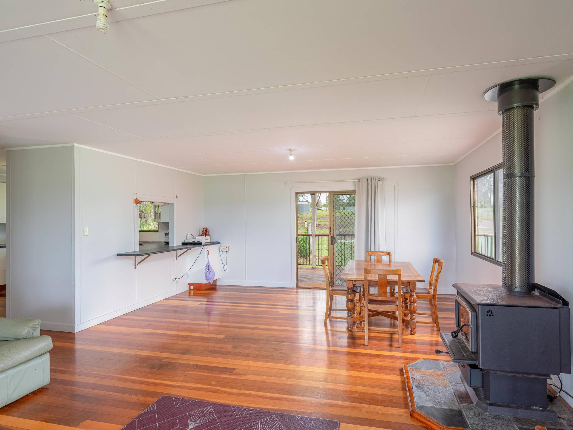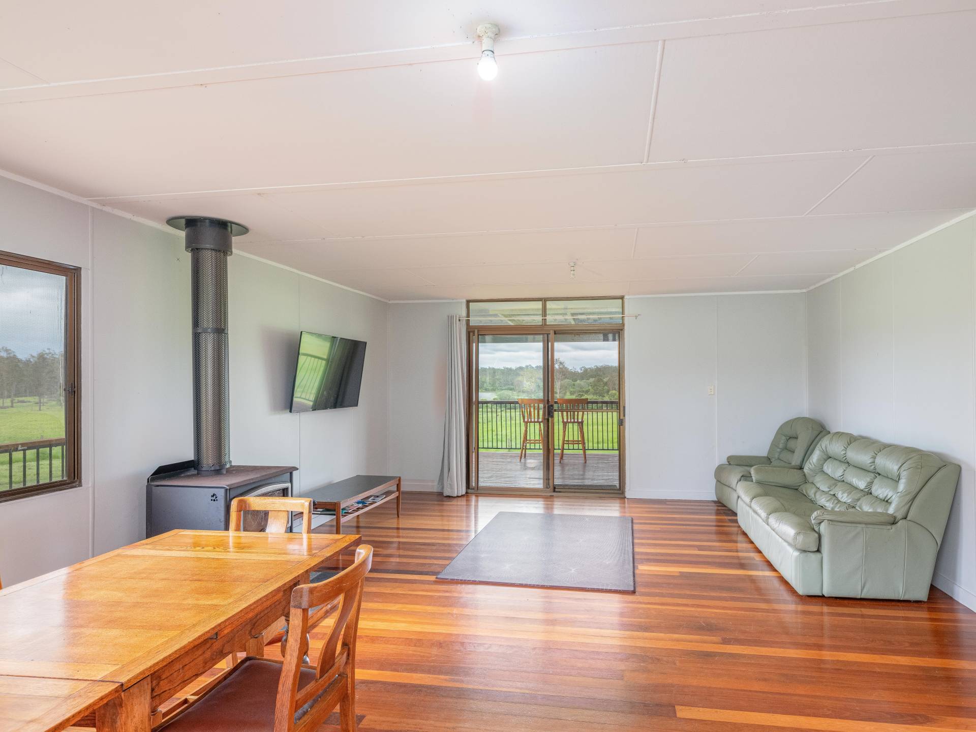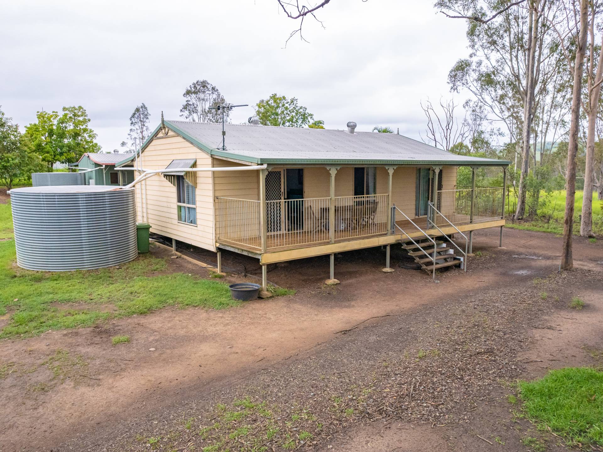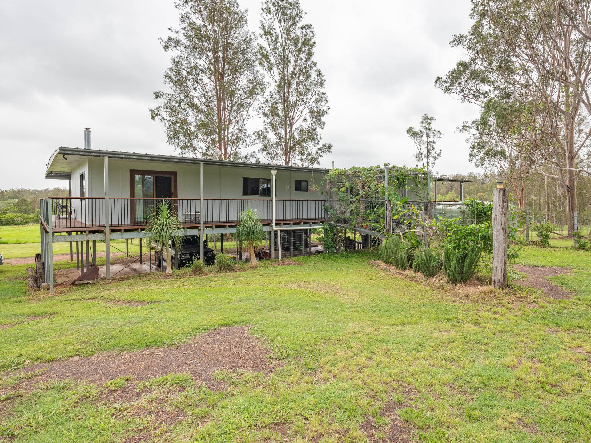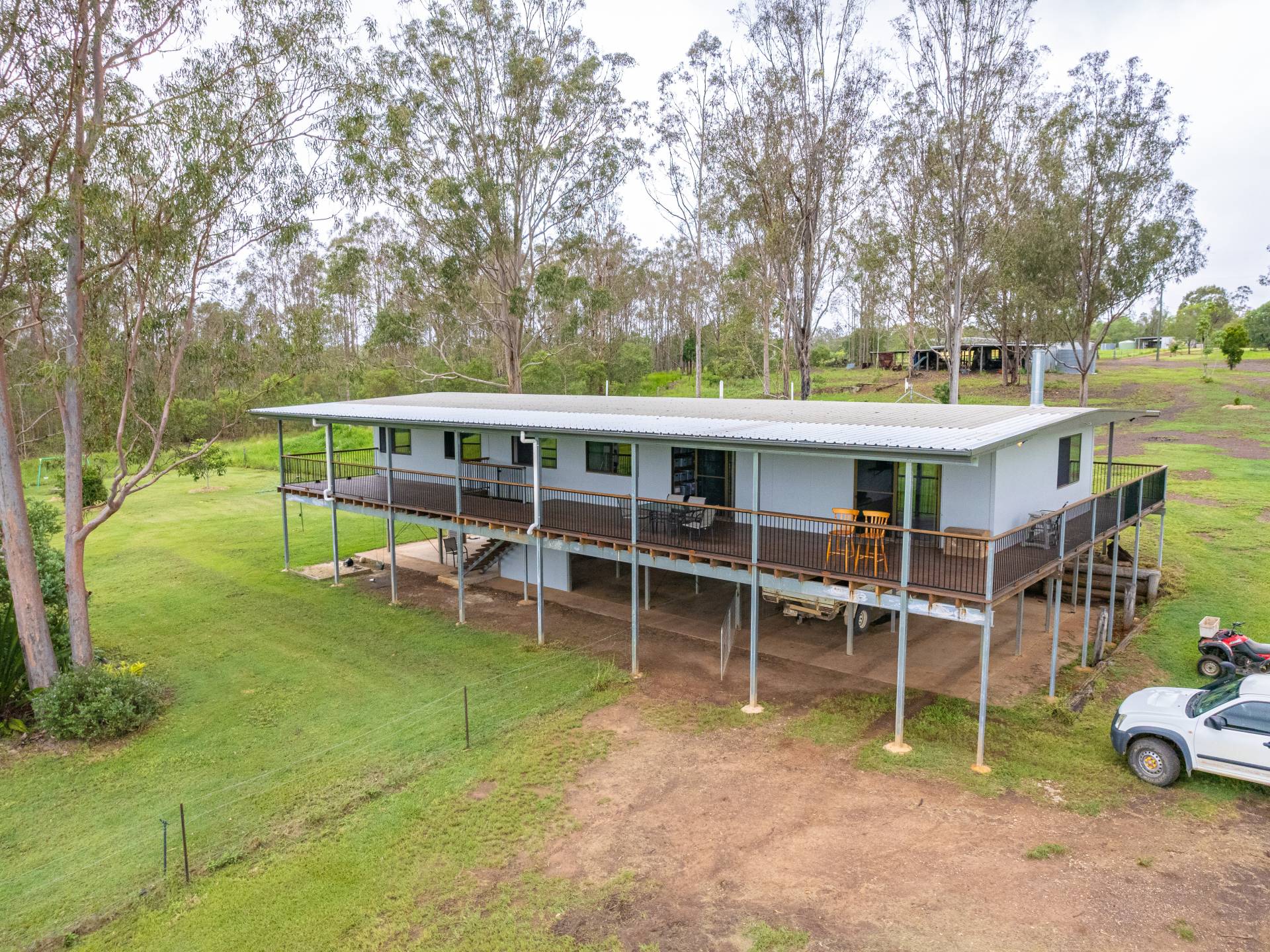 Main home - Currently three bedrooms but has potential to easily be 4 bedrooms with the addition of one wall. All rooms are spacious and have excellent views. The master bedroom features air conditioning and has plenty of storage space and a separate area for a parents retreat.  Lovely spacious kitchen including a dishwasher and open plan living areas with wood heater. The lounge room opens out to the 12ft wide veranda which overlooking the acreage beyond.  There is plenty of vehicle parking space underneath and a cemented section for entertaining or potential for more rooms to be built in.