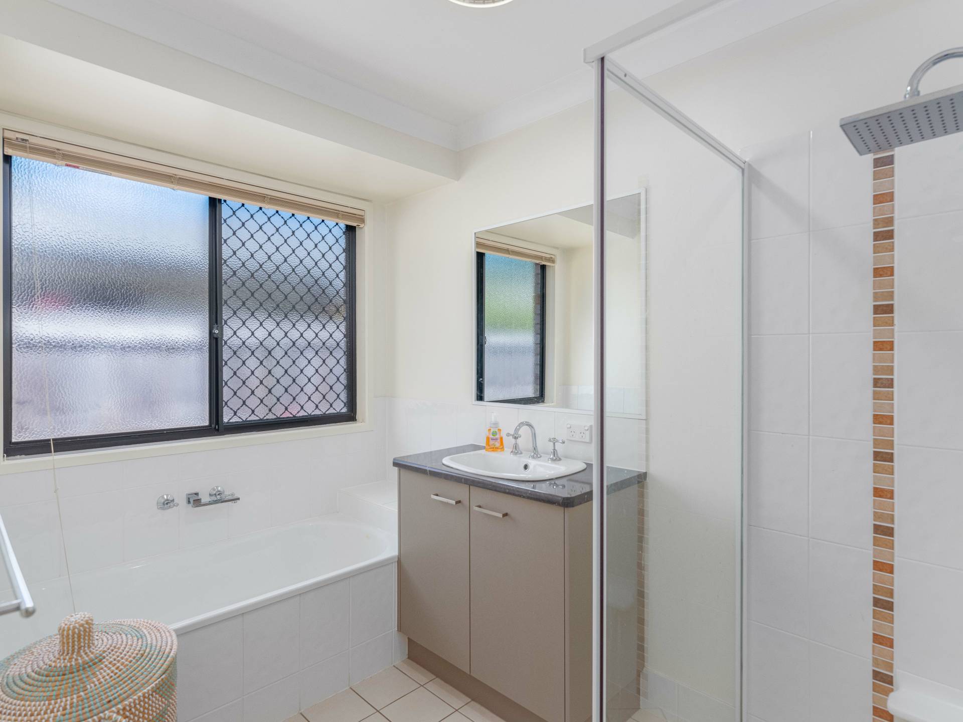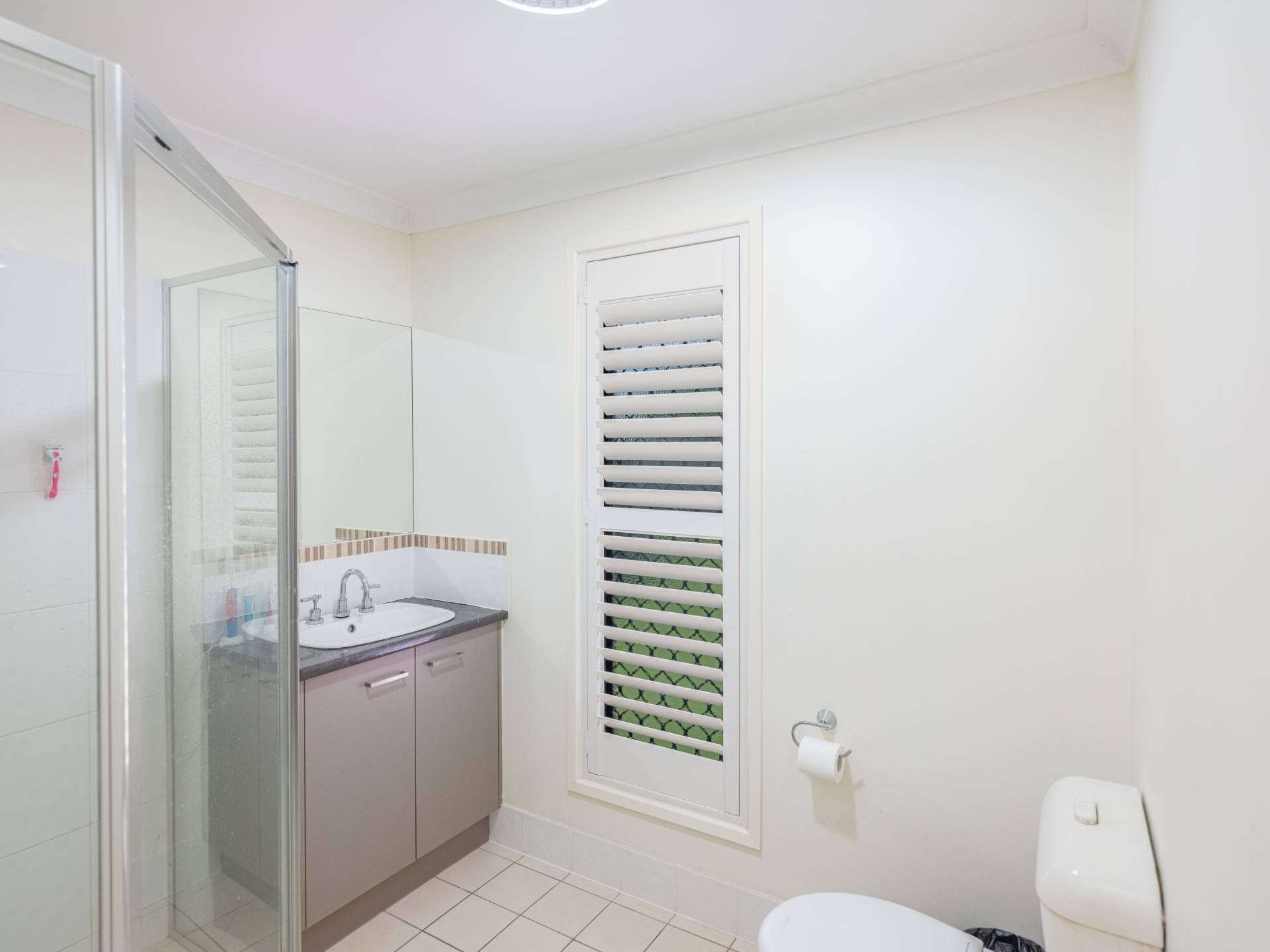 Master with split system air-conditioner, plantation shutters and an ensuite with vanity, shower and toilet in modern colours.