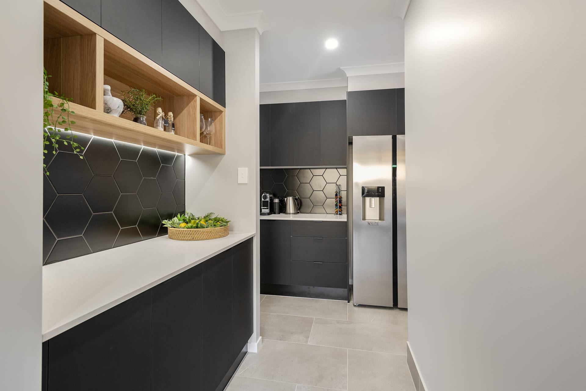 Large butler’s pantry which houses plenty more cupboard space, fridge and kitchen appliances.