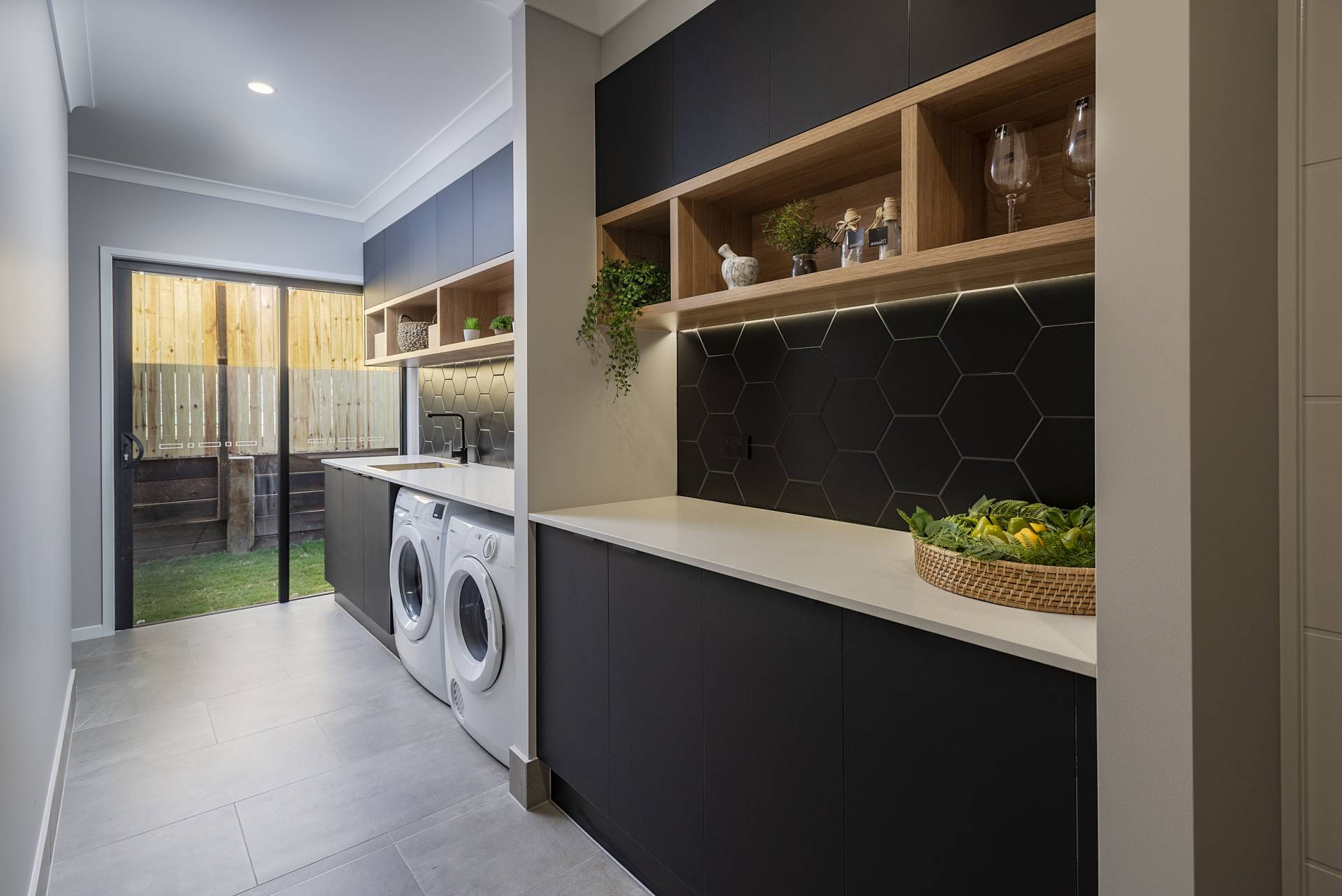 Large laundry area with an external glass door for convenience.