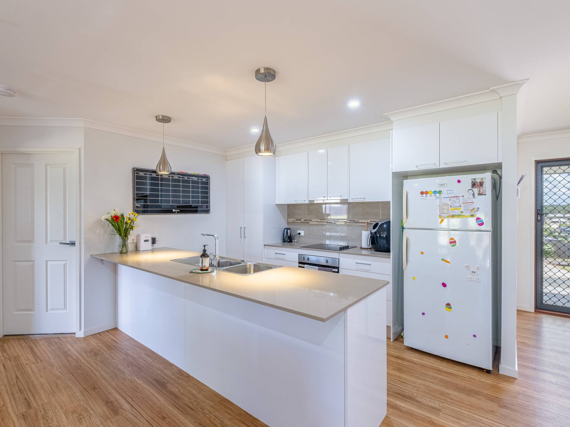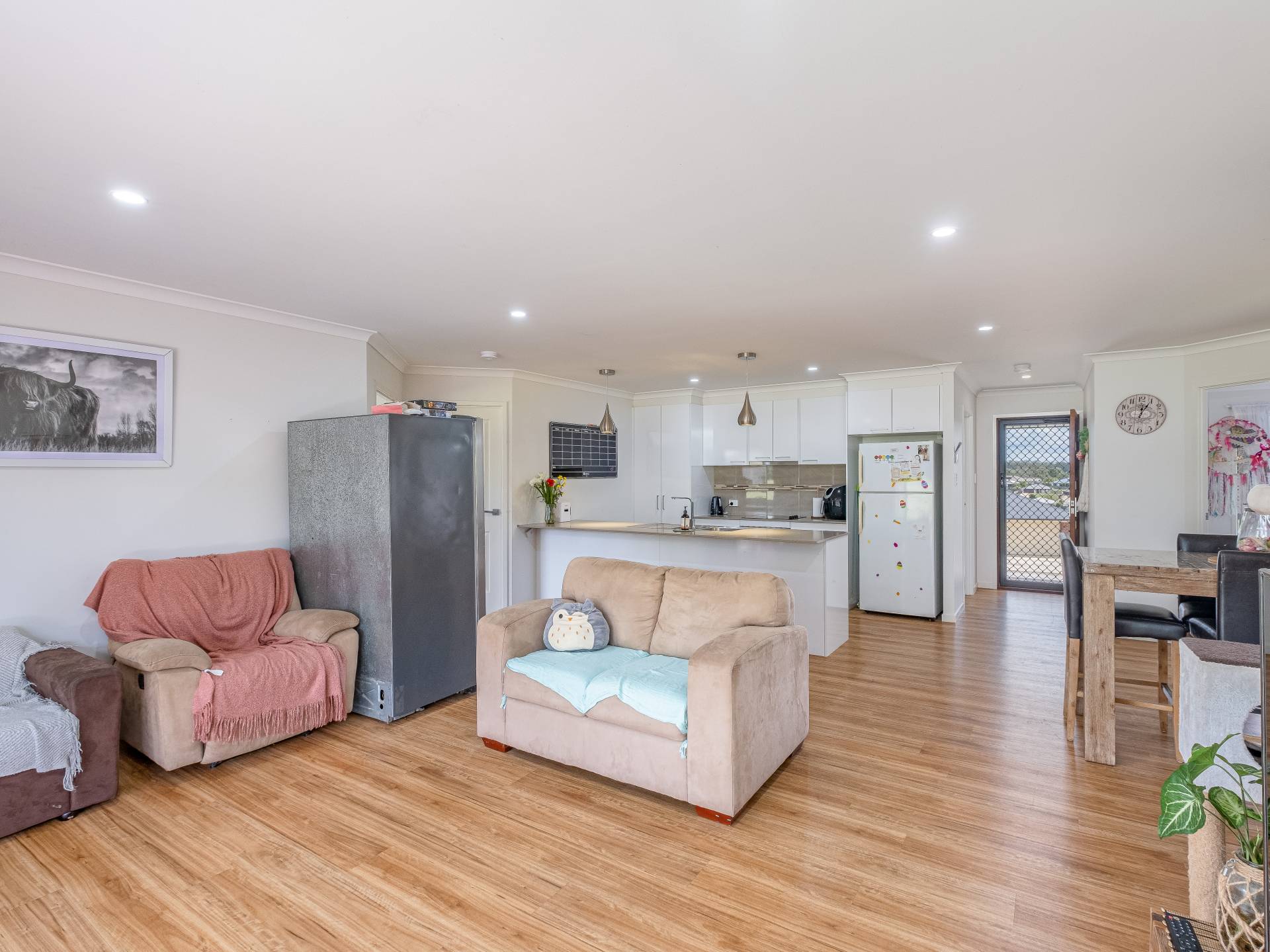 Dining and living backing on to the kitchen leading to the backyard through double sliding doors.