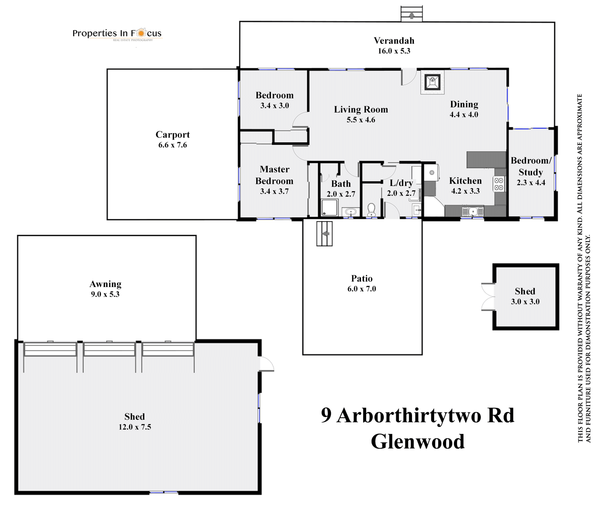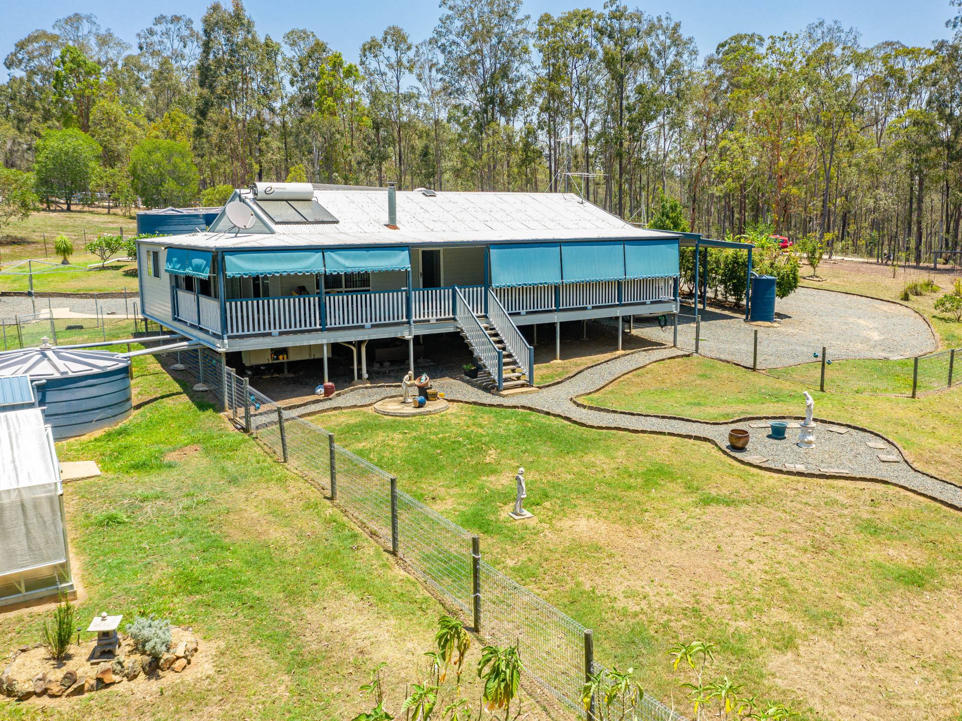 Gardens include a fully fenced veggie patch, a greenhouse a garden shed and solar lights.