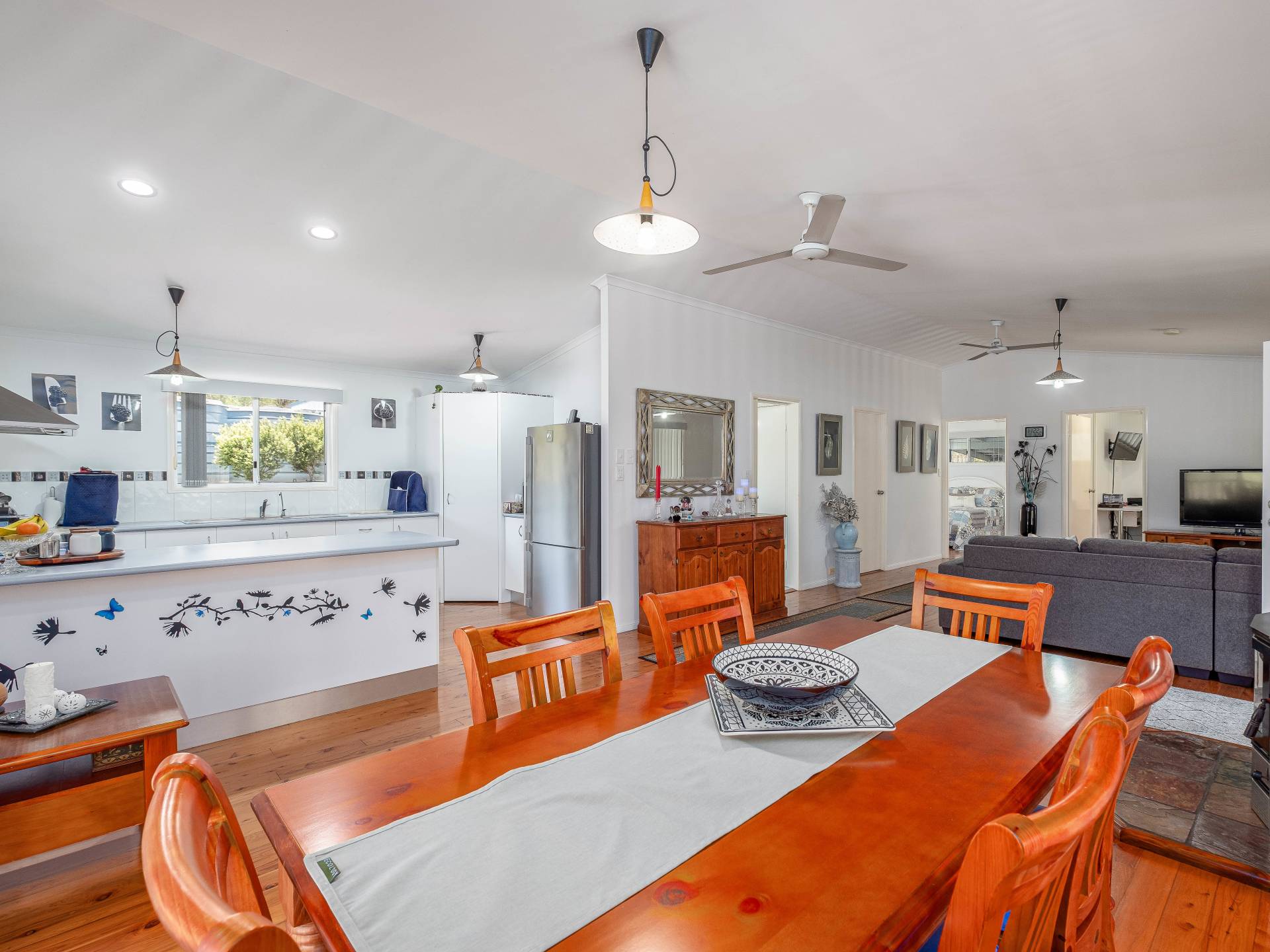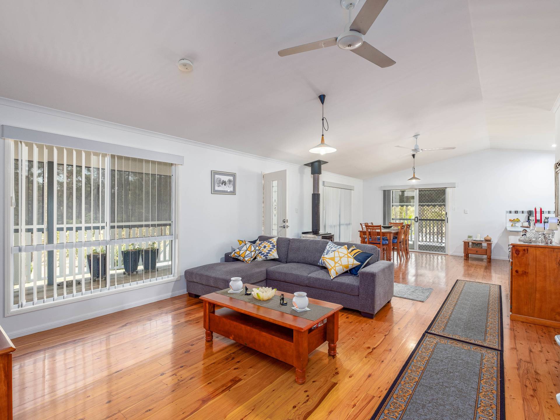 Open plan living dining and kitchen with stunning hard wood floors, a wood burner, and 2 ceiling fans.