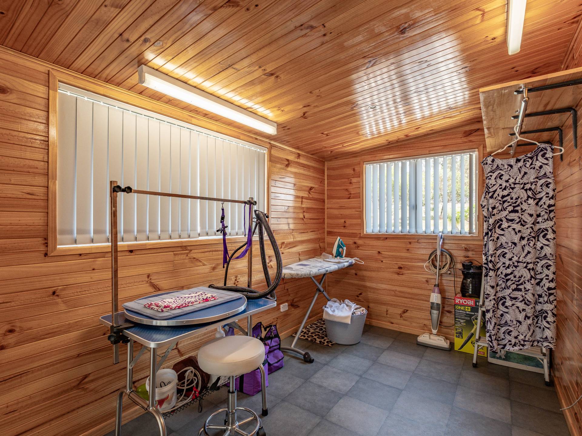 An unbelievably versatile shed. 12m x 7.6m shed with 4 bays and 3 roller doors. This shed has a concrete floor, power, a 3 bay carport, mezzanine storage, numerous workbenches and rooms internally. It also has an insulated roof and the walls are fully lined making it a comfortable space to work in the summer.