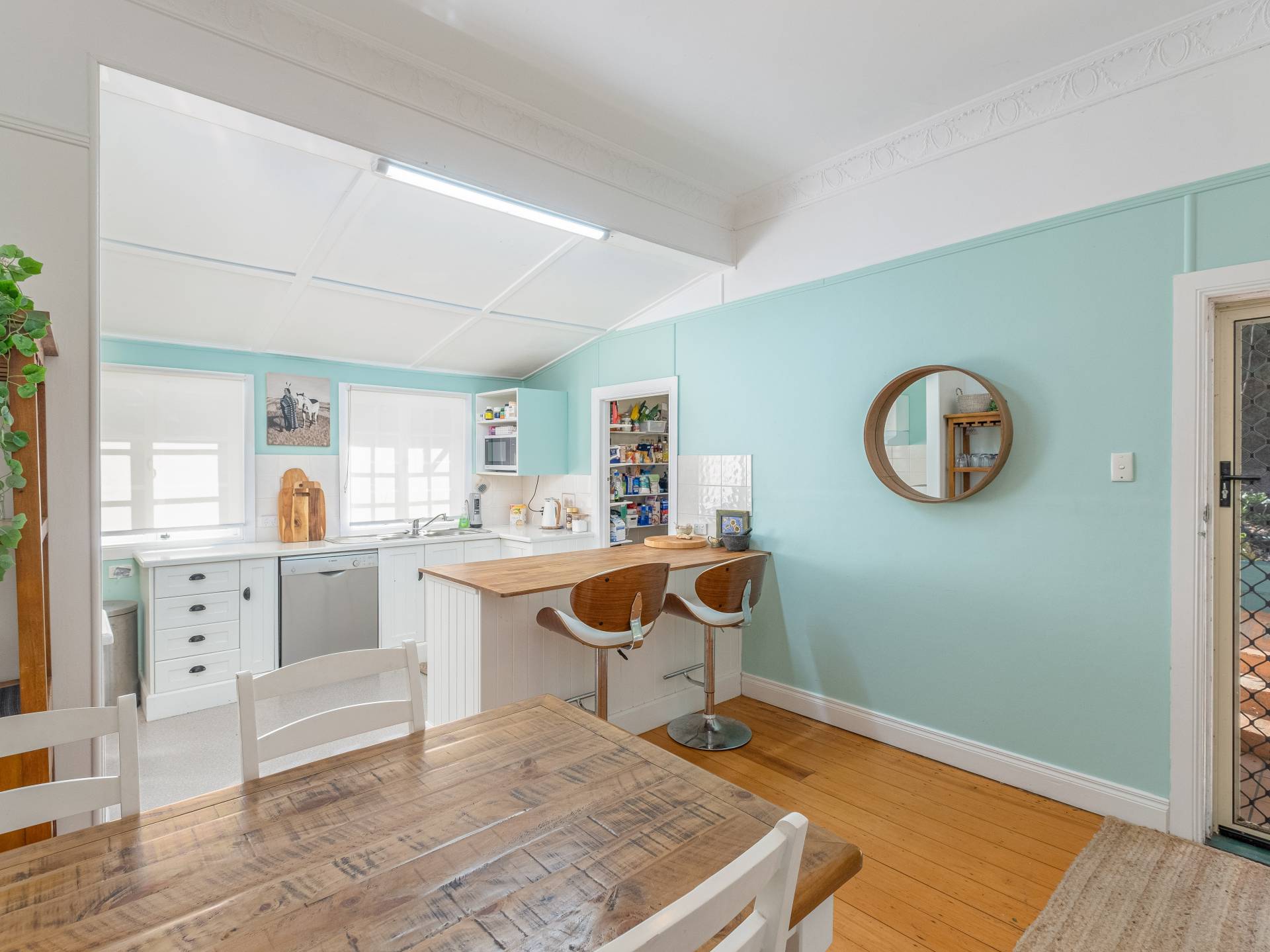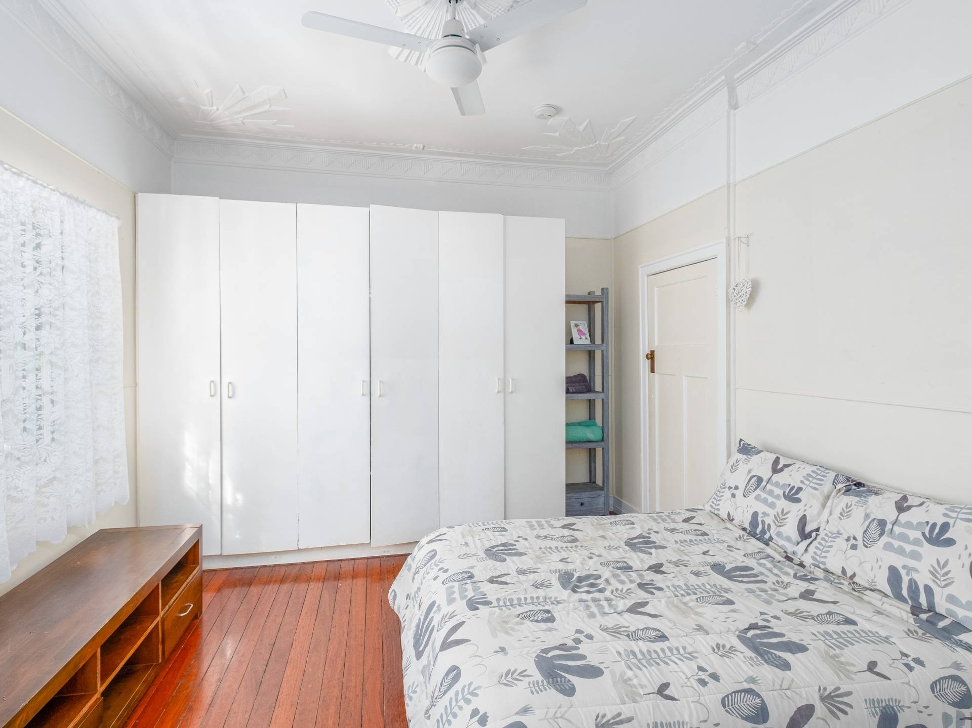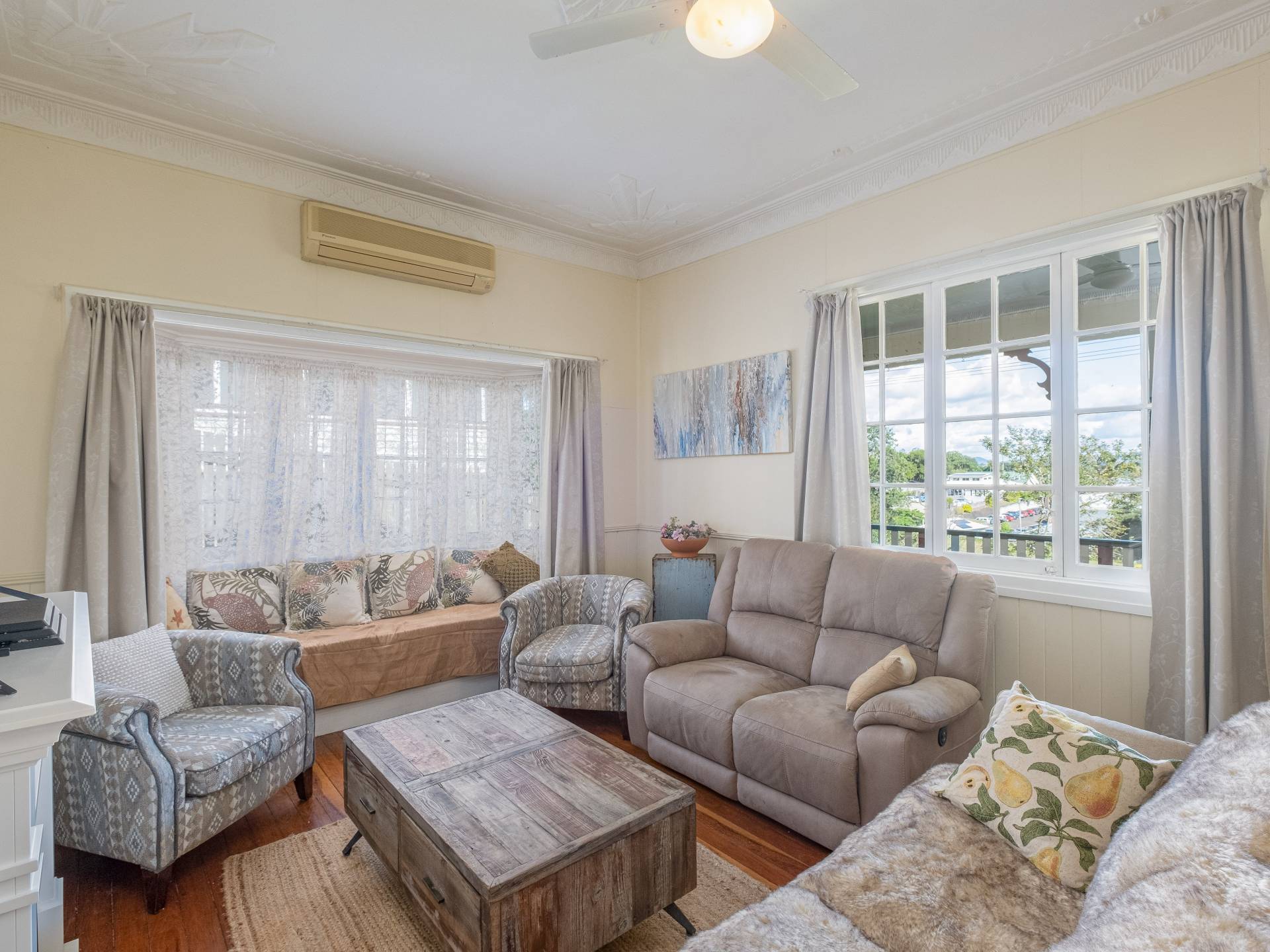The central living room is air conditioned and showcases character and charm with a quaint bay window, high ceilings and decorative plasterwork. With