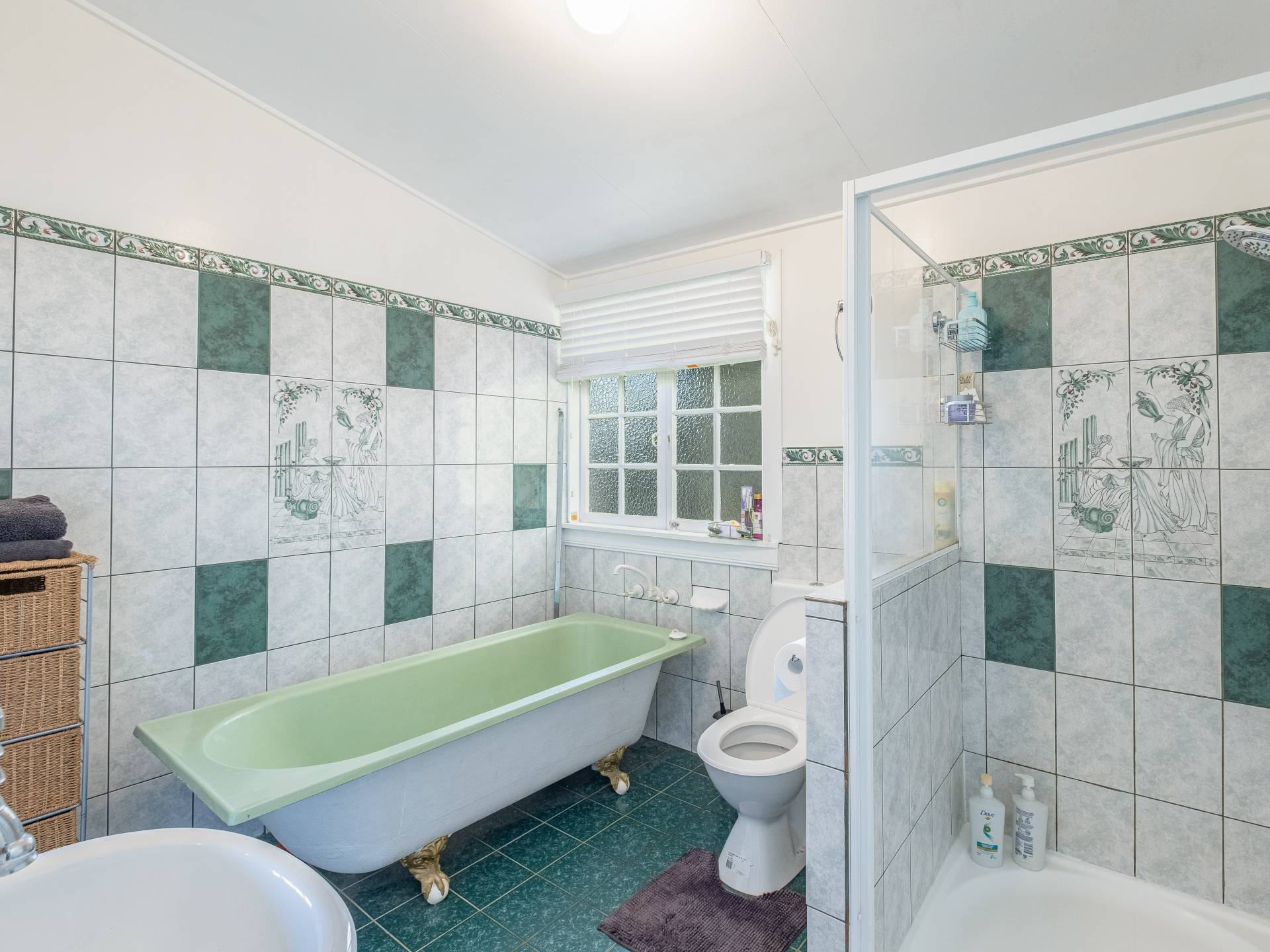 The family bathroom features a free-standing claw foot bath, separate shower and adjoining powder room area for convenience.