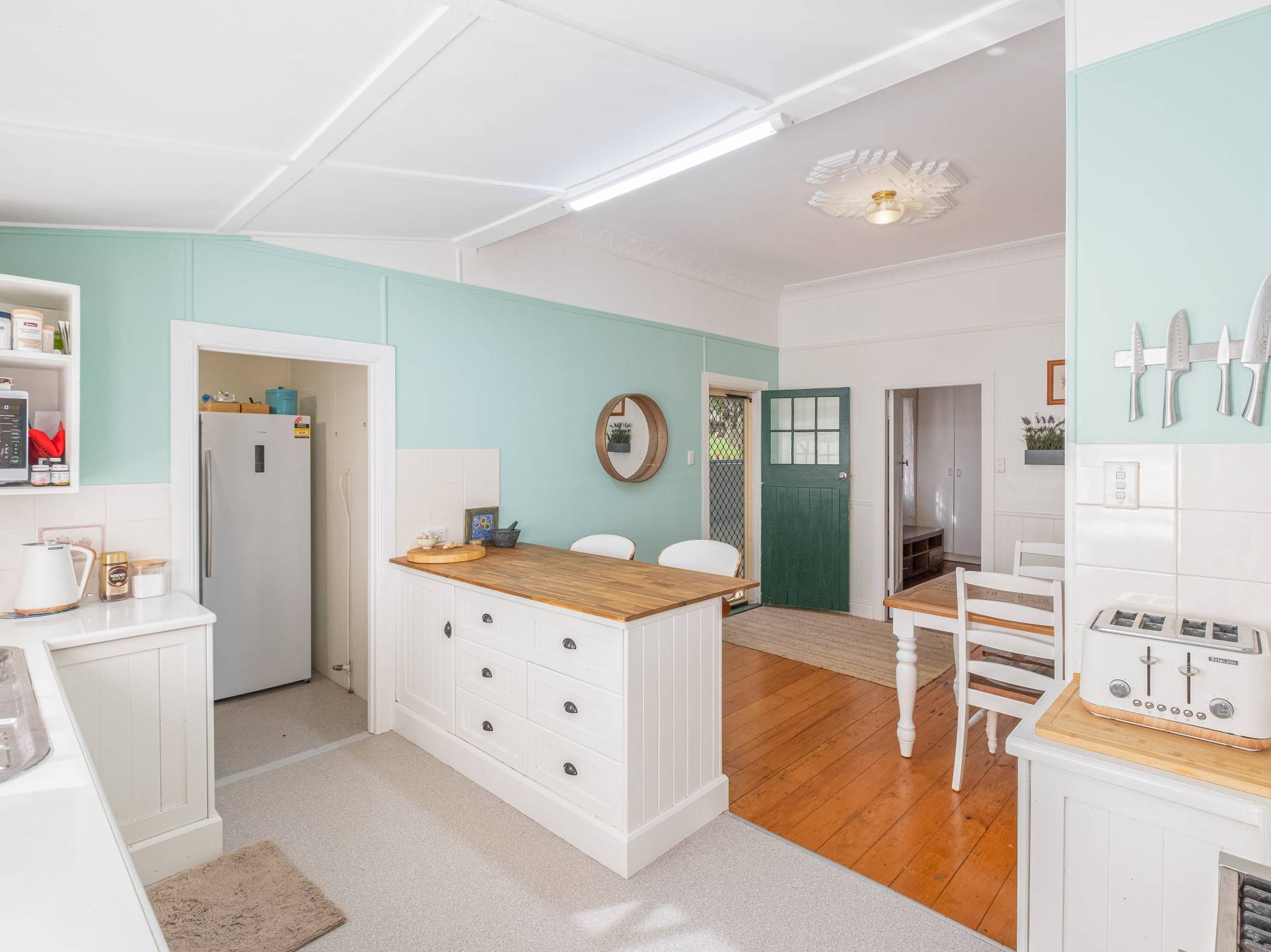 A French provincial style kitchen with gas cooktop, walk in pantry and breakfast bar is ideally positioned for entertaining, with easy access to the dining room and covered outdoor area.