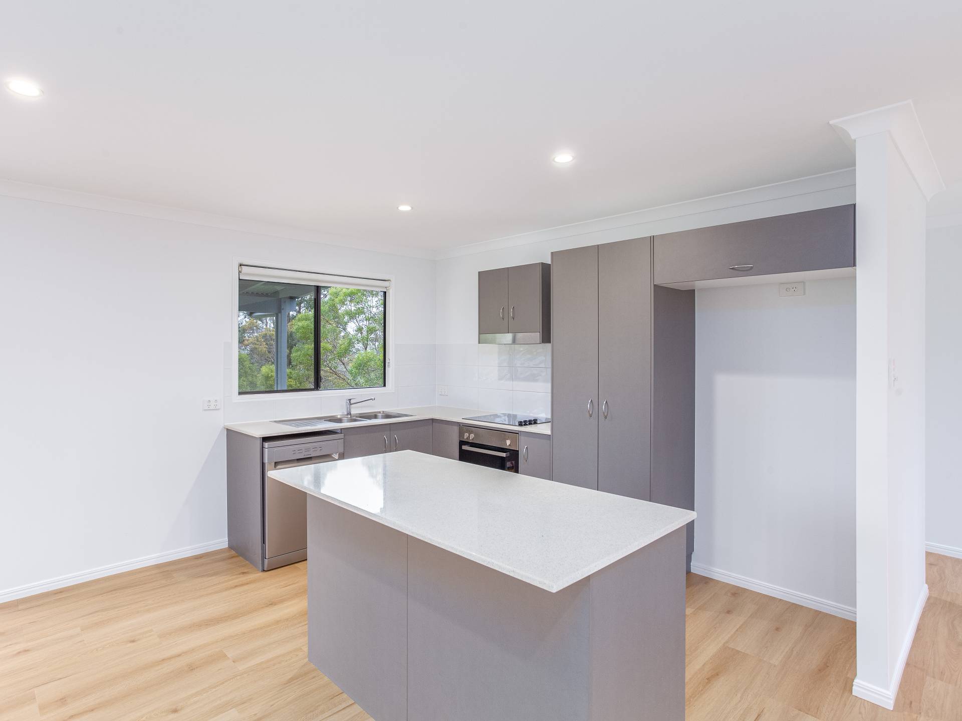 The open plan kitchen living area has wood look floors and opens to an undercover al fresco.