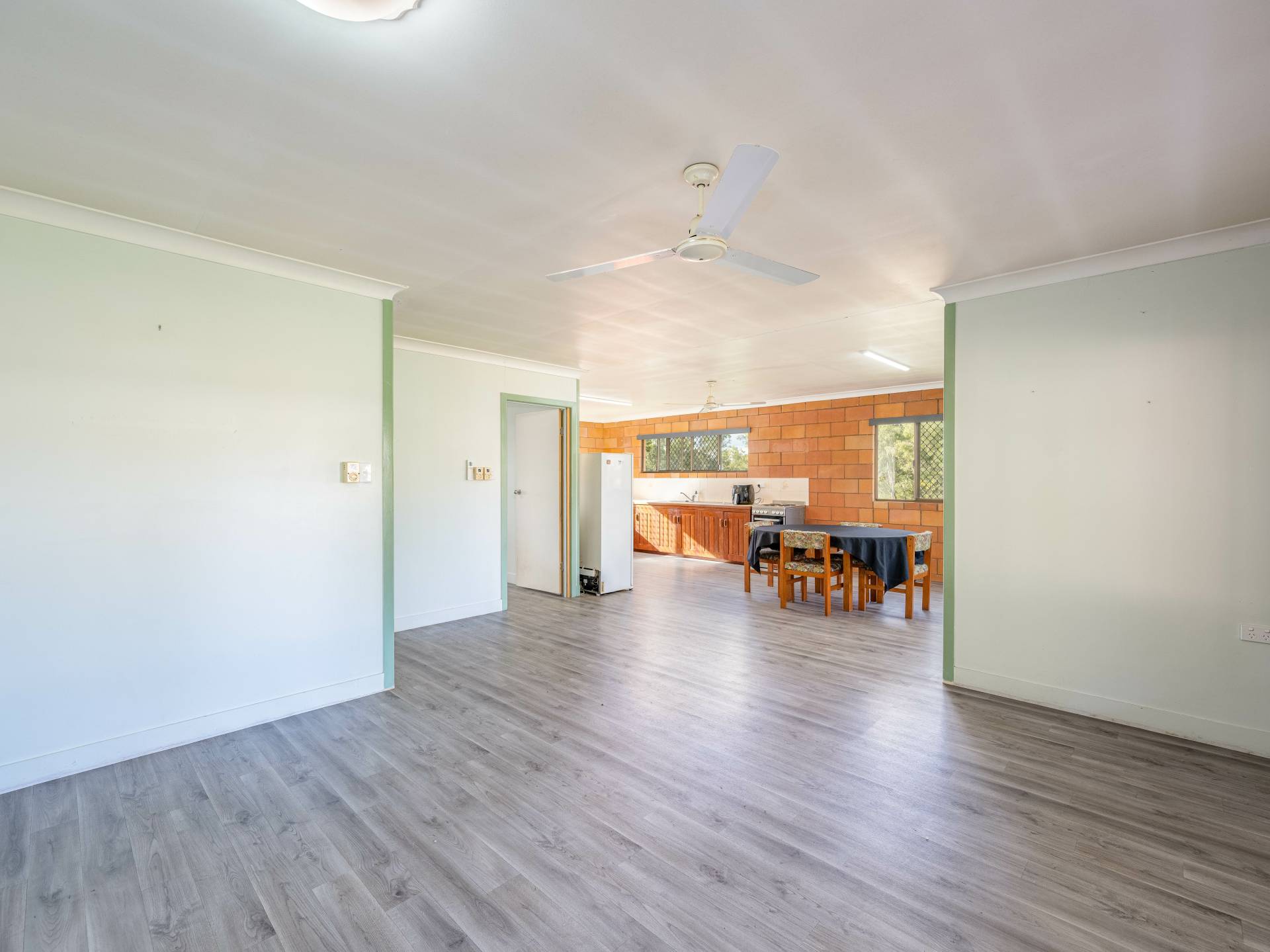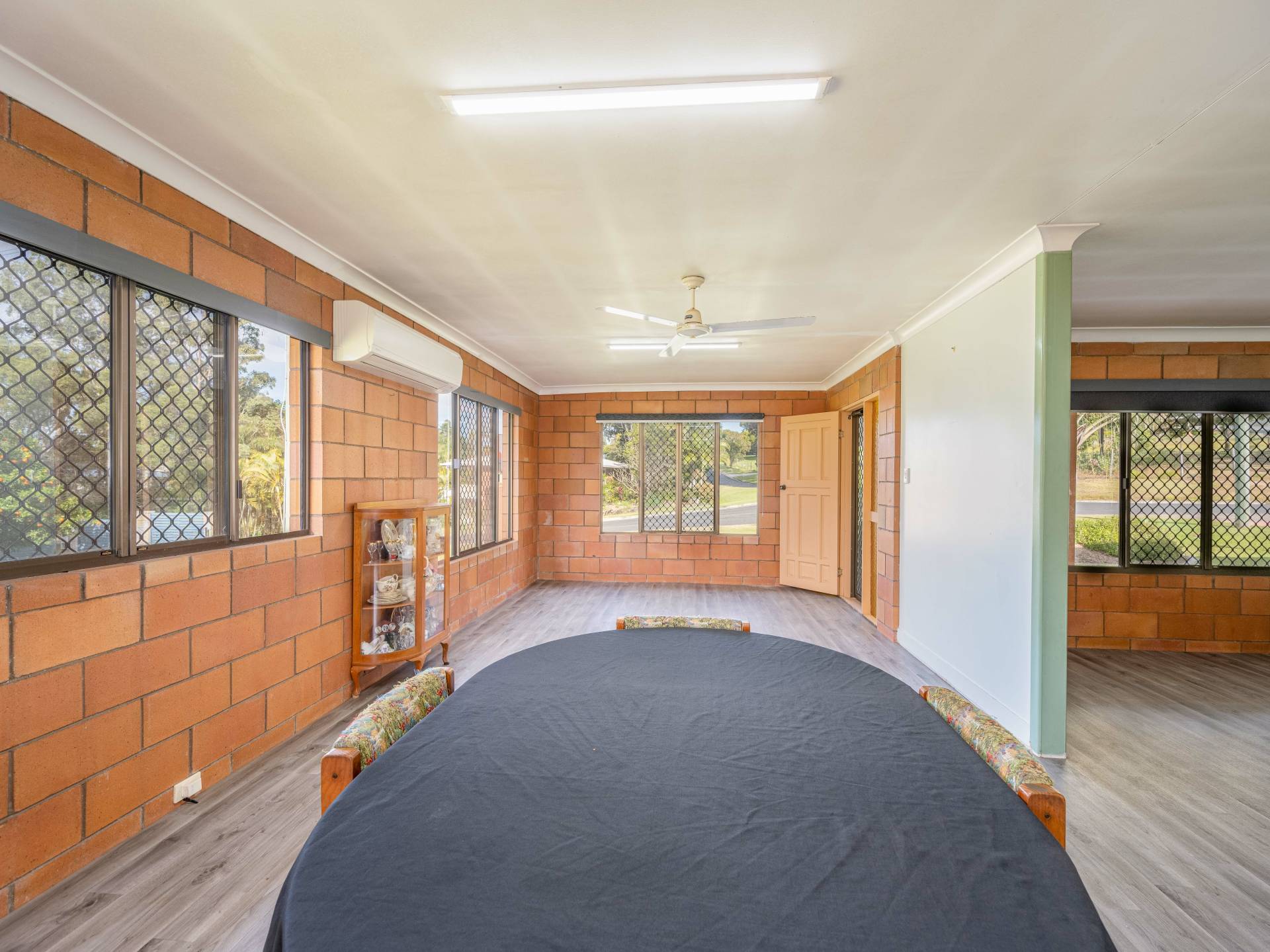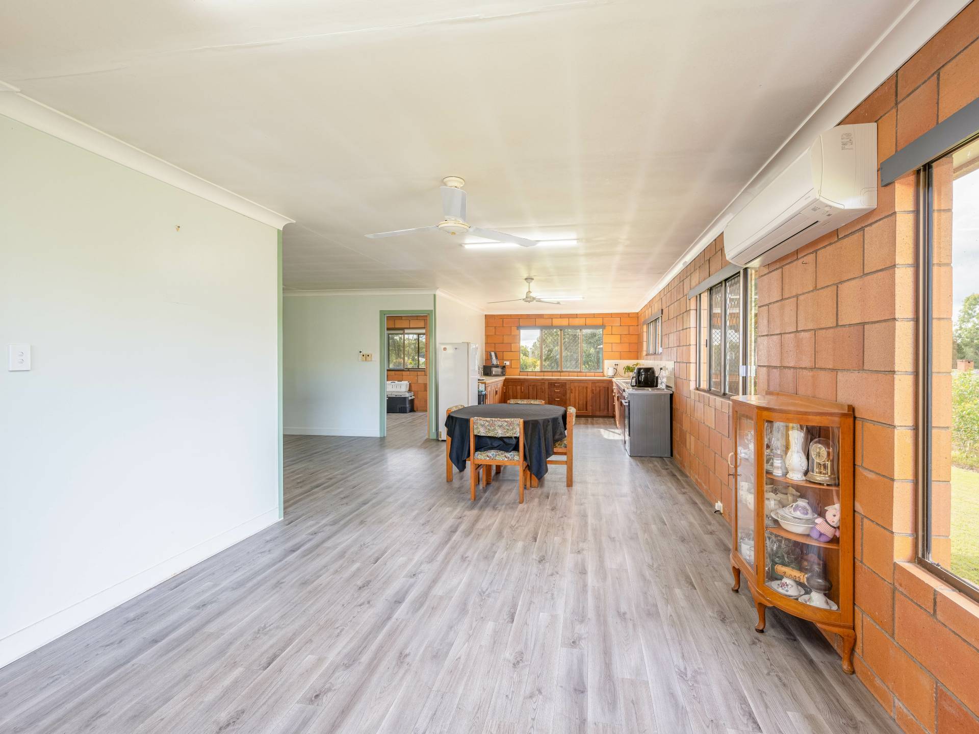 Open plan kitchen living dining area with split system air conditioner