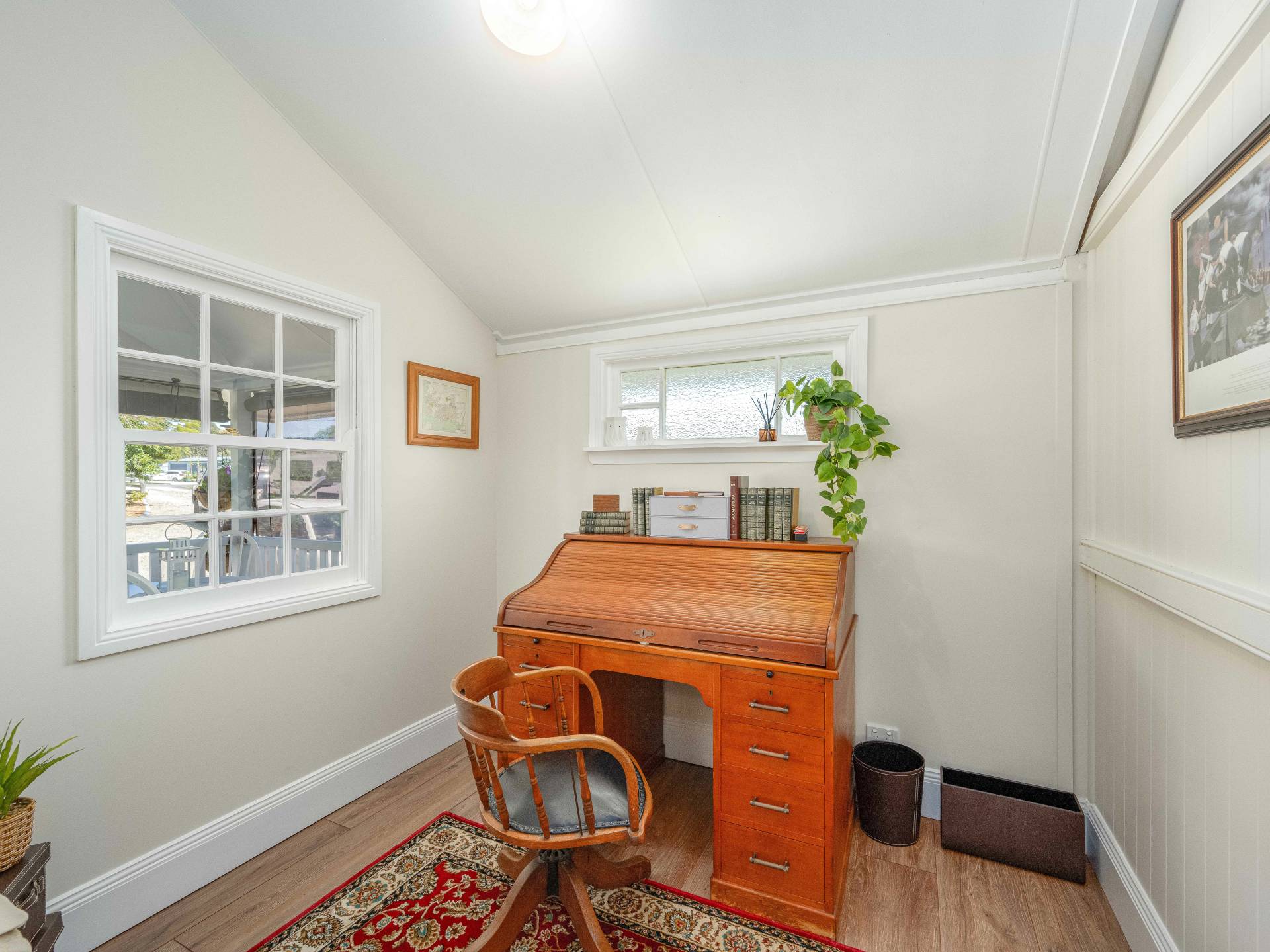 Large living area with a split system air conditioner and a wood burner fireplace with an adjoining study attached.