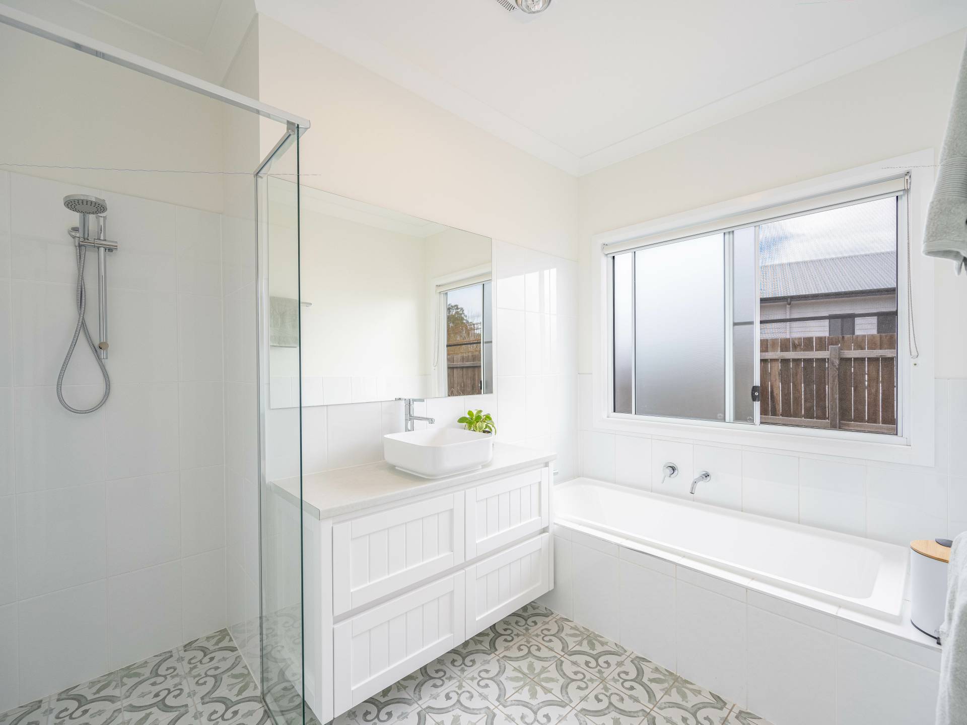 - The main bathroom contains a bath-tub, stand-alone shower, and separate toilet.