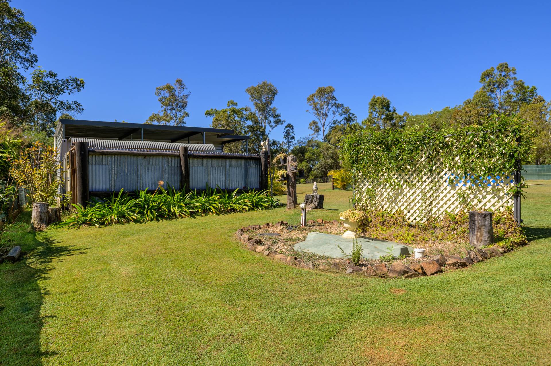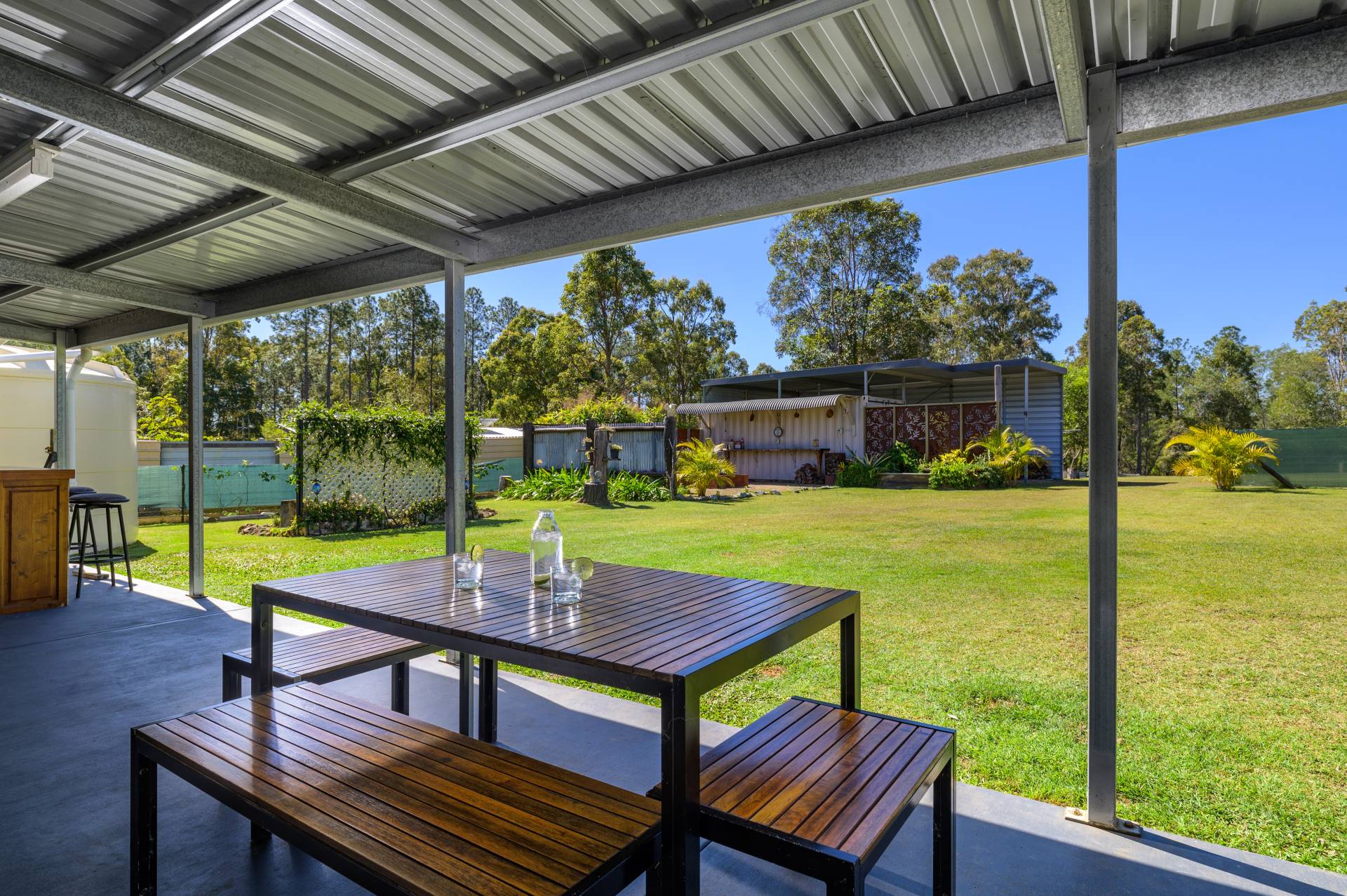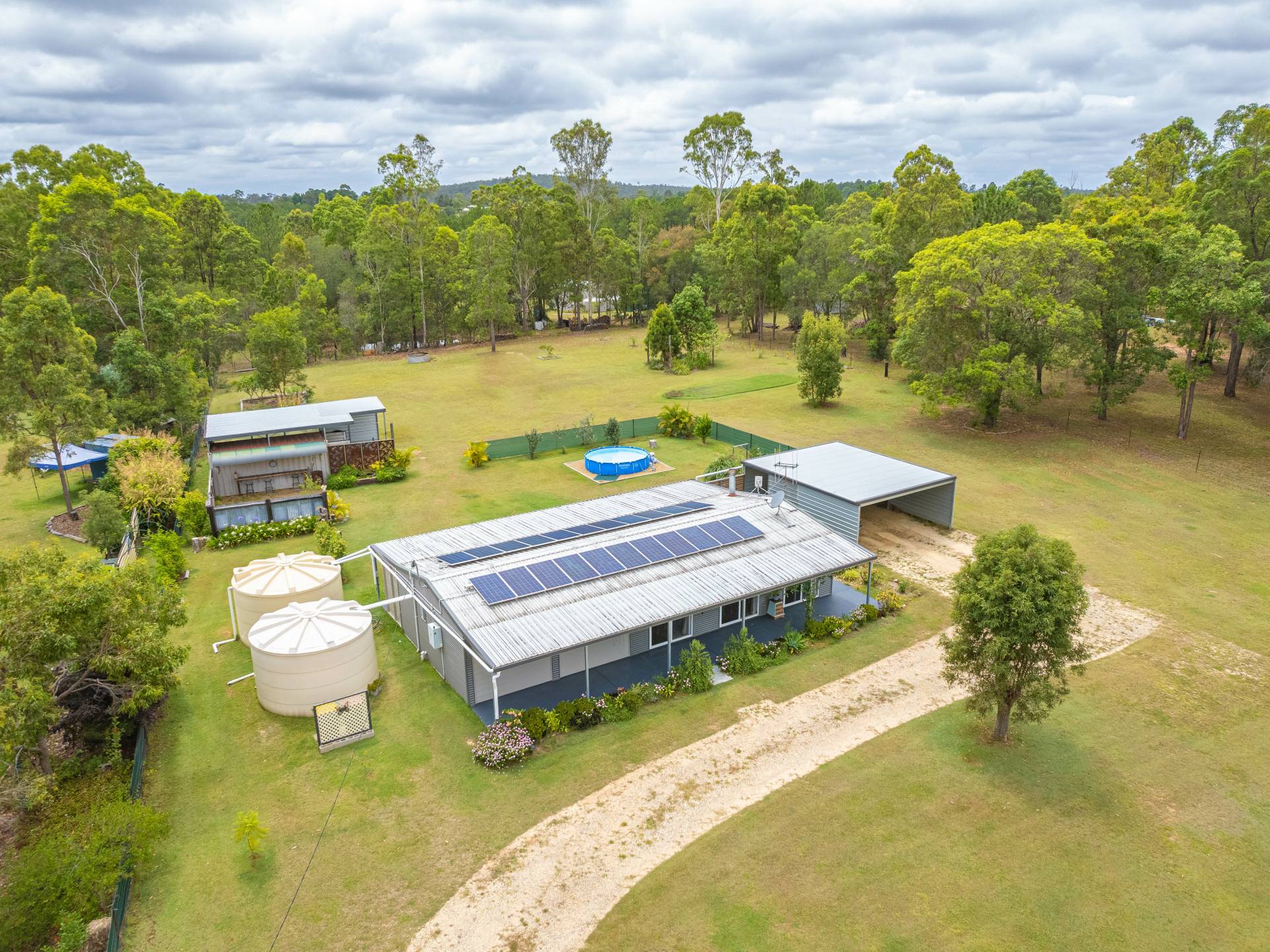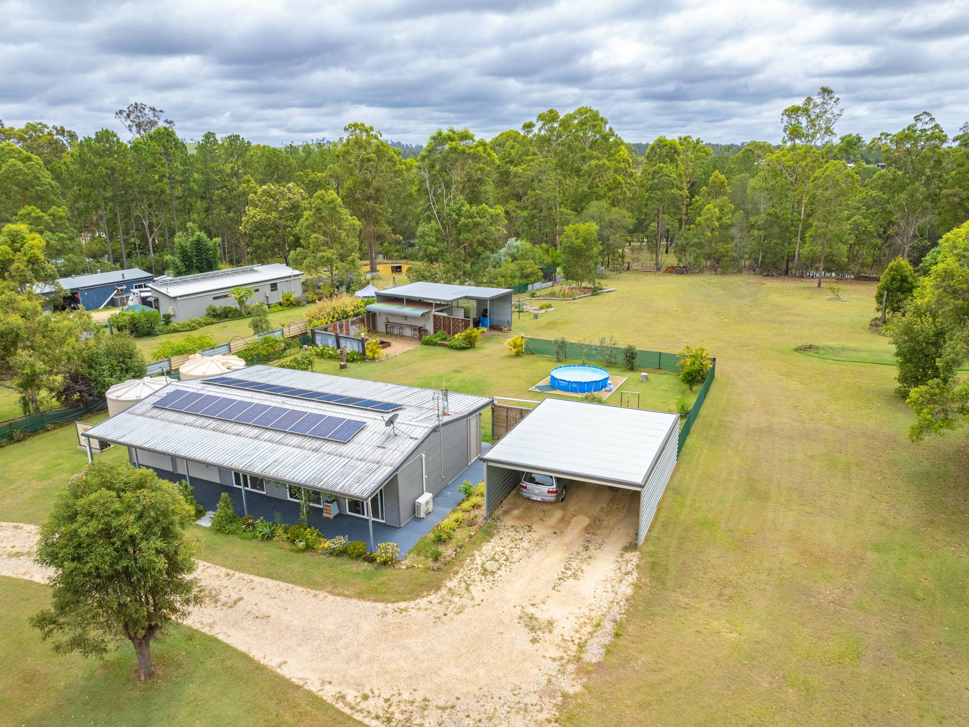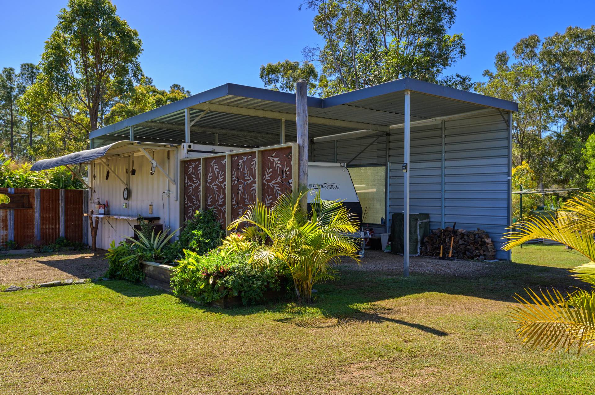 - Main shed features a 20ft watertight and lockable shipping container housed within a high clearance caravan shelter/carport