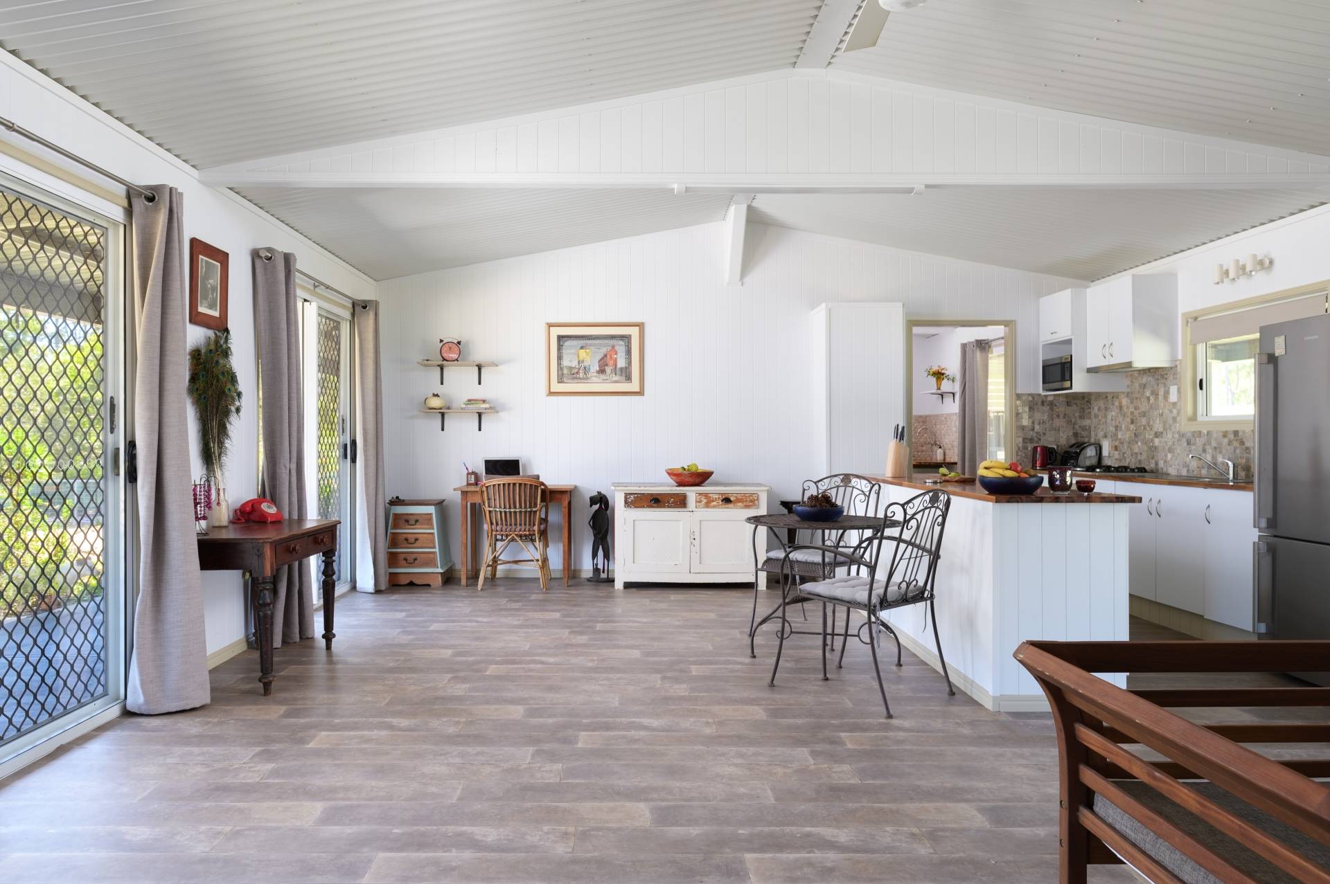 - 2 bedroom steel framed home featuring modern double insulated high raked ceilings, VJ panelling and three sets of double sliding glass doors to invite cooling coastal breezes