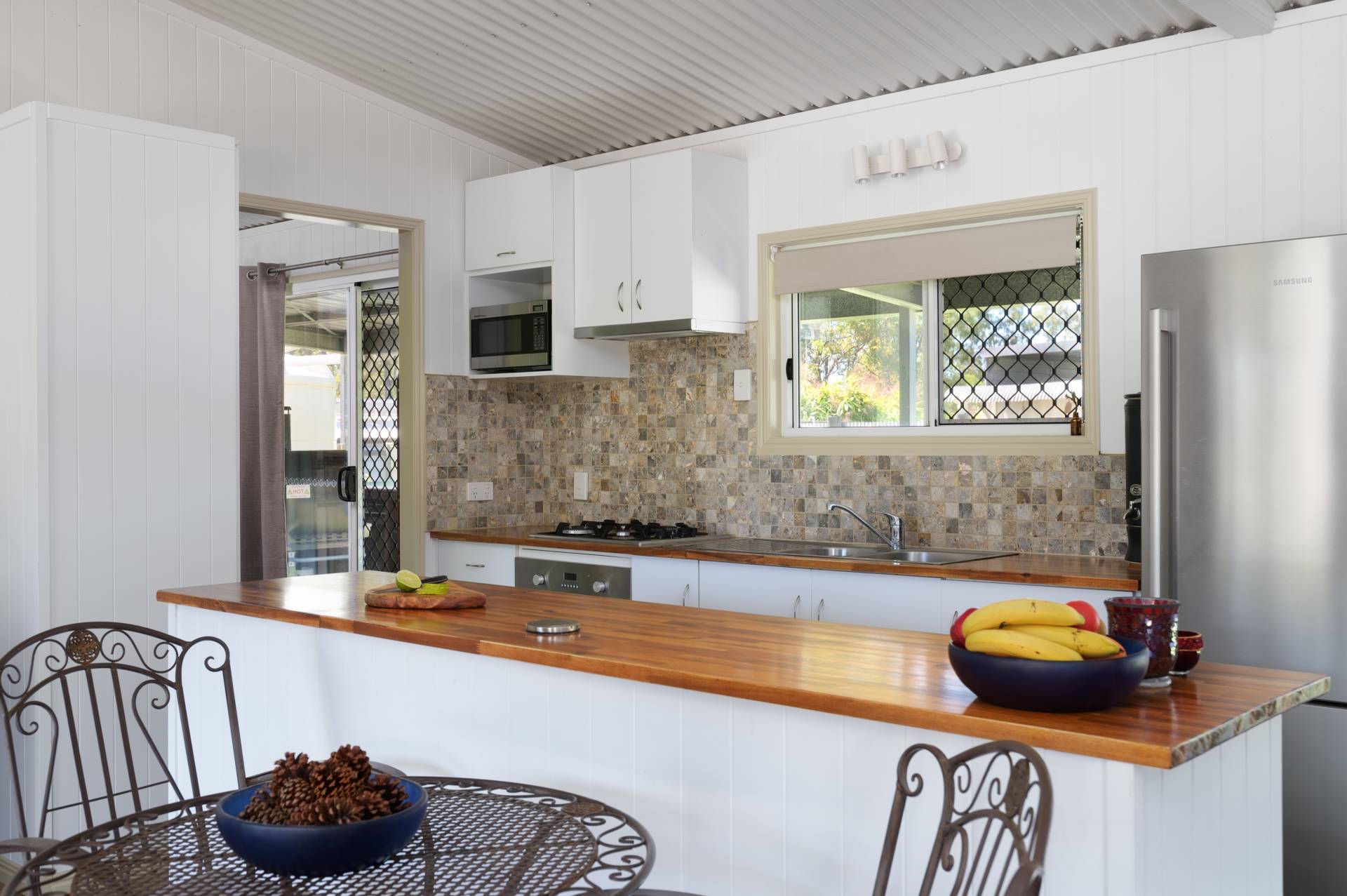 - Flowing galley style kitchen is timeless in its presentation, concealed power board is cleverly hidden in the stained timber island bench and 4 burner gas cooktop and stone tiled splashback compliment the space perfectly.