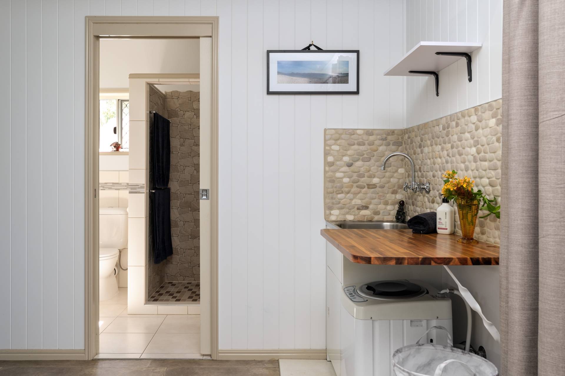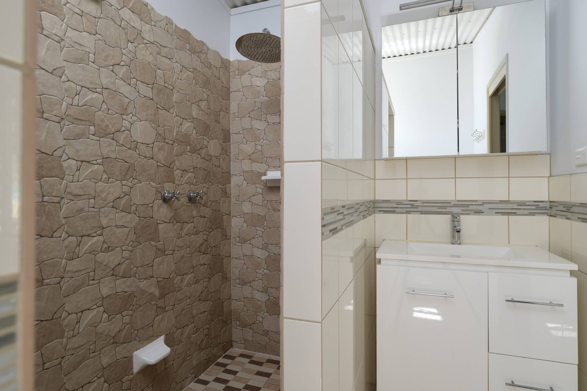 - Main bathroom gives a very strong naturalist feel in the oversize shower with stone tiles and huge shower head, separate toilet and modern vanity with feature tile finish