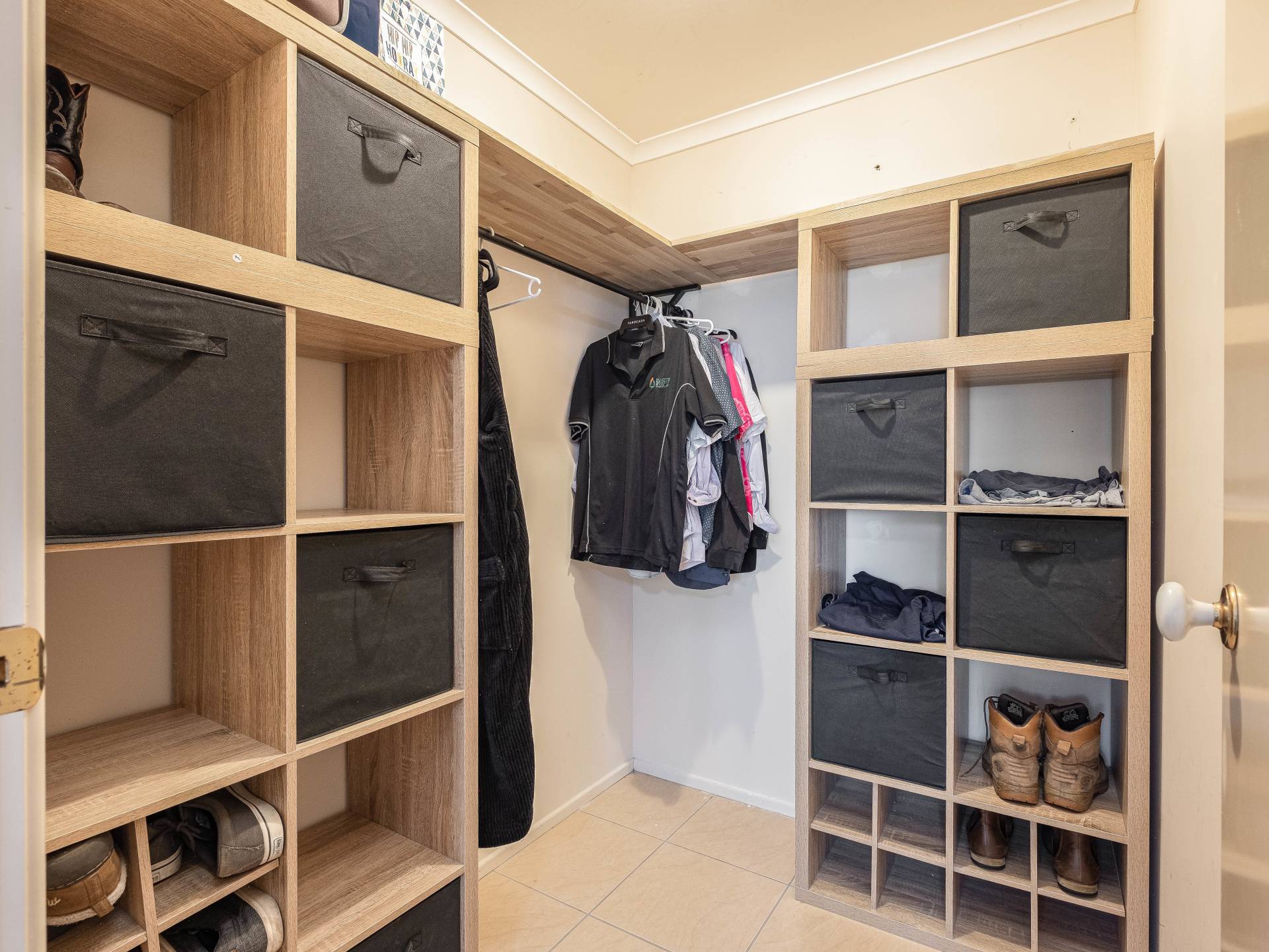 Master bedroom is carpeted with ceiling fan and huge walk in robe with built in cabinetry.