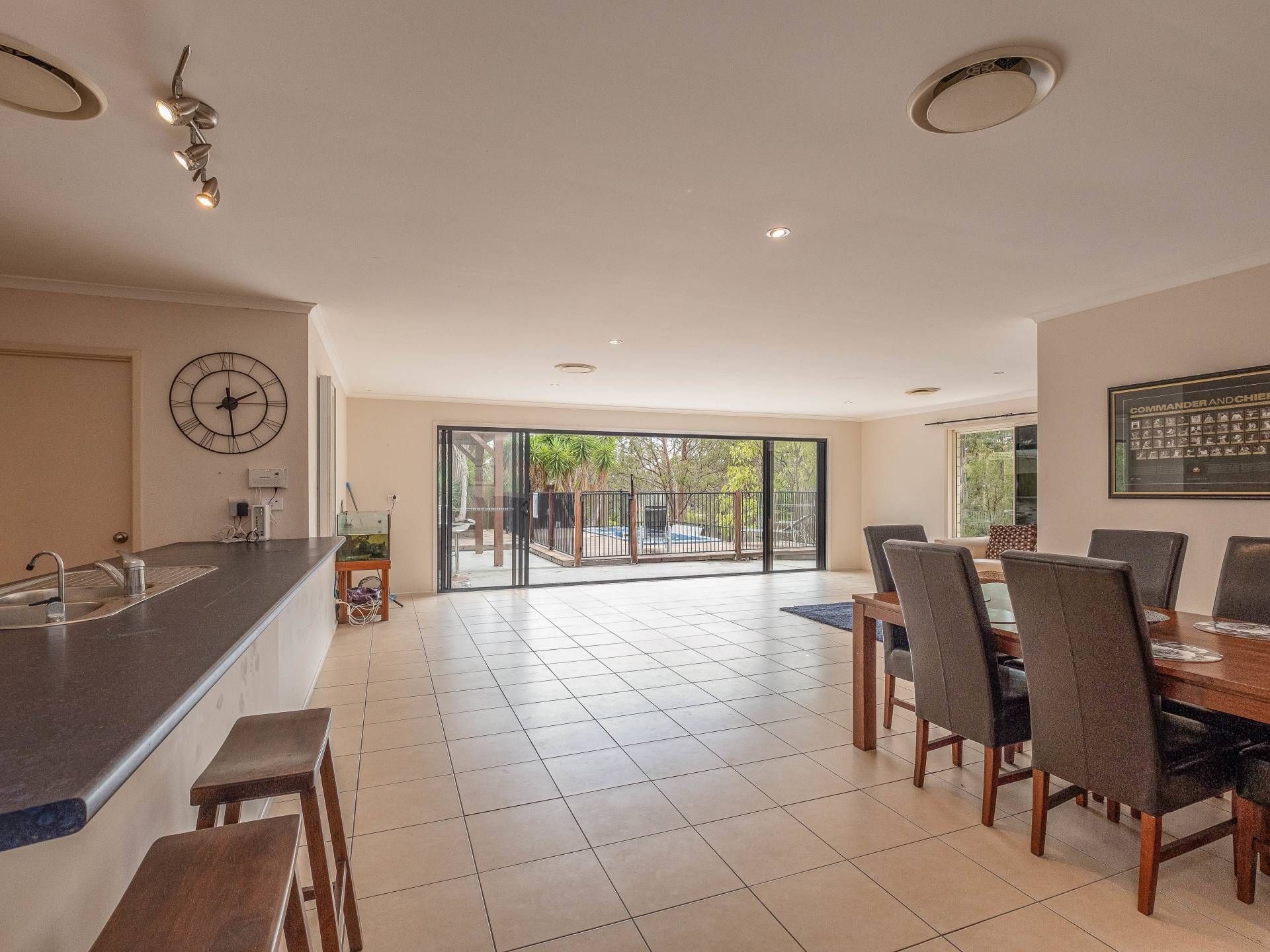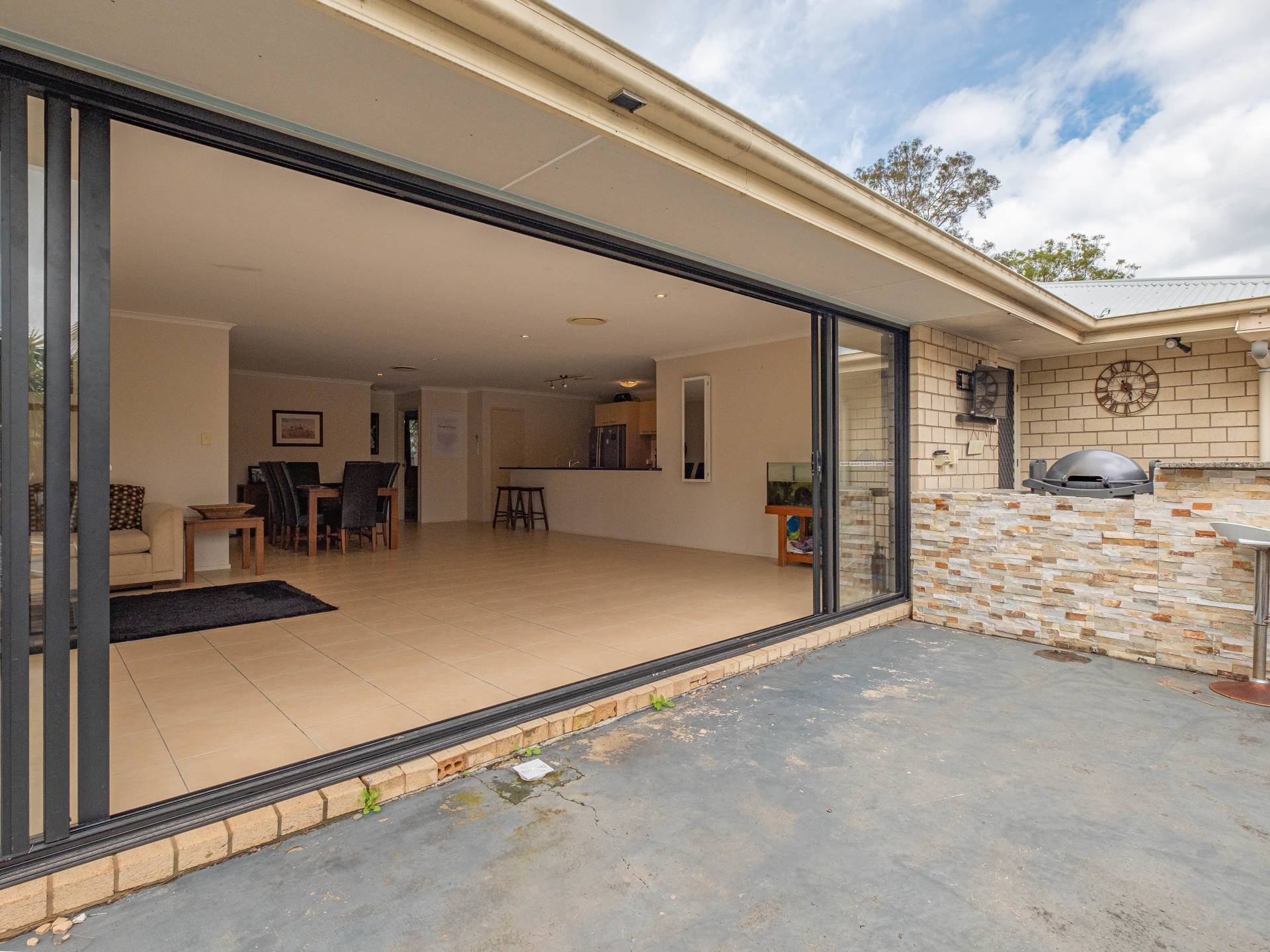 Generous open plan kitchen, living and dining area with panoramic doors opening to the outdoors.