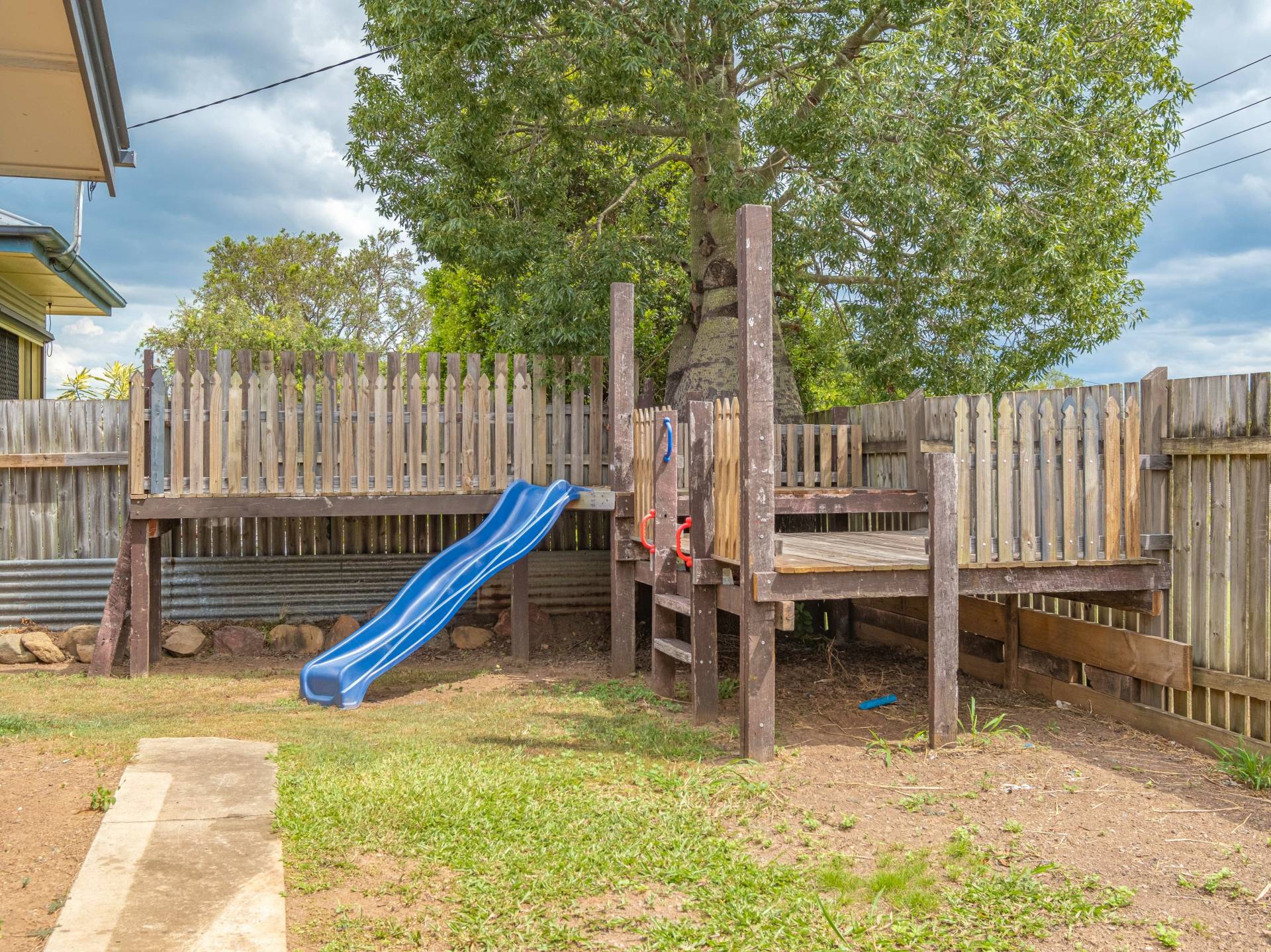 The yard is fully enclosed and has a pool and a children’s play area.  There is a detached lock up garage plus a storage shed. This property is on town water and sewerage.