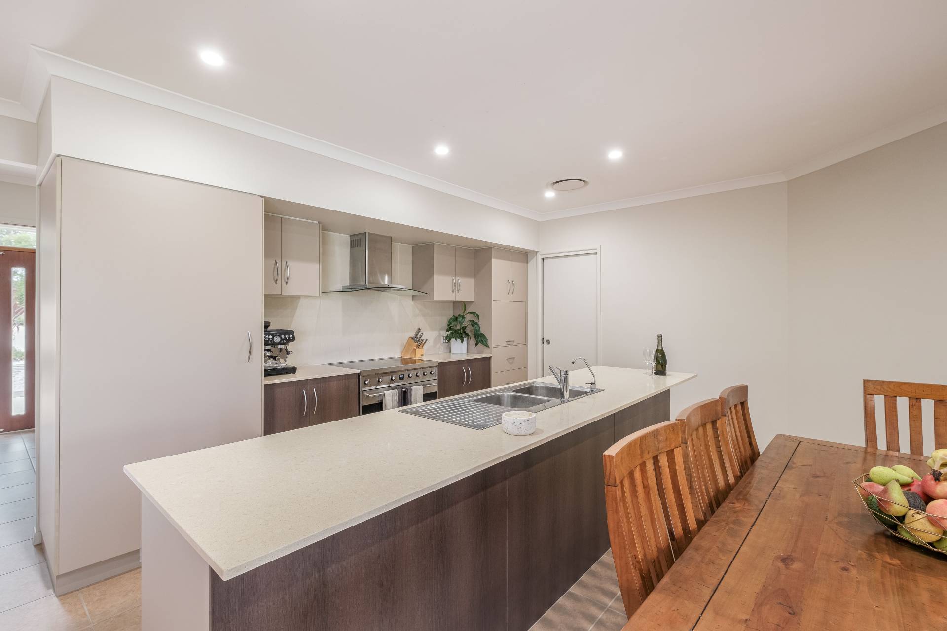 Modern kitchen, with large integrated fridge, large walk-in pantry, breakfast bar and dishwasher.