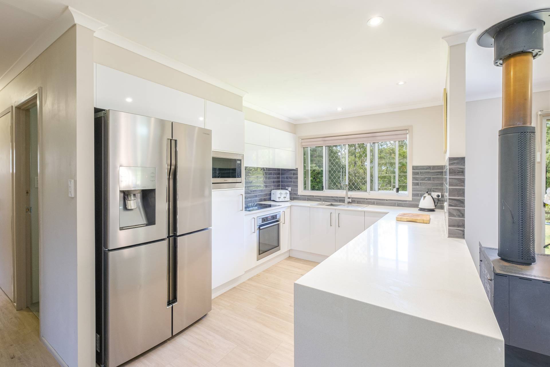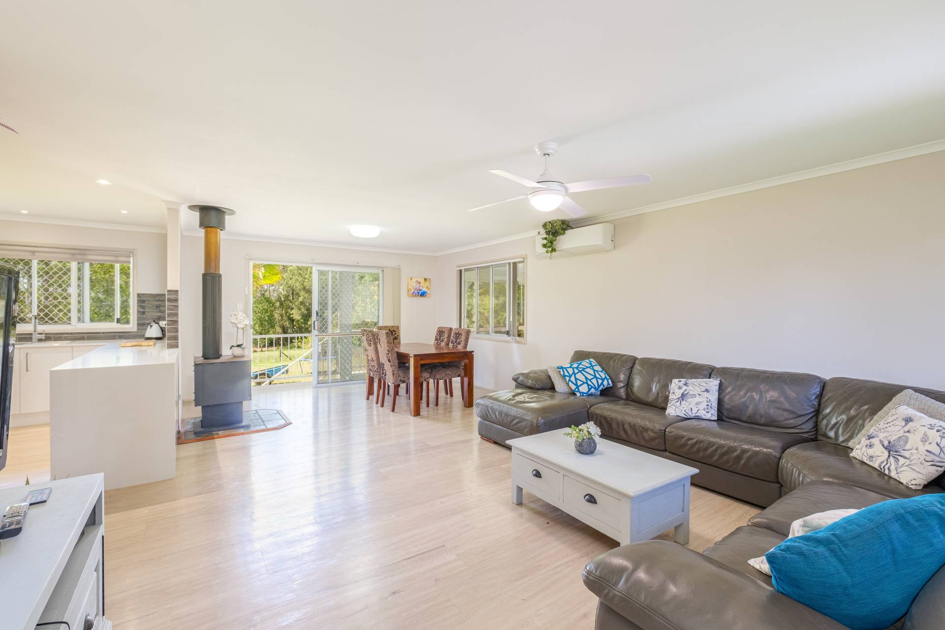 This 3 bedroom home, plus study, has been renovated with a fresh modern feel. The kitchen has stone benchtops, lots of storage and a breakfast bar.  The open plan living area is large and has both a wood burner stove and a split system air conditioner. There is a large lounge room located upstairs as well.