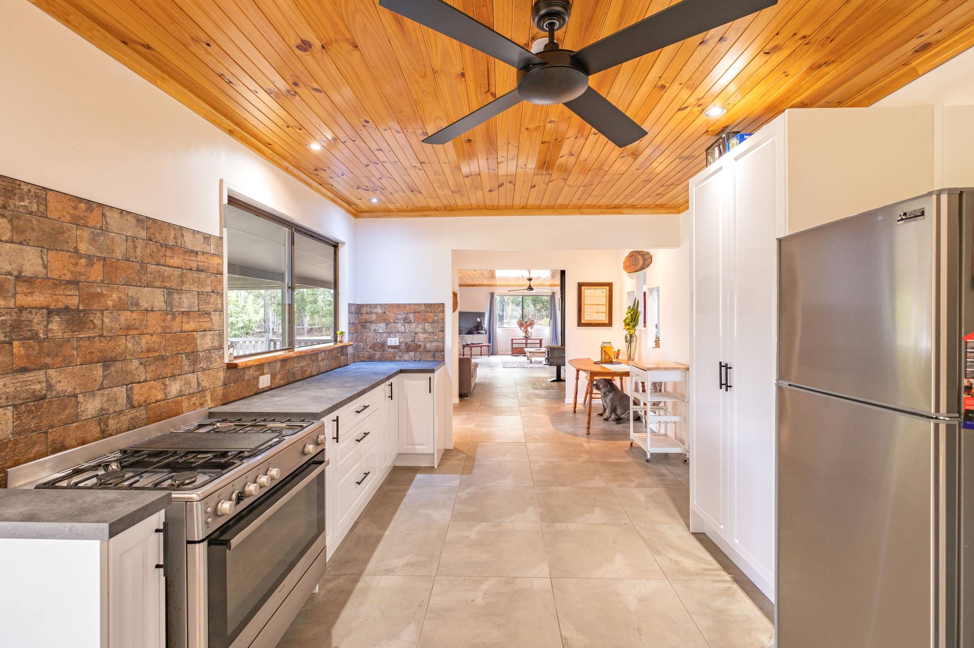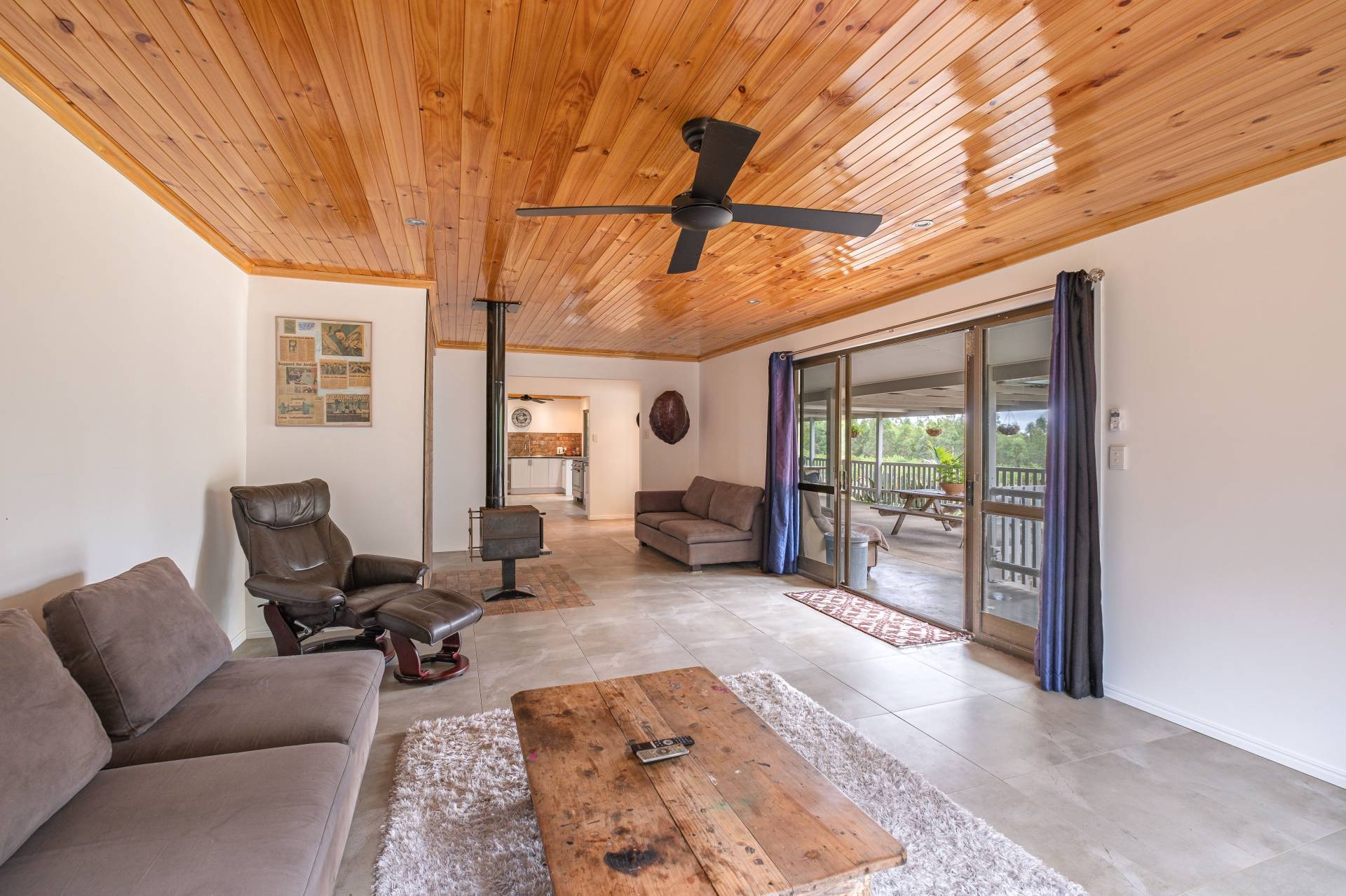 Kitchen and living separate Living area ceiling lined with hardwood with an additional wood burner stove.