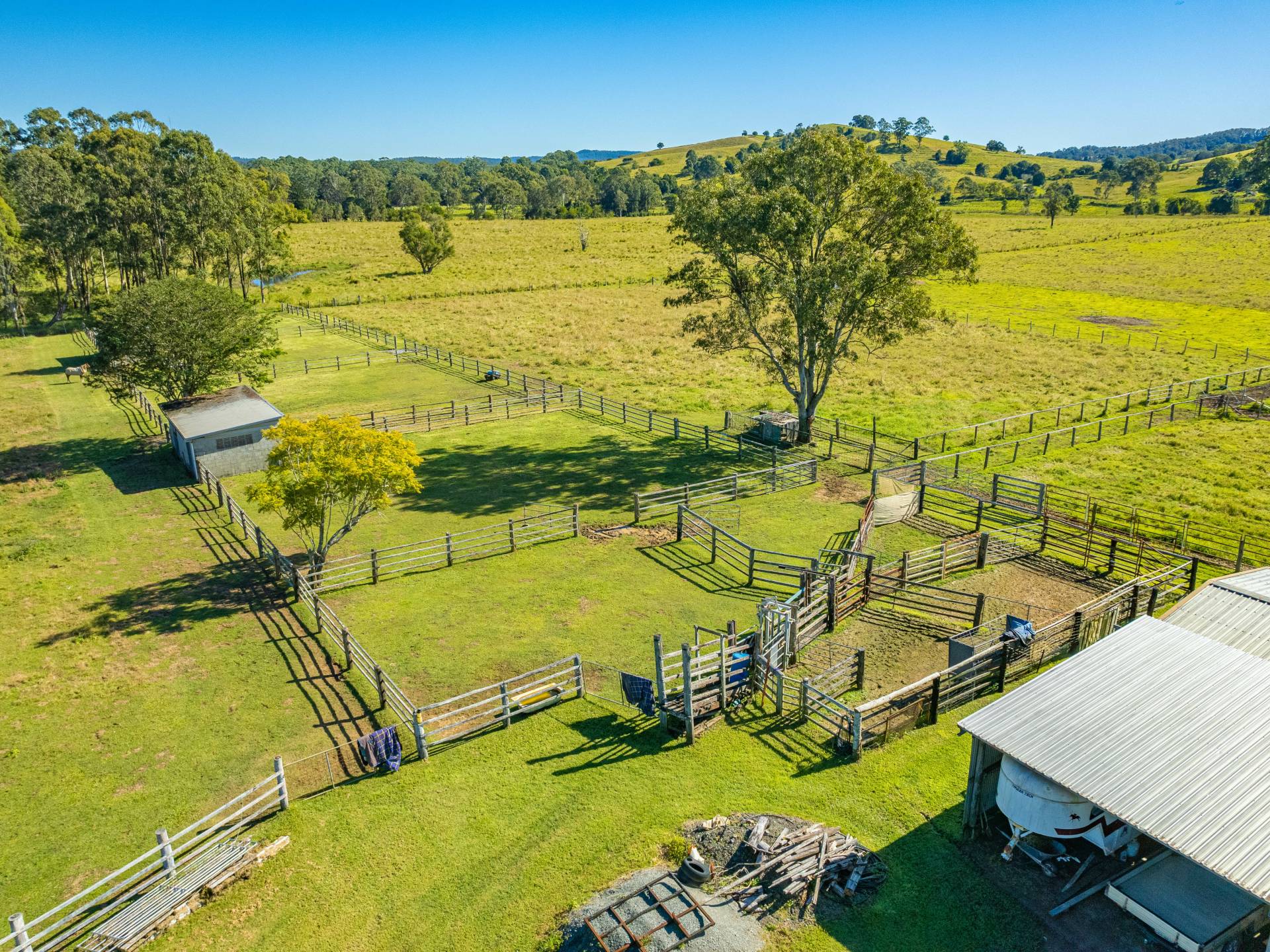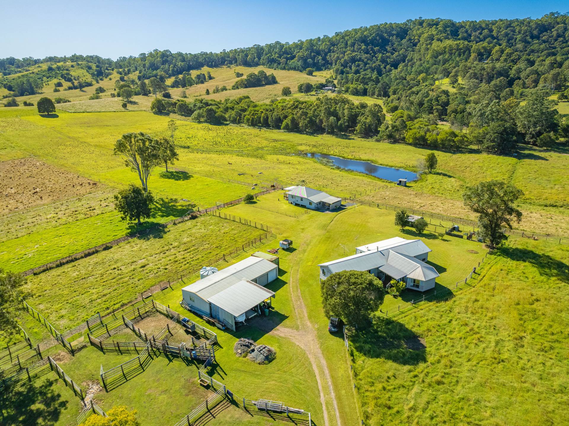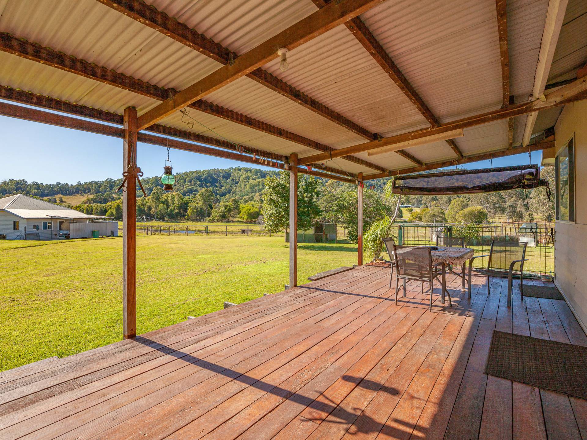 The main weatherboard home has a lovely country feel, featuring 4 large bedrooms with high ceilings, exposed beams and timber floors, a timber kitchen, a wood heater in the main lounge area, and a front and rear porch. The generous master bedroom with ensuite and walk-in robe provides the perfect retreat with expansive views across the property. The north-facing rear deck of the main living area is the perfect place to stop, sit and survey the property and keep an eye on your all livestock. The main home is located to give you virtually uninterrupted views of your entire property, to keep an eye on all your livestock within the comfort of the main home.